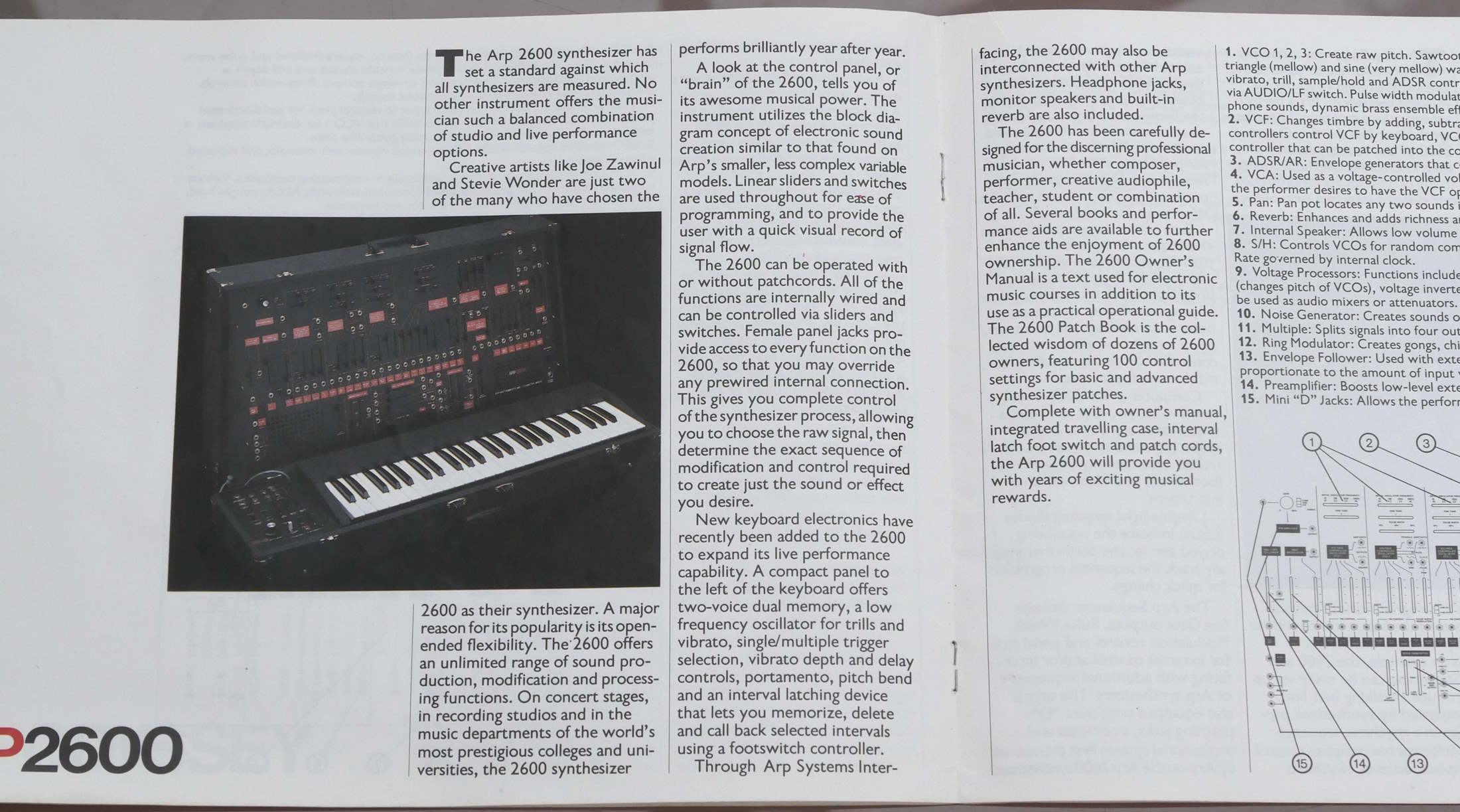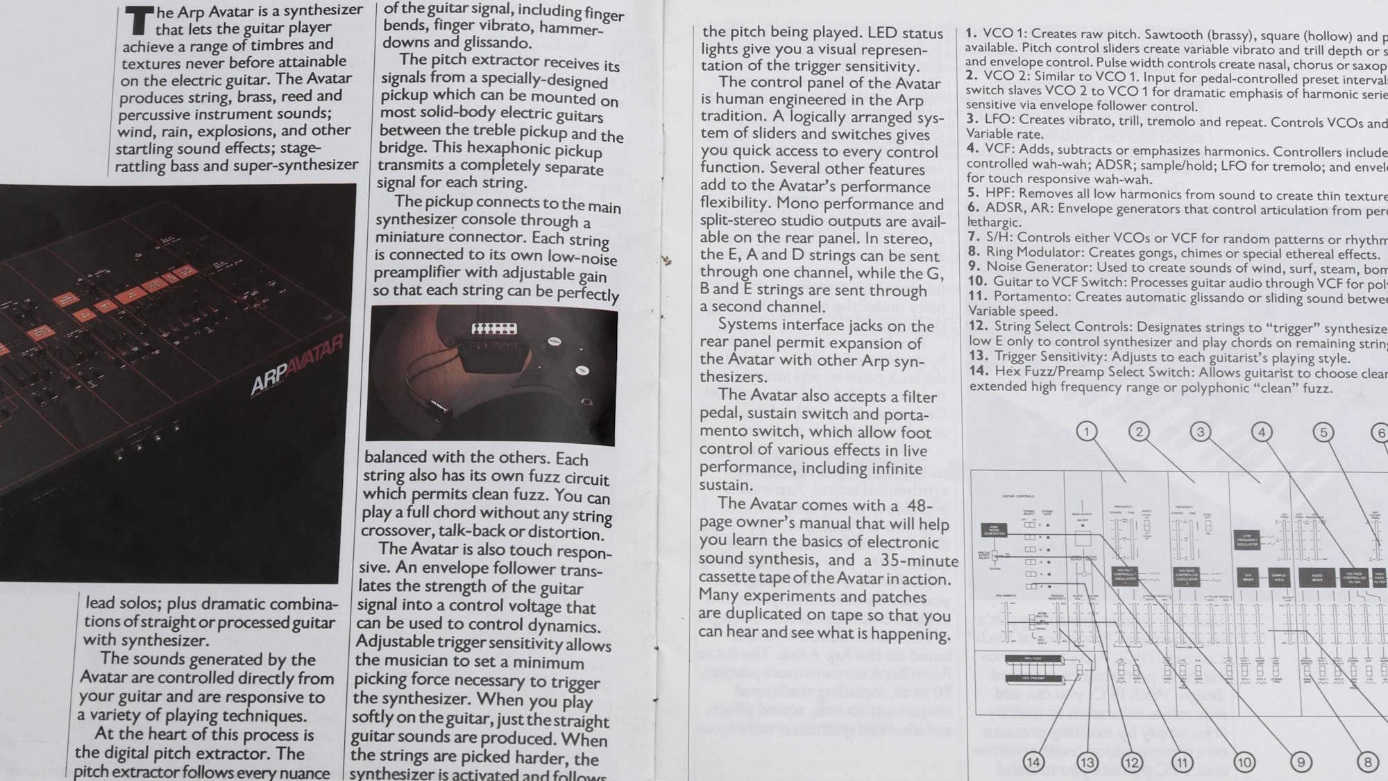 Classic ARP brochure covering Avatar, Axxe, Odyssey, 2600, Sequencer, Omni-2 and Pro/DGX. Two sides for each instrument, with a colour photo and good description and diagram. |