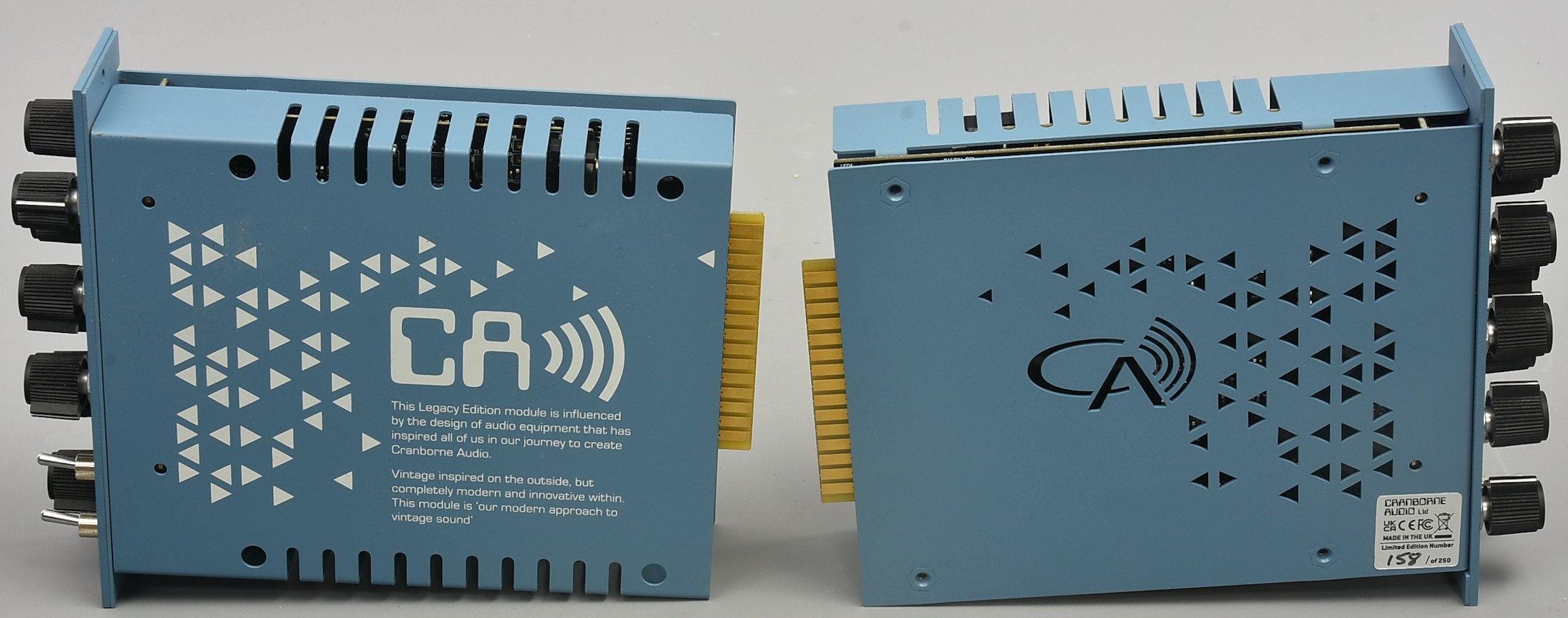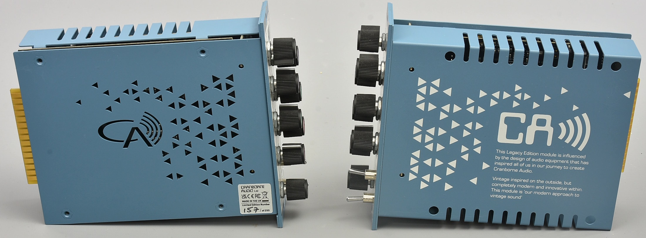 A pair of these Legacy Edition parametric EQs for the 500 series: 157 and 158 out of 250 total limited edition production. They use Camborne Audio's trademarked Harmonic EQ - using analogue harmonic saturation to cut and boost frequencies. These originally came in a little flightcase, which the seller has mislaid. If it is found, we'll collect it and include it. Packing 6GBP. |