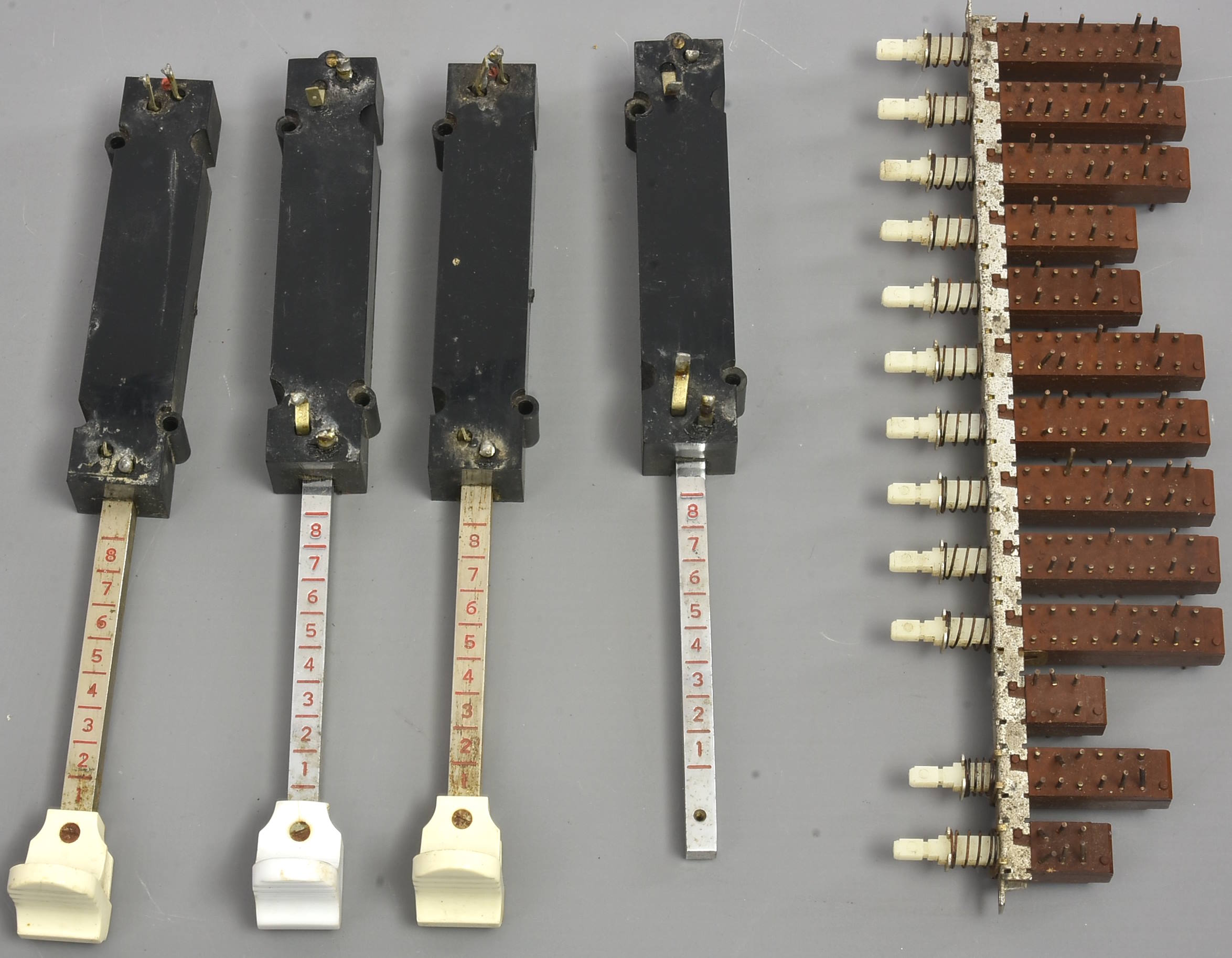 From an unknown vintage Continental organ, four drawbars (three with tips) and a long switch strip. All AS SEEN. Packing 3GBP. |