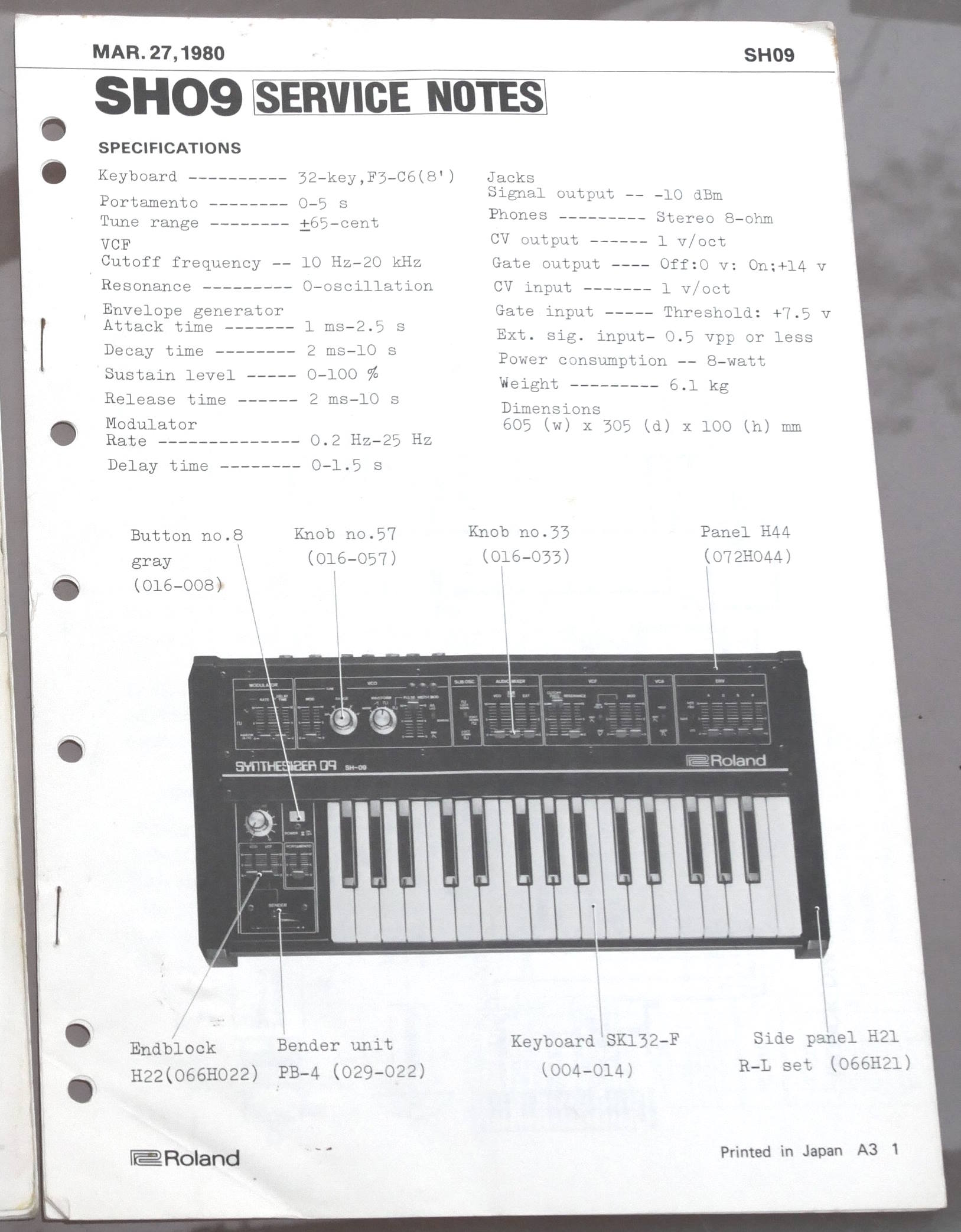 Original user manual and service notes for the SH-09. The user manual is in 6/10 cosmetic condition - solid and complete, but with some rust on the staples, a small tear at the bottom of the cover's spine and notes in pen around all the sample sound settings - and user settings filled in. The service notes are still stapled, with all the foldouts excellent - at least very good cosmetically if not near mint. |