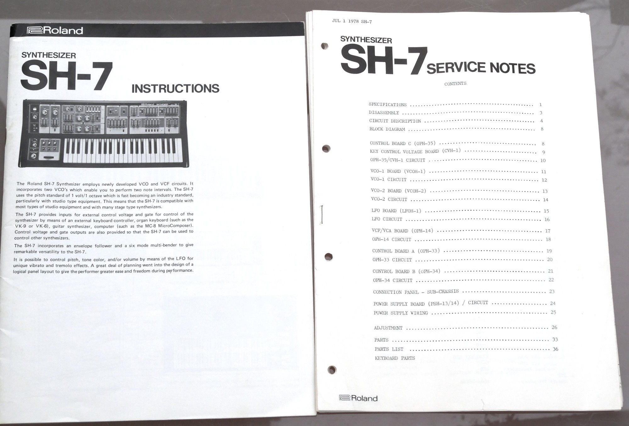 Excellent condition user manual and service notes for the SH-7. The user manual (called 'Instructions') is 40 pages, printed on high quality glossy paper, and is near mint. The service notes, still stapled, are also 40pp, with a great number of fold-out pages. There is a slight bend to the bottom left of the first few pages, but I think this counts as near mint too. The foldouts are immaculate. |