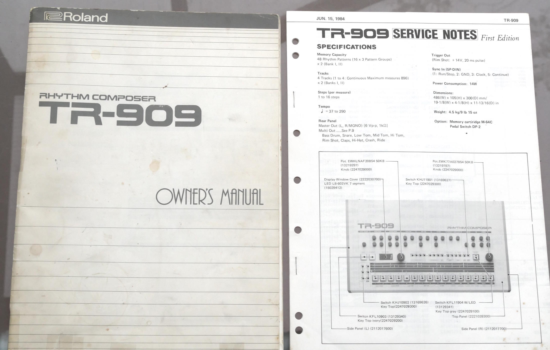 Original user manual and service notes for the TR-909. The user manual is very solid and complete. It has had minor little repairs done extremely well. No staples but no sign of rust where they were. The cover is grubby, and the whole manual is probably 6.5 / 10 cosmetically. The service notes are very good, with massive foldouts (often in colour) looking immaculate. It is still stapled. |