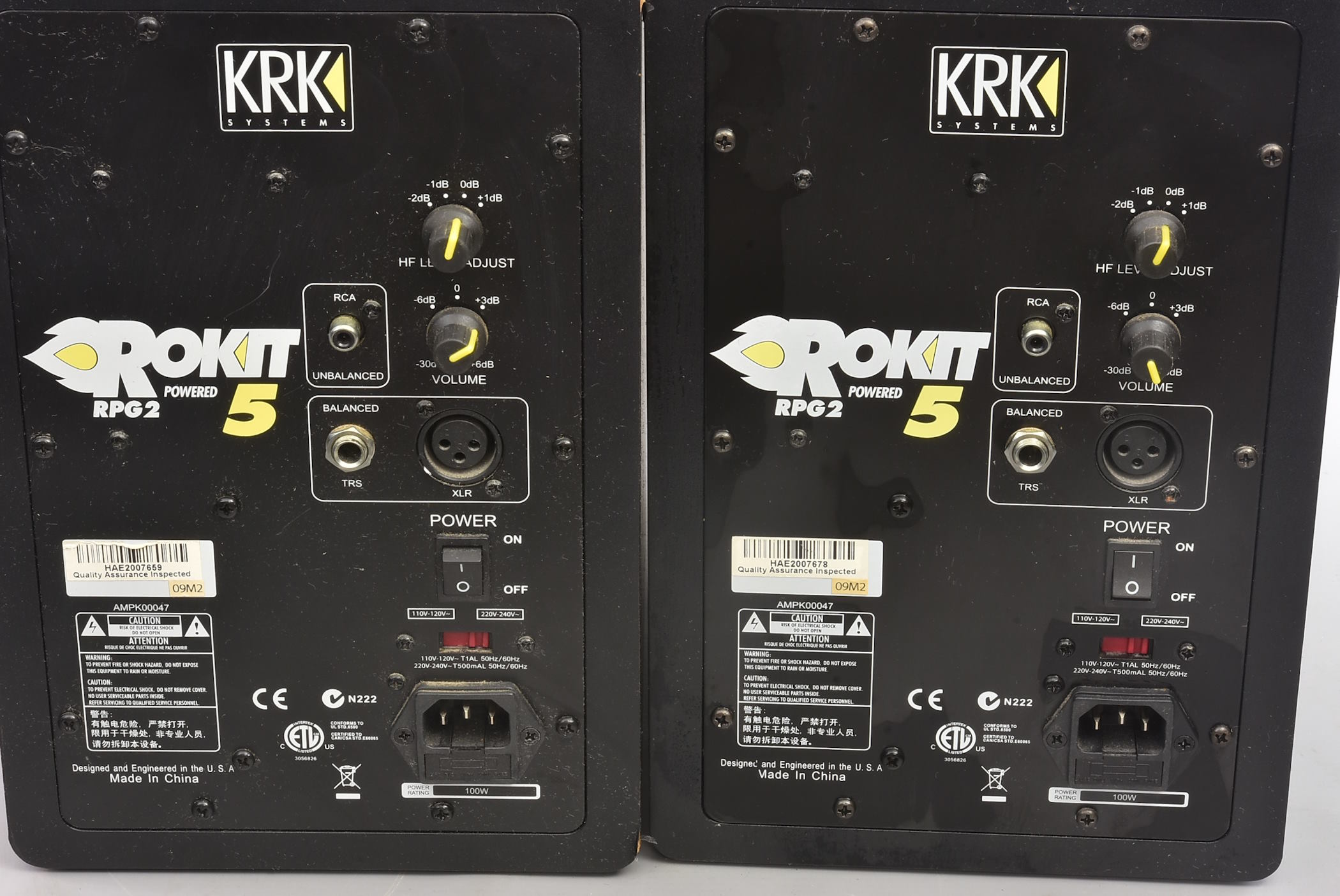 These KRK Rokit powered monitors work but have crackle. Exactly as heard in the following thread, so perhaps re-capping and cleaning goop will solve the issue.