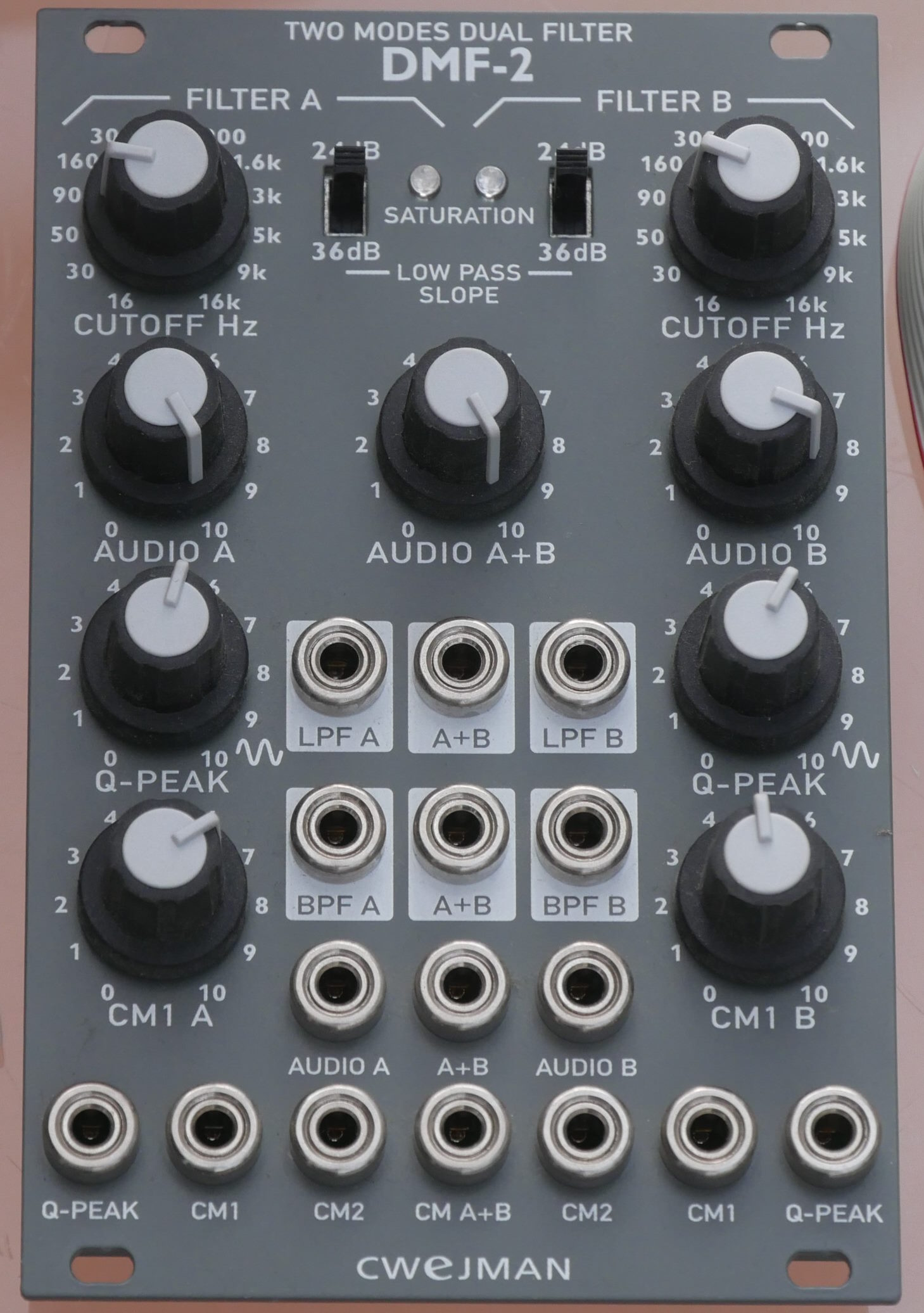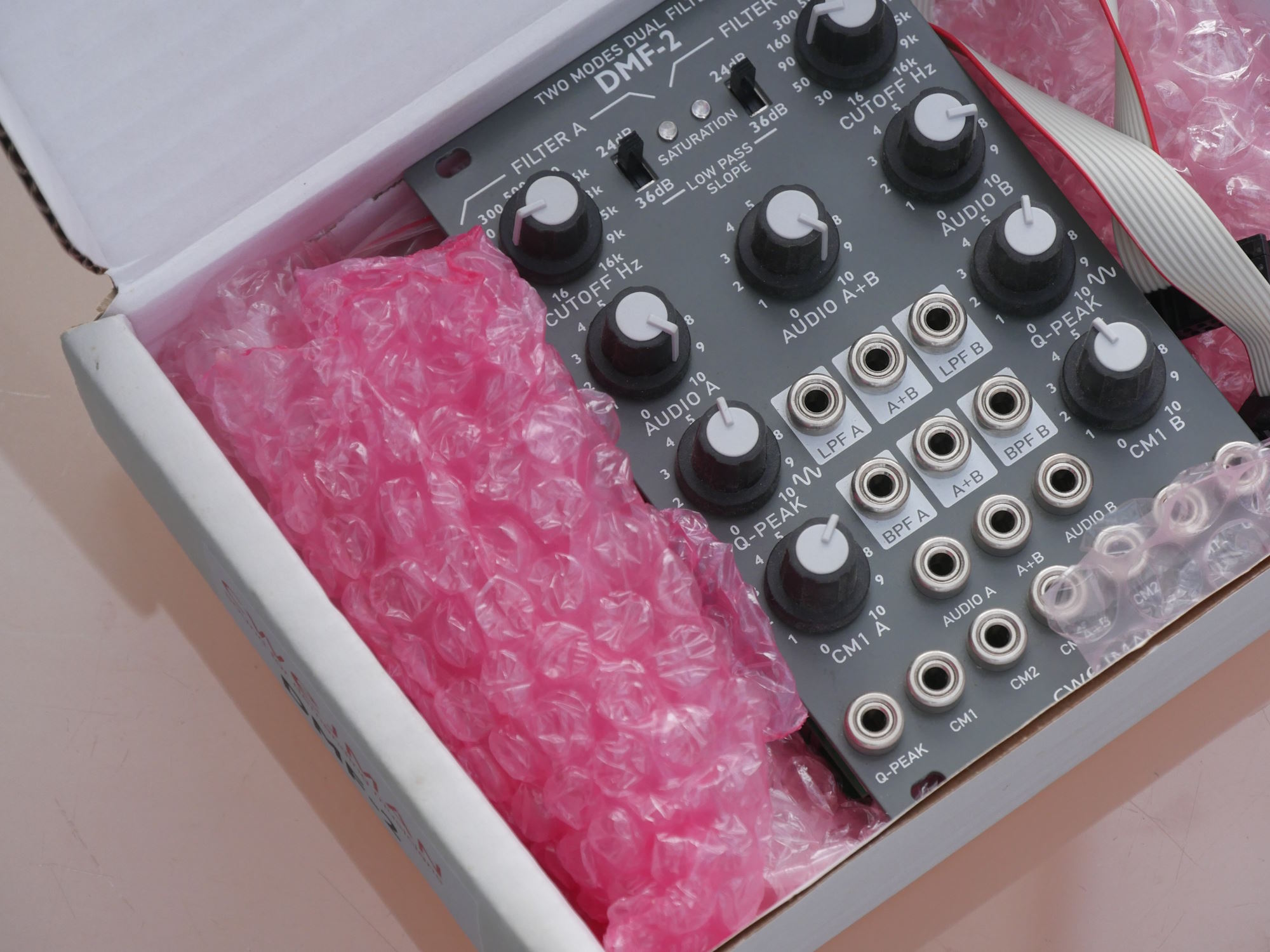 One of very many items from Calum Hunter's superb home studio. Boxed, looking unused, Cwejman's DMF-2 Two Modes Dual Filter with ribbon cable & 6 rack screws. We've said near-mint as we saw in the pic that there is the tiniest little nick on one edge (possibly a manufacturing flaw) - see if you can spot it! We'll cover the box with card: 3GBP |