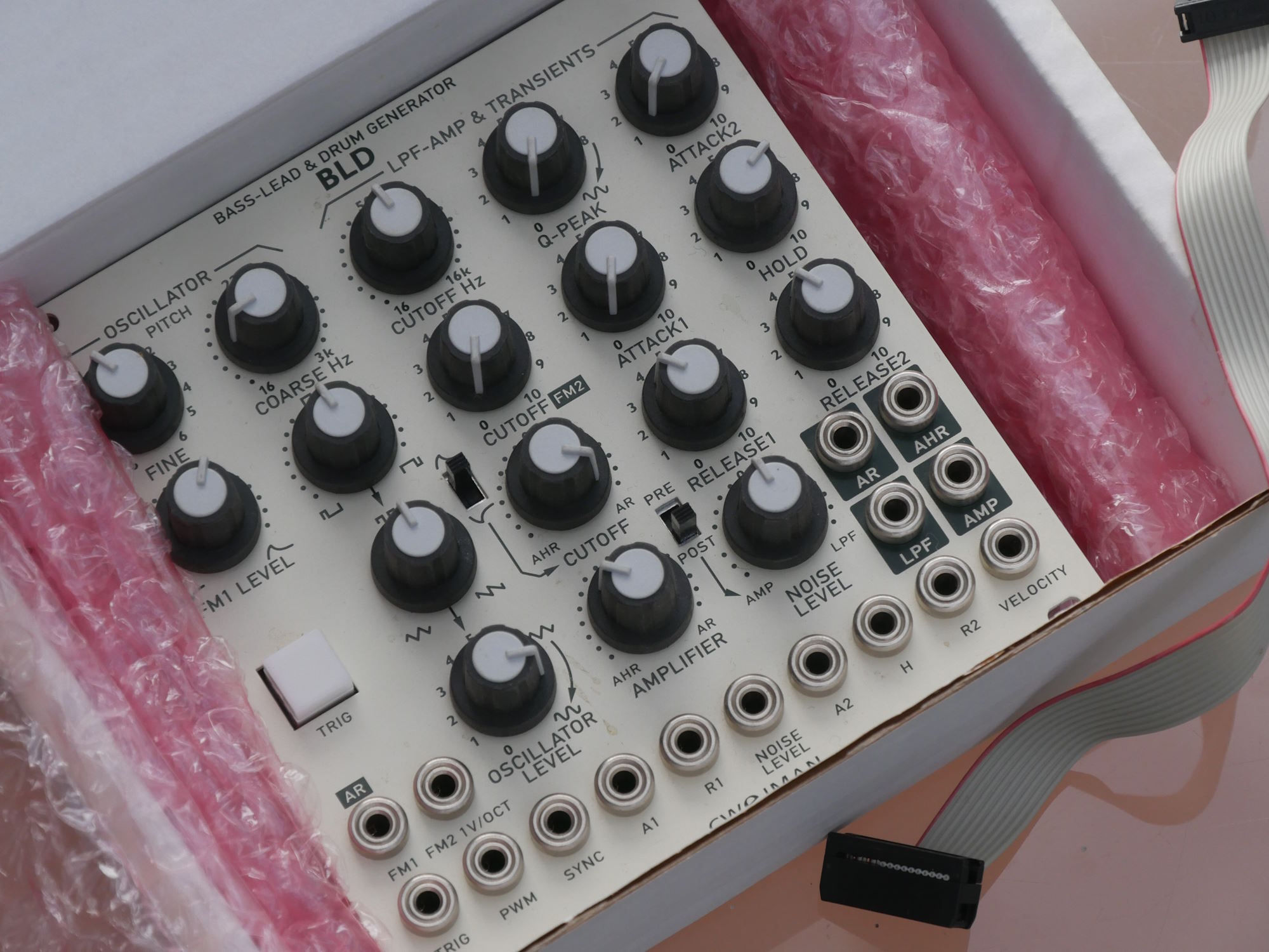 One of very many items from Calum Hunter's superb home studio. Boxed, looking unused, Cwejman's BLD Bass-Lead & Drum Generator with ribbon cable. We've said near-mint as there are a couple of little dirty marks on the faceplate. We'll cover the box with card: 3GBP |