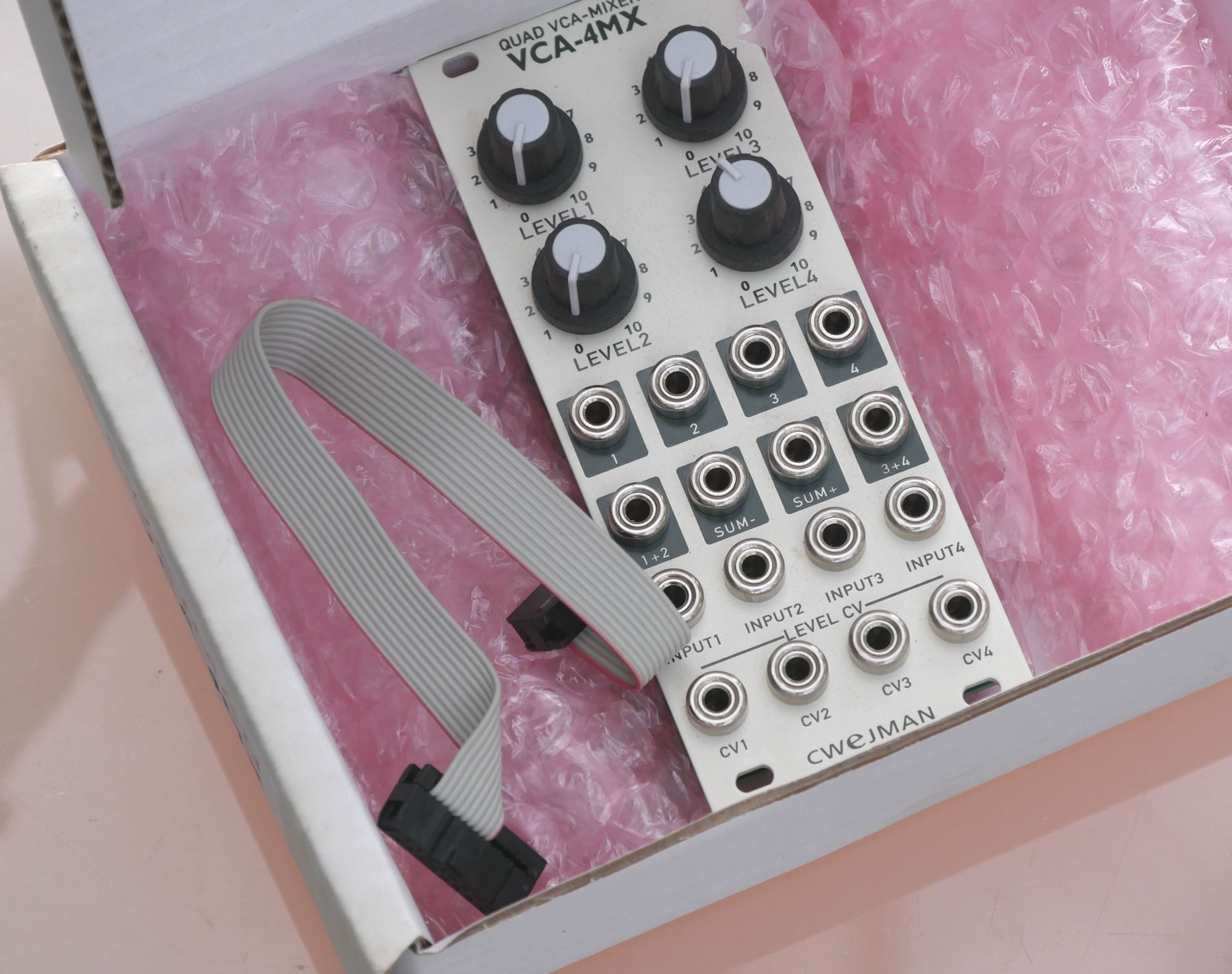 One of very many items from Calum Hunter's superb home studio. Boxed, looking unused, Cwejman's VCA-4MX Quad VCA-Mixer with ribbon cable. We'll cover the box with card: 3GBP |