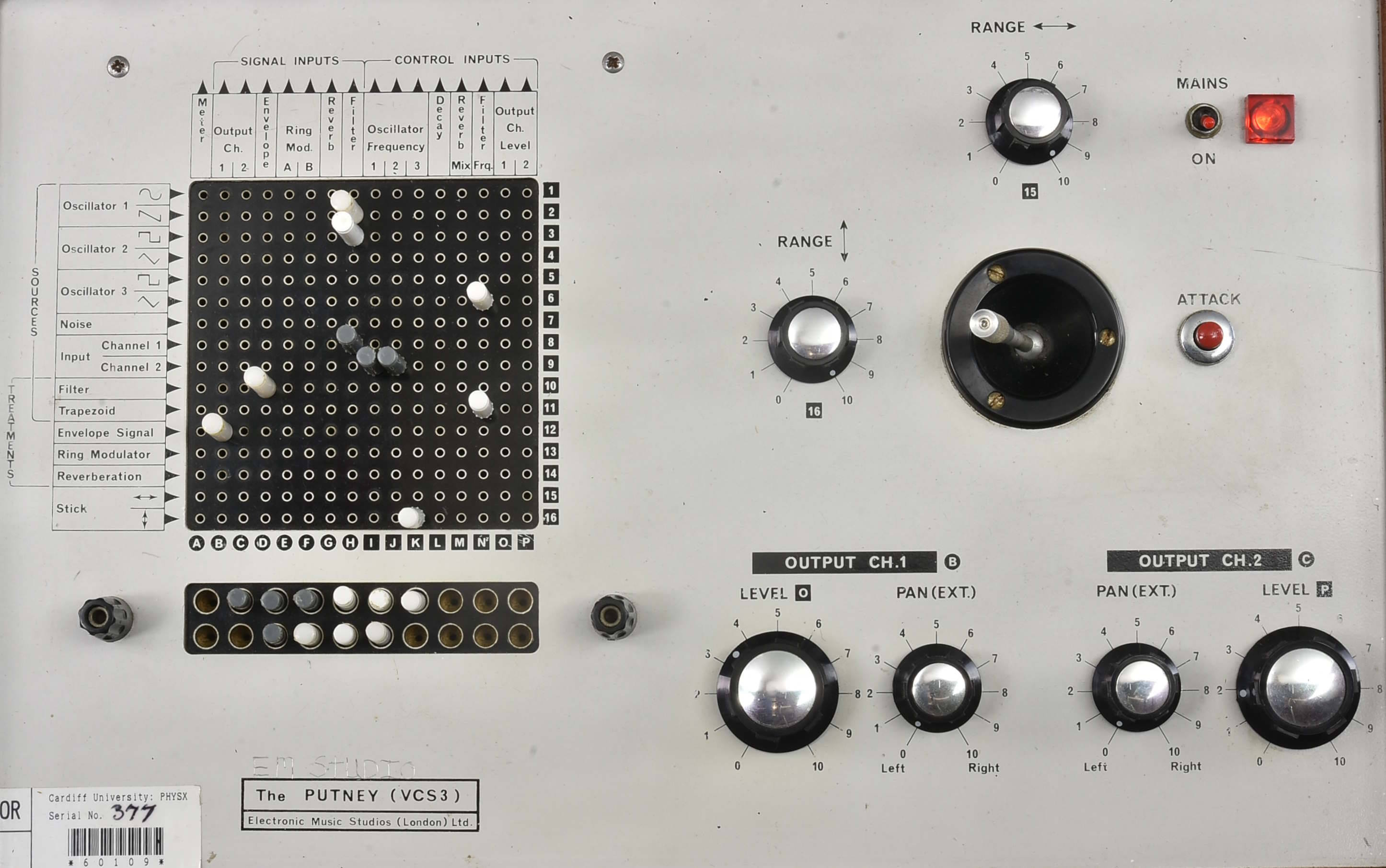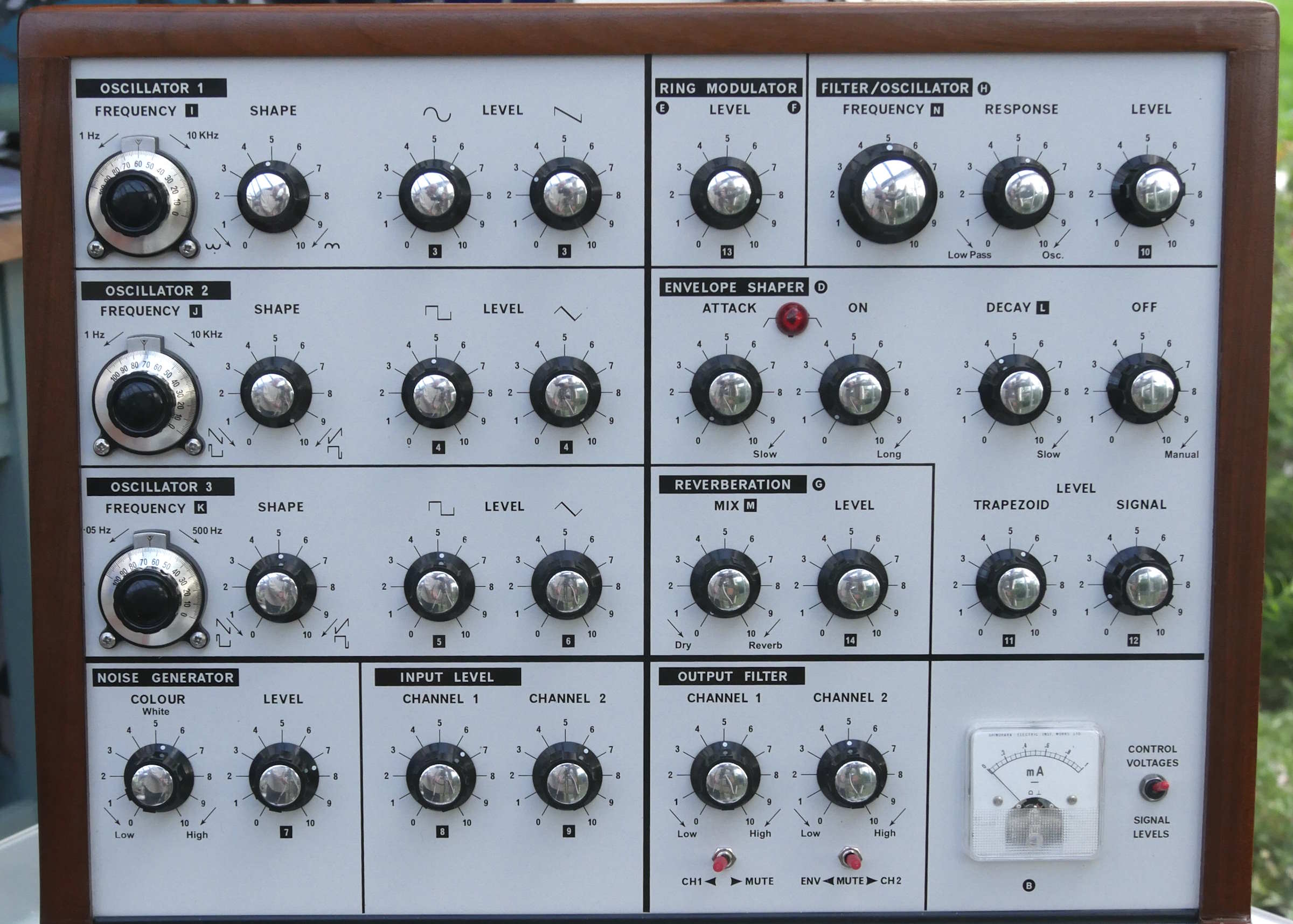 I bought this lovely old VCS3 / DK combination in April's VEMIA. Apparently the last of Cardiff University's EMS gear after many years. I knew the top panel was a bit tatty - the photos were clear - but I didn't think it would matter much in use. Actually it did. The bottom panel was excellent (except for Cardiff Uni's incised name and the serial number - exactly like the other one sold on VEMIA and the one on the Wikipedia entry). The wood of the case was excellent. So the missing screenprint bits on the main panel actually got to be annoying. Luckily the brilliant Robin Wood and Lucid were able to work out a solution. Robin had a replica panel made and screenprinted, and Lucid did the painstaking job of installing it. The result is just beautiful and well worth the expense. Unfortunately circumstances mean that I now need to sell it. Everything else is exactly as it was in the last auction, so I'll use the same photos from that, just adding some new ones of the beautiful new main panel. It will be in perfect working order, thanks to Lucid's expertise. As of Oct 31 it is now back at VEMIA and will be shipped from there. Packing 30GBP.