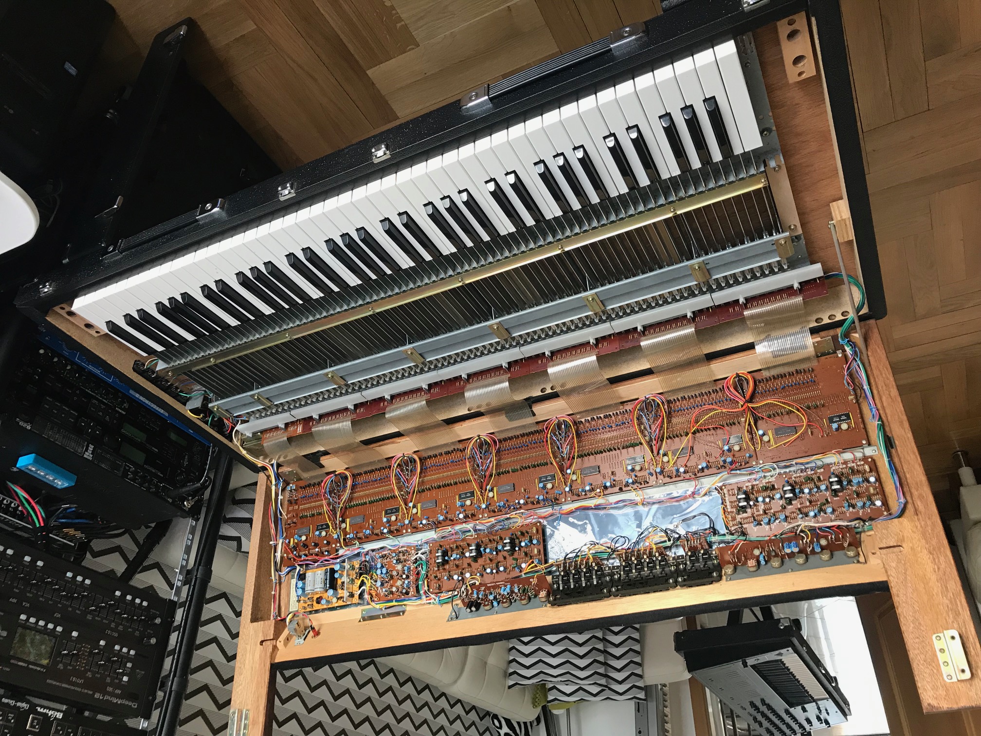 A very distinctive and musical electronic piano from the late 1970s. Excellent playability. Very good condition, technically flawless, including a case that serves as legs. Very heavy (approx. 60 kg).