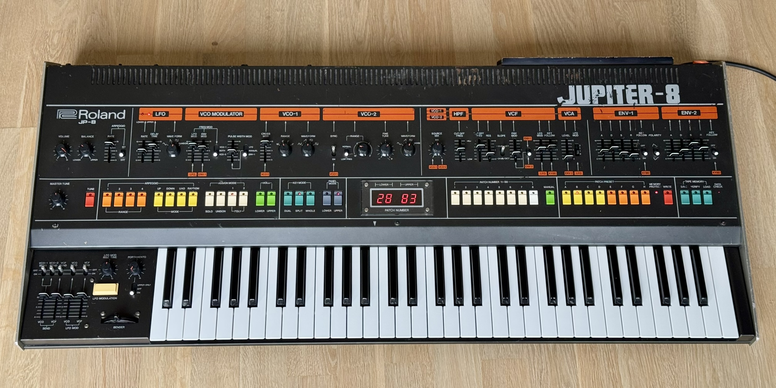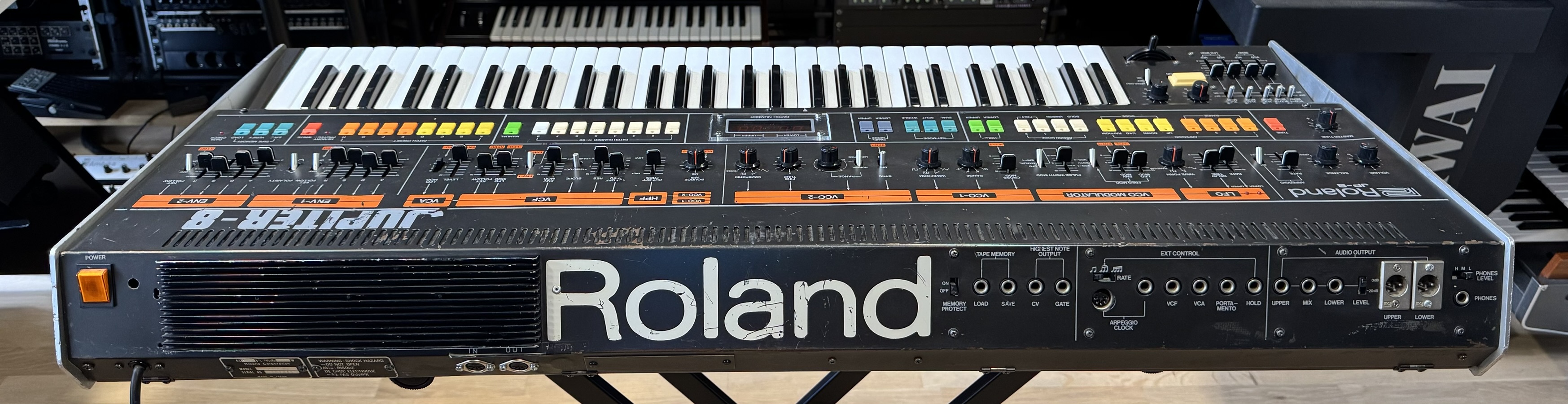 A very well-playing and fully functional Jupiter 8 with important enhancements - a MIDI interface from Encore (which also adds an extra sound bank), a FATAR TP9 balanced keyboard, and a switched power supply from Synthronics (which does not heat up, making the instrument more stable). 14 bit DAC version.