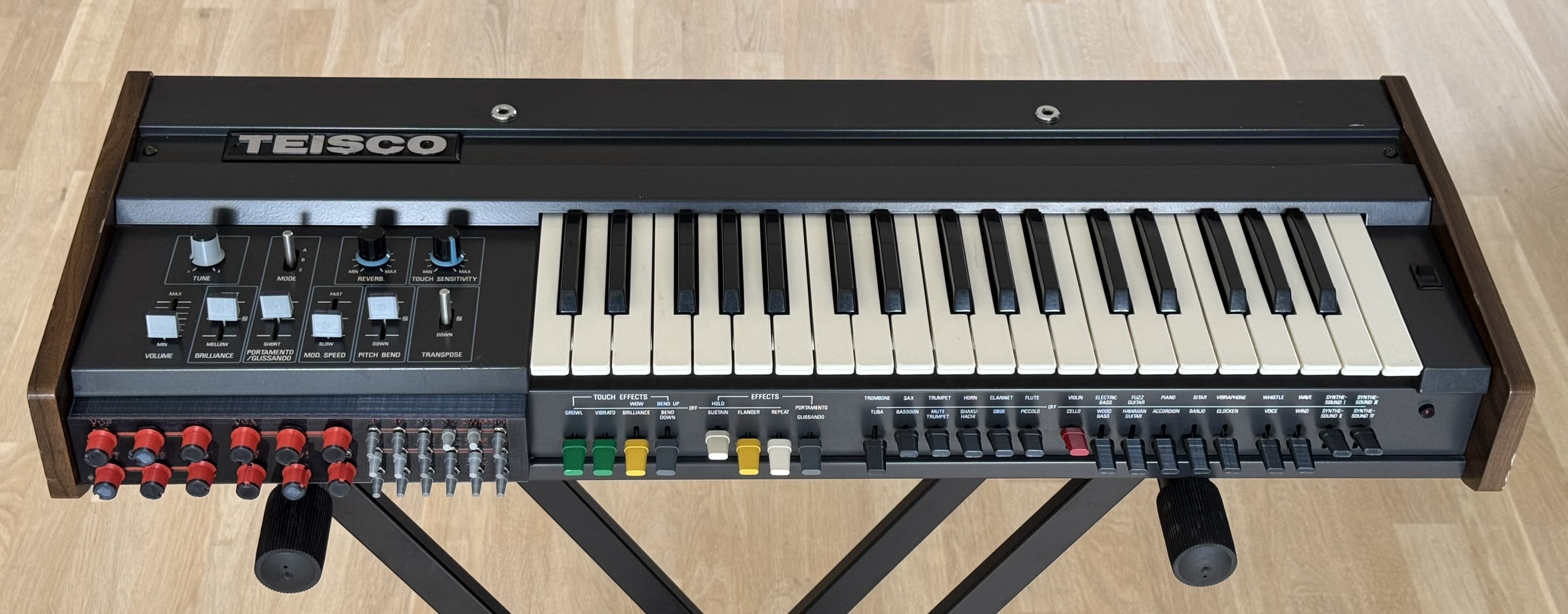 This was an nice DIY project. The preset Teisco S100P has a really interesting internal structure (VCO, LP VCF, 2x EG, 3x LFO, PWM, formant filter (which is originally used in only one preset:), two HPF filters... plus spring reverb, aftertouch, analog flanger, which is unusual for a small monosynth. So I modified one preset to make it fully editable, see the panel on the right. In addition, a CV/Gate input has been added. It sounds great, dense, meaty.