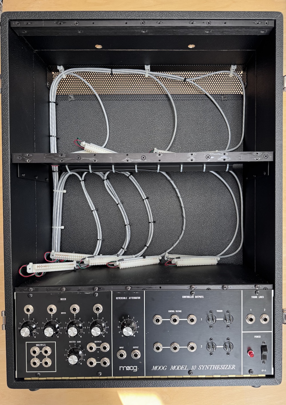 This is a genuine Moog Model 10 case from 2019, including power supply and wiring harnesses, CP3 mixer and multiples, and CV and S-trig connectors. Until recently it hosted a standard Model 10 synth that is now part of a larger Moog Modular, so it’s in good working condition and ideally suited for anyone looking to build or extend their own Moog system. The connectors in it are compatible with new or vintage Moog modules, though note that some rewiring may be needed if you’re planning to install more current-hungry modules than those it originally hosted.