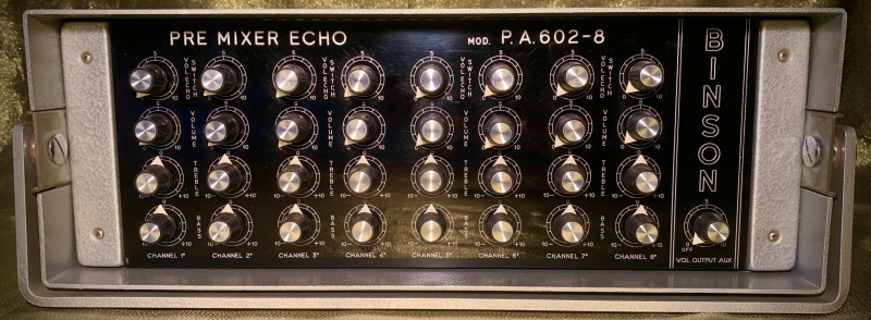 For sale this rare BINSON PRE MIXER ECHO P.A.602-8 8-Channel mixer with 8 valve preamps from the Binson 600 series. Each channel has : 1 x valve preamp and 5 settings : 1. bass frequencies volume pot. 2. treble frequencies volume pot. 3. input volume pot. 4. send to echo insrt volume push-pull (ON or OFF) pot. 5. input volume switch HI or LO (inside the unit, accessible from the back). Fully functional and in great cosmetic shape. Originally made to go with Binson Echorec FX but could also be used with any other mono FX of your liking. Gorgeously rich sound, a secret weapon for any music producer looking for THAT sound...