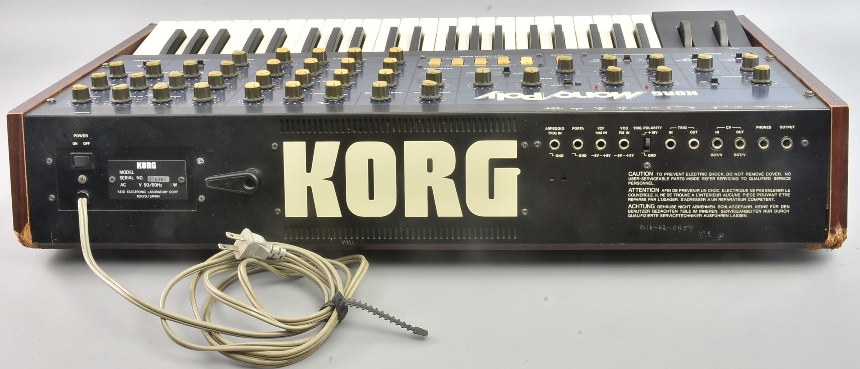 Thoroughly serviced ready for this auction, a classic Mono/Poly in its original un-molested condition. It is US voltage, but comes with a little transformer for UK use. Serial number 376385. The fake wood endcheeks have typical minor damage, but everything else is very nice indeed. Packing at VEMIA: 15GBP. |