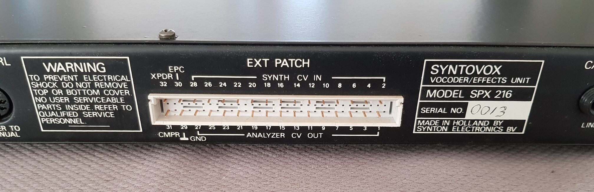 14 band vocoder with stereo out achieved by sending odd synthesis channelizes to left and even synthesis channels to right. It has an internal VCO with sawtooth.and a noise generator for S sounds. All CV’s available on rear connector. Formant shift up/down are also available for strange effects. A Wendy Carlos favorite. The Vocoder is in very good condition, I would have written near mint, if it wasn't for the small scratch I the upper left corner on the front. The SPX 216 has just been serviced at my tech. Not part of second chance sunday |