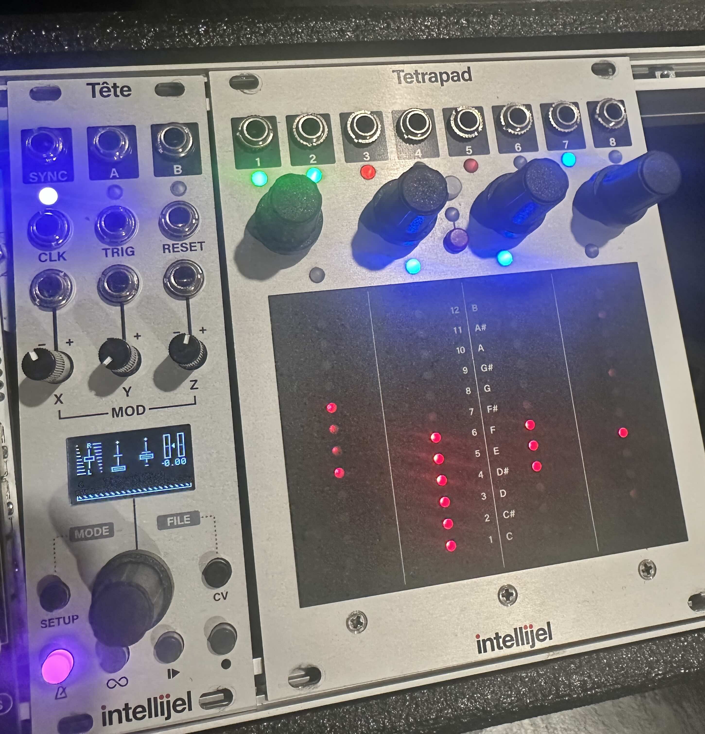 The Intellijel Tetrapad and its expander, the Tête, offer a wealth of functions based around four touch- and pressure-sensitive sliders. On the TetraPad itself, each slider offers a pair of CV outputs and a clickable encoder used for a variety of functions. In its default mode, each slider outputs fader position and pressure CVs, but by switching modes the sliders can be set to function as switches, drum pads, voltage stores, chord generators, a keyboard or four independent LFOs.