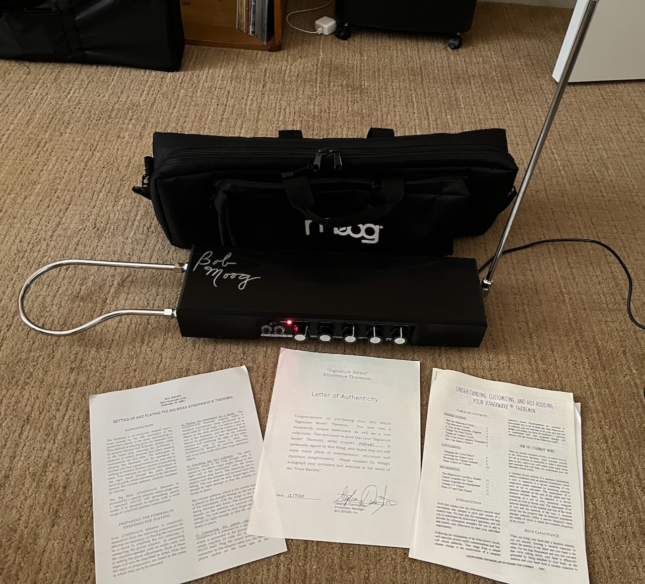 An original Big Briar Bob Moog Signature Series Etherwave Plus Theremin. I purchased this unit new in 2000 (as shown in the picture of the Certificate of Authenticity). I returned it to Moog sometime in the 2000's for the 'Plus' upgrade that added CV outputs for Pitch and Volume as well as a Gate output. It is fully functional and has spent its life in my smoke-free home studio.
