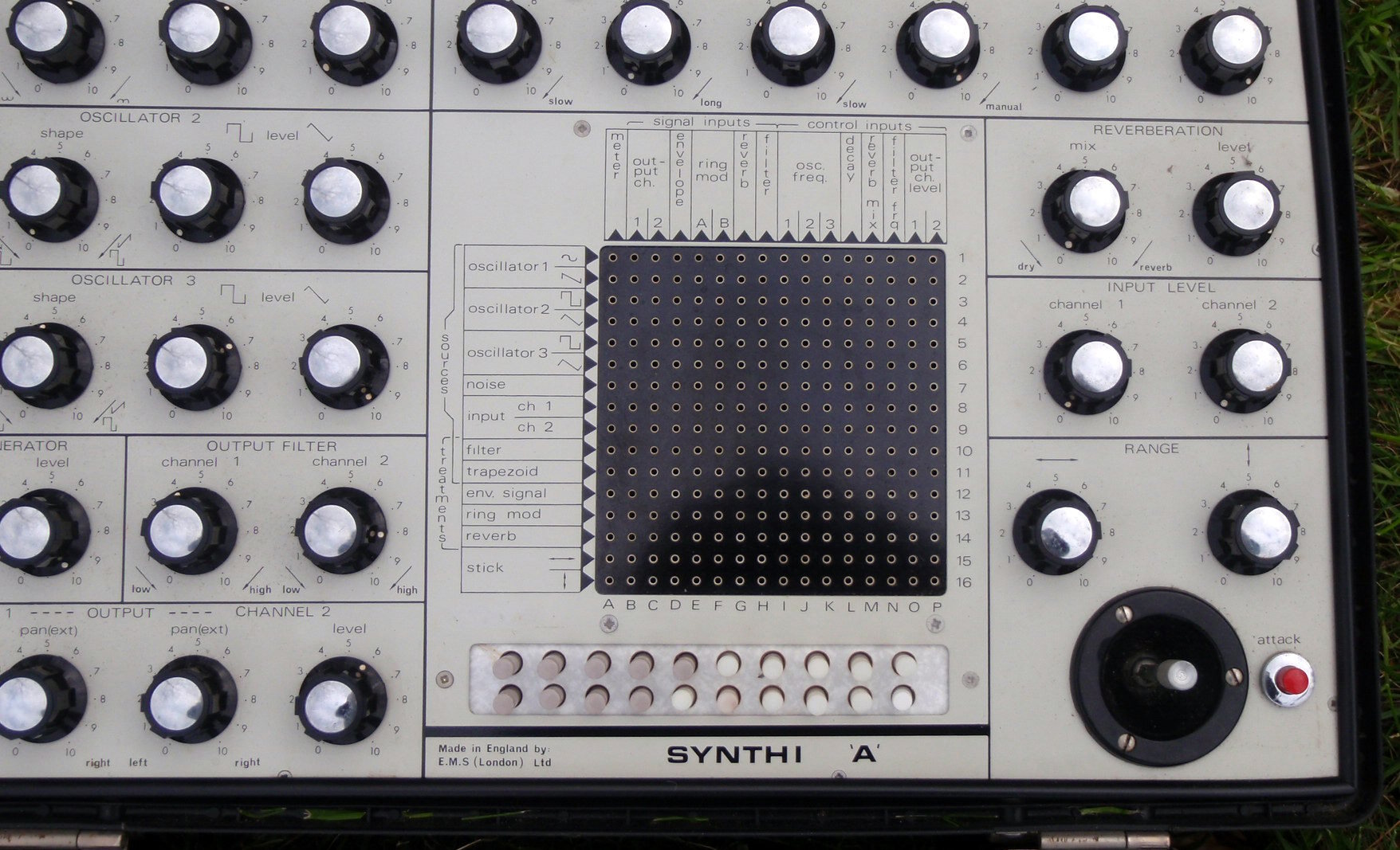 (Observant viewers may notice the absence of the usual Synthi A plastic name plate which usually adorns the outer case. This isn’t missing, but was simply never fitted as there are no holes for it, perhaps because of the early serial number. In addition the rear case is attached by four factory fitted screws and bushings, rather than the more usual arrangement of three).