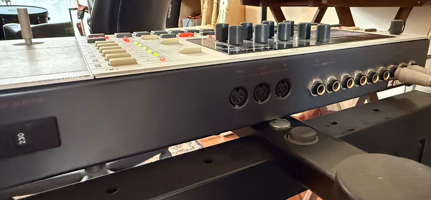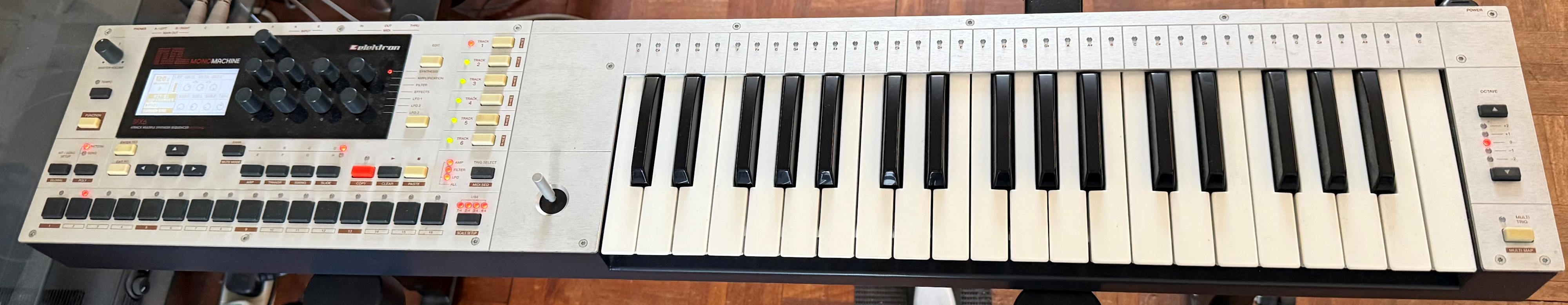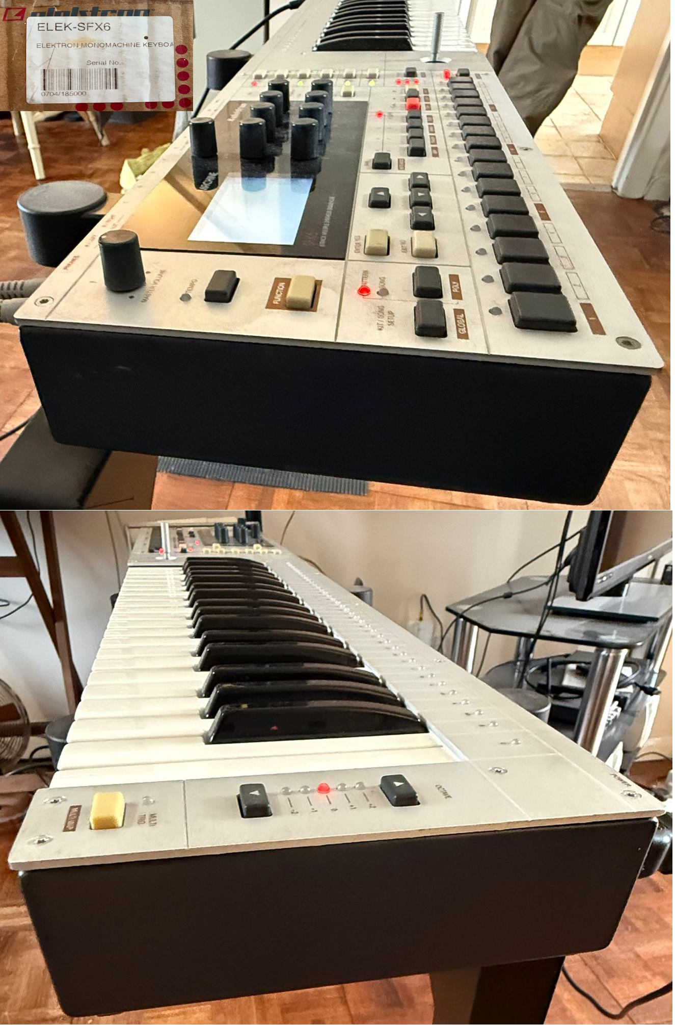 Elektron Monomachine SFX-6, this is the original 'MK 1' version with keyboard and joystick. One of only a few hundred manufactured. Serial number 0704/185000 from the box, F70100381-55 from the sticker on the bottom of the unit. (Google tells me this is unit 381, made Jan 2007.) Firmware version is 1.32B. Original box with user guide and sticker sheet. All buttons, encoders, keys and joystick fully functioning. Display still very readable. I haven't replaced the battery in the ten plus years that I've had it but there are no warnings on startup. It's a little bit grubby, but then I've only ever dusted it! |