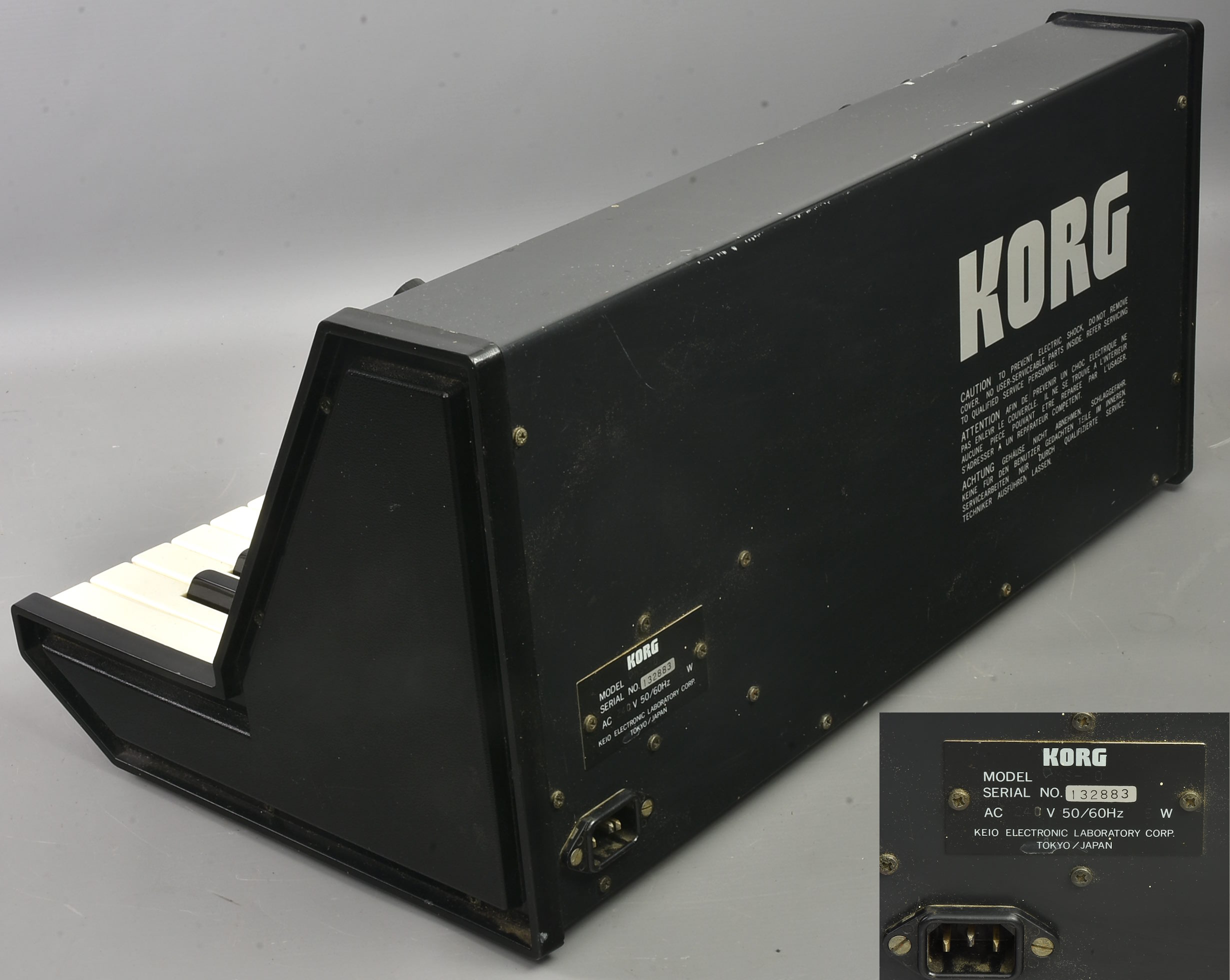 Condition: Heavily played. See the photos for cosmetic condition. Marked top. One repaired key, a couple with little bits missing underneath their fronts. Original feet lost, simple replacements put on base. Mains lead changed to kettle lead - and now 240V. Noisy pots. Needs service. Comes with nice set of patch leads. I've had this for many years but now, living in an off-grid house with no mains electricity, I've been storing it instead of using it.