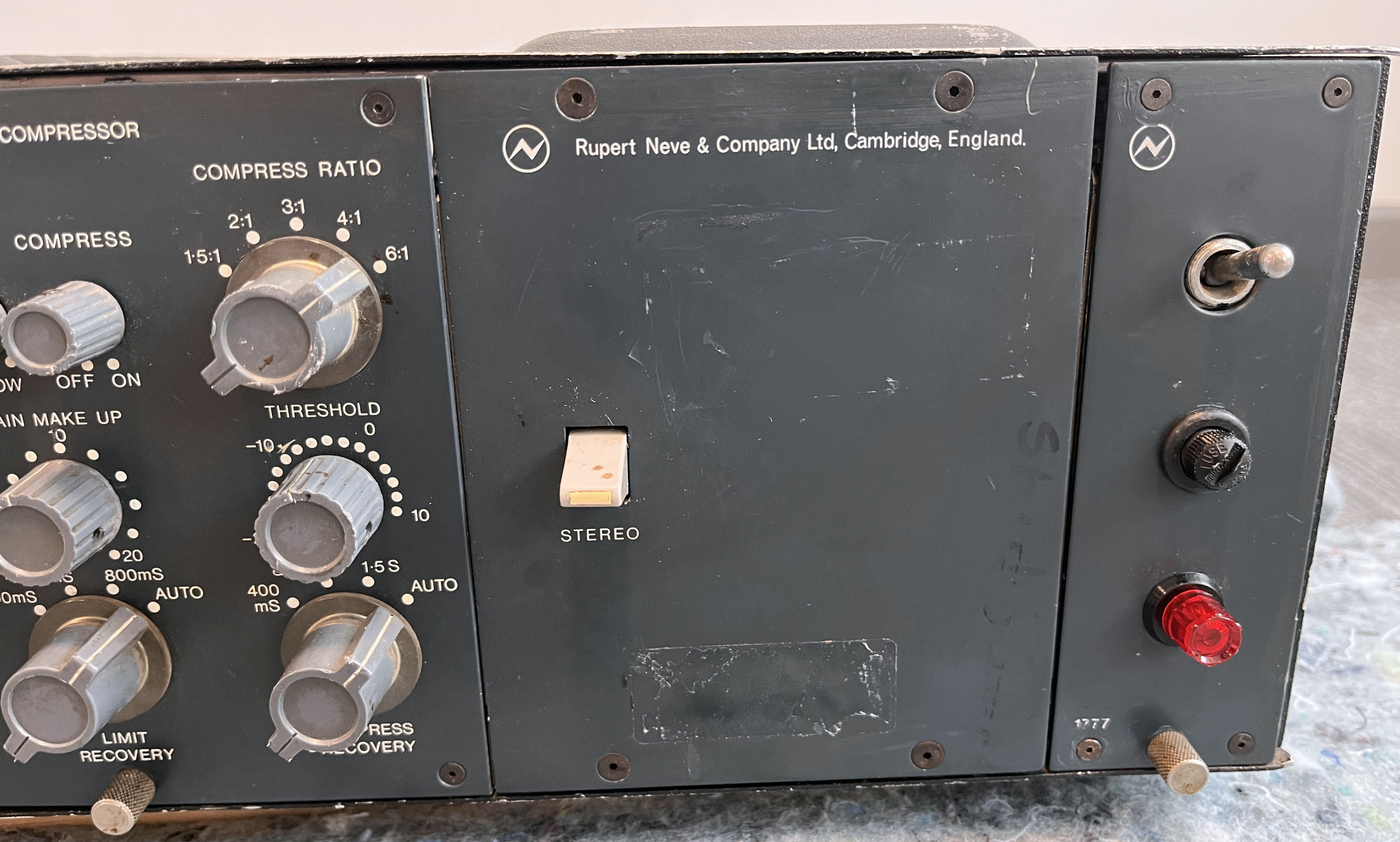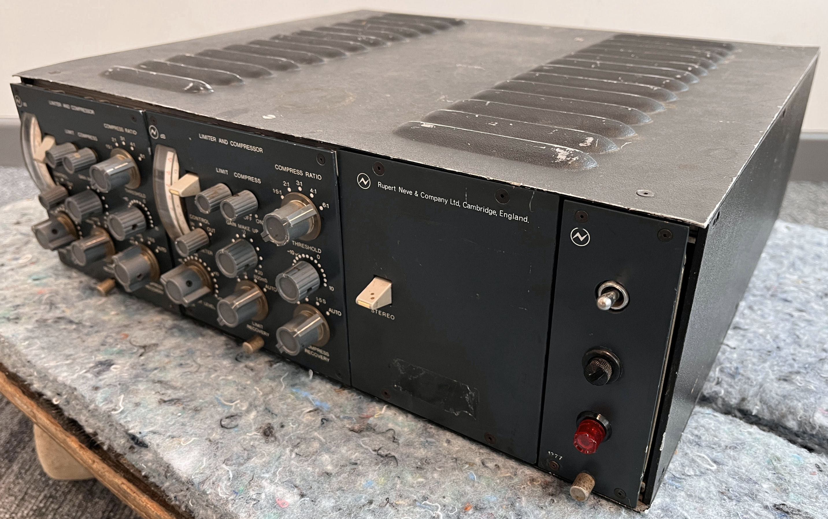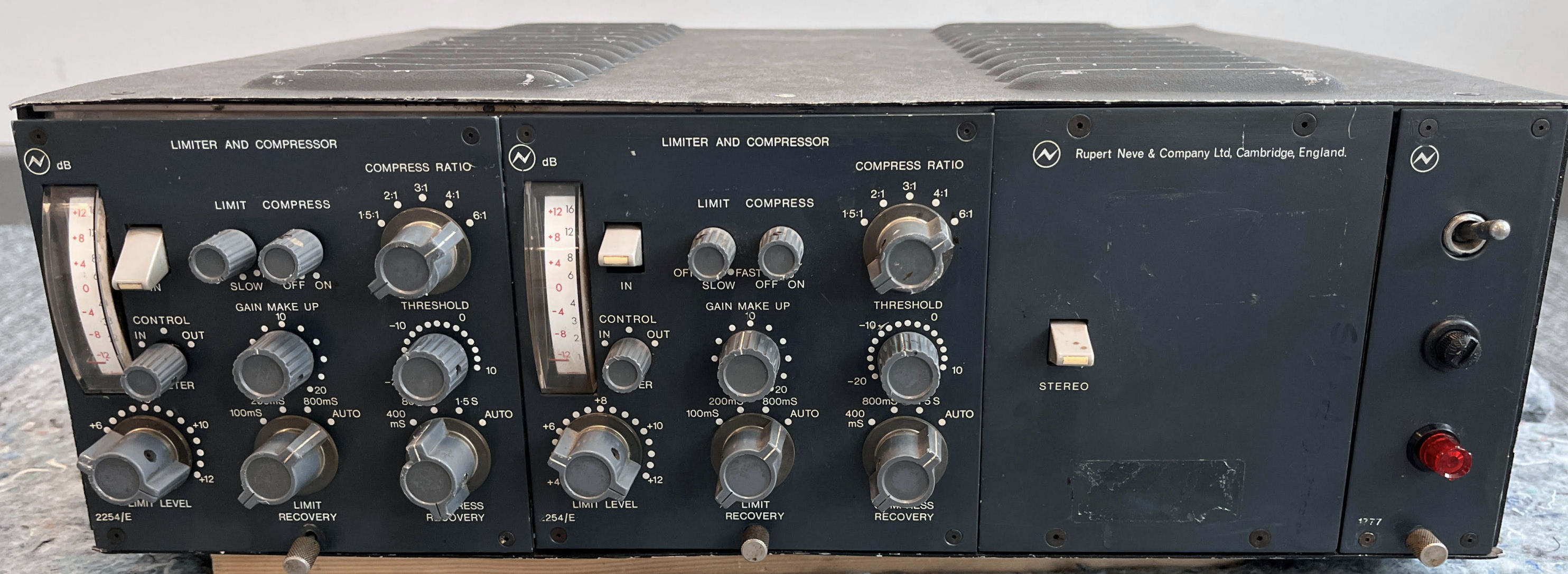 Pair of unrestored Neve 2254/e issue 1 comp/lims, cased with power supply and stereo link switch. They've been in storage for a few years, but other than dirty switches, they appear to work as expected. |