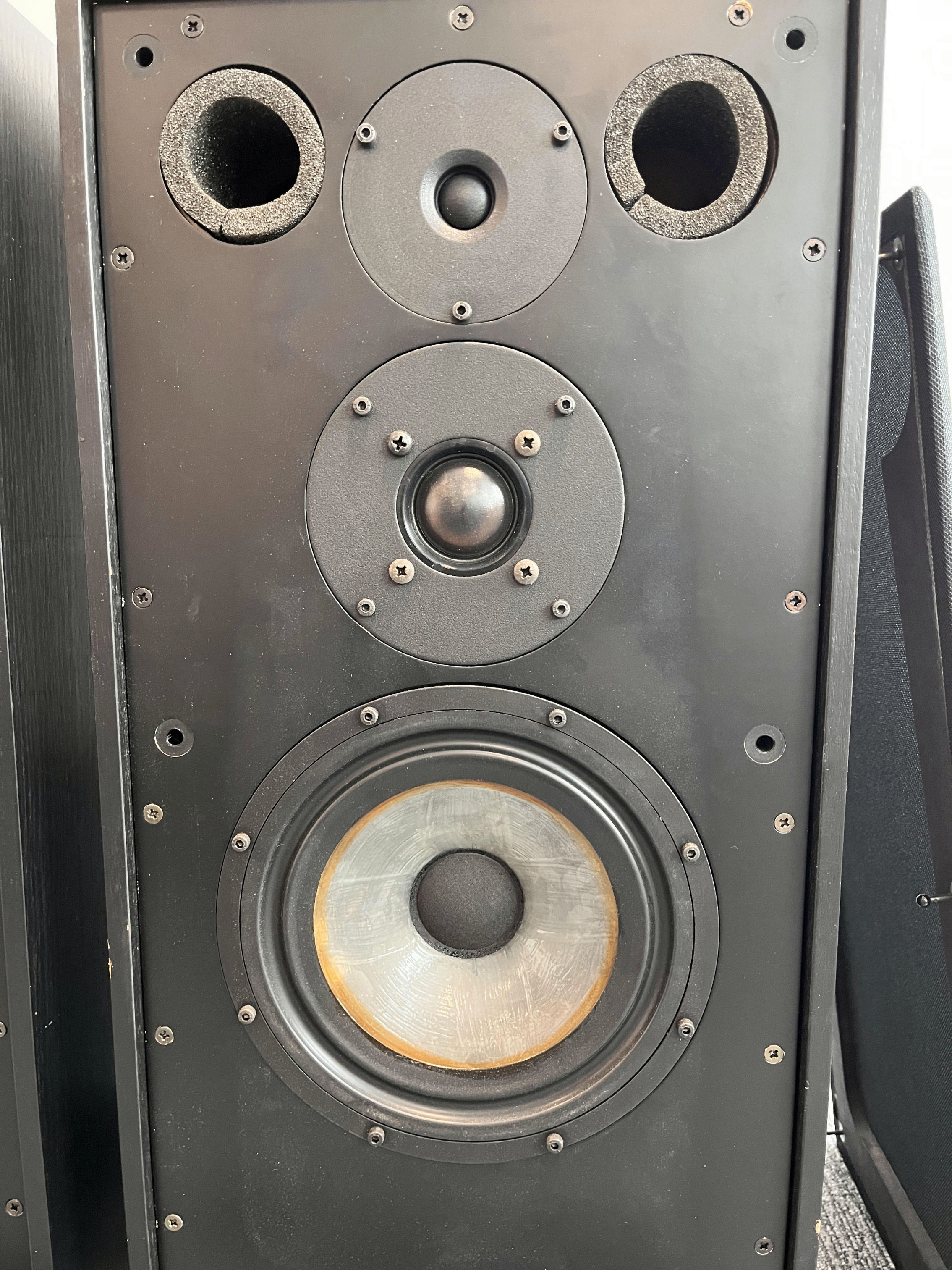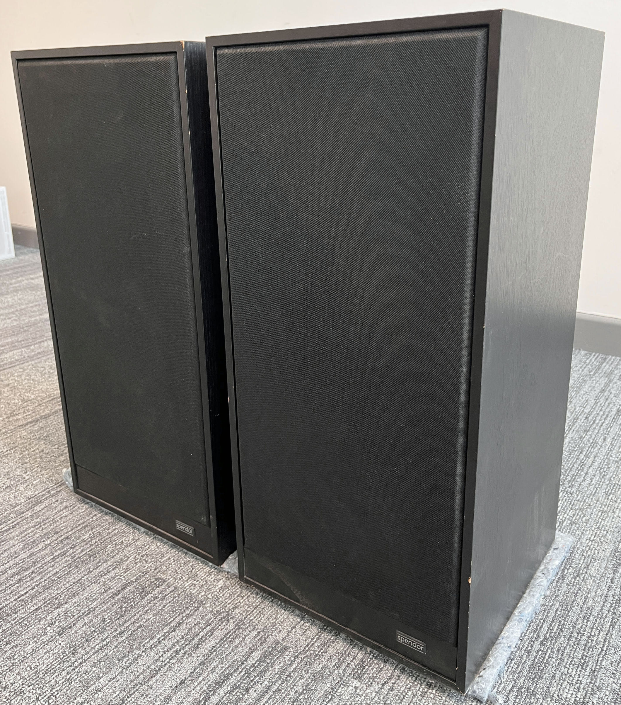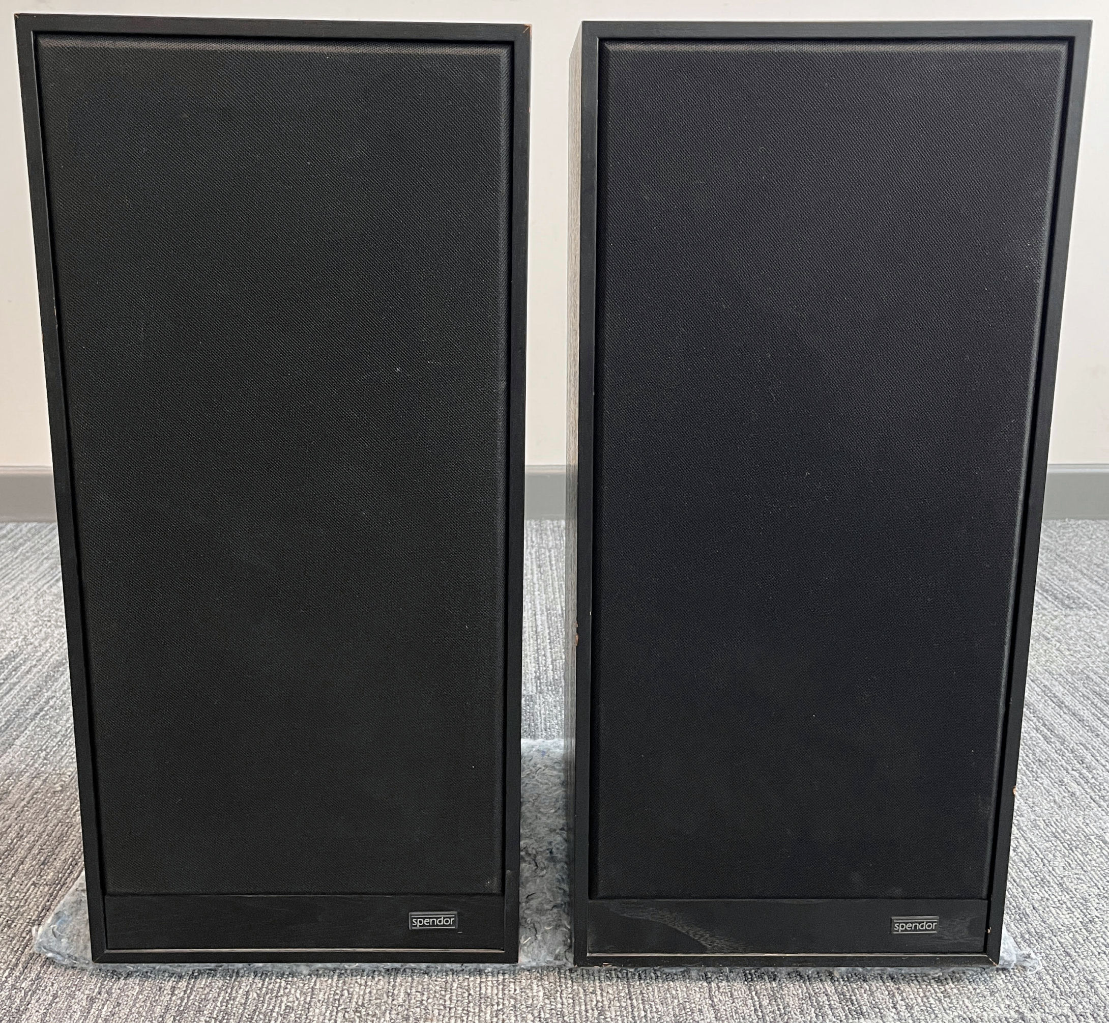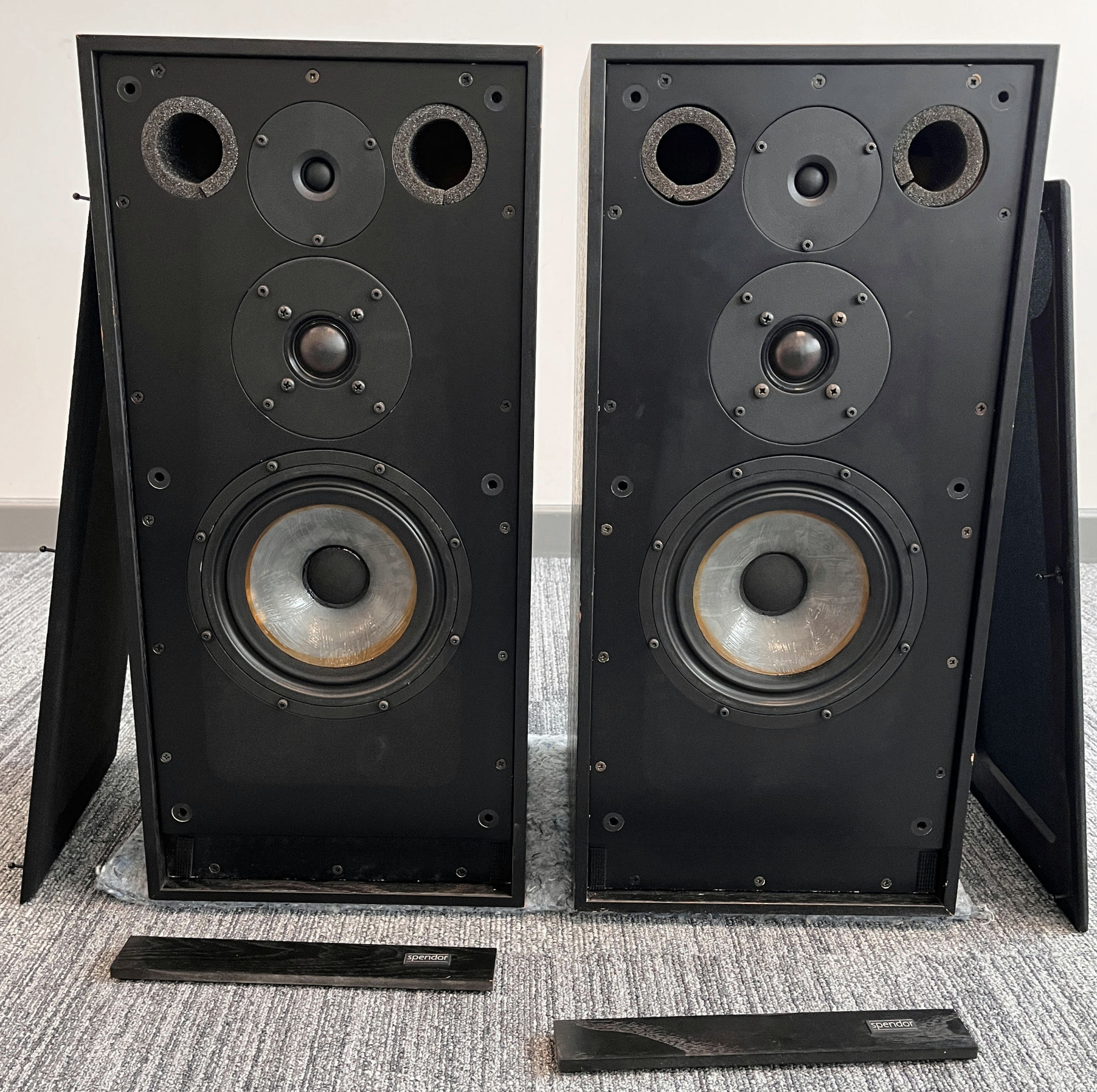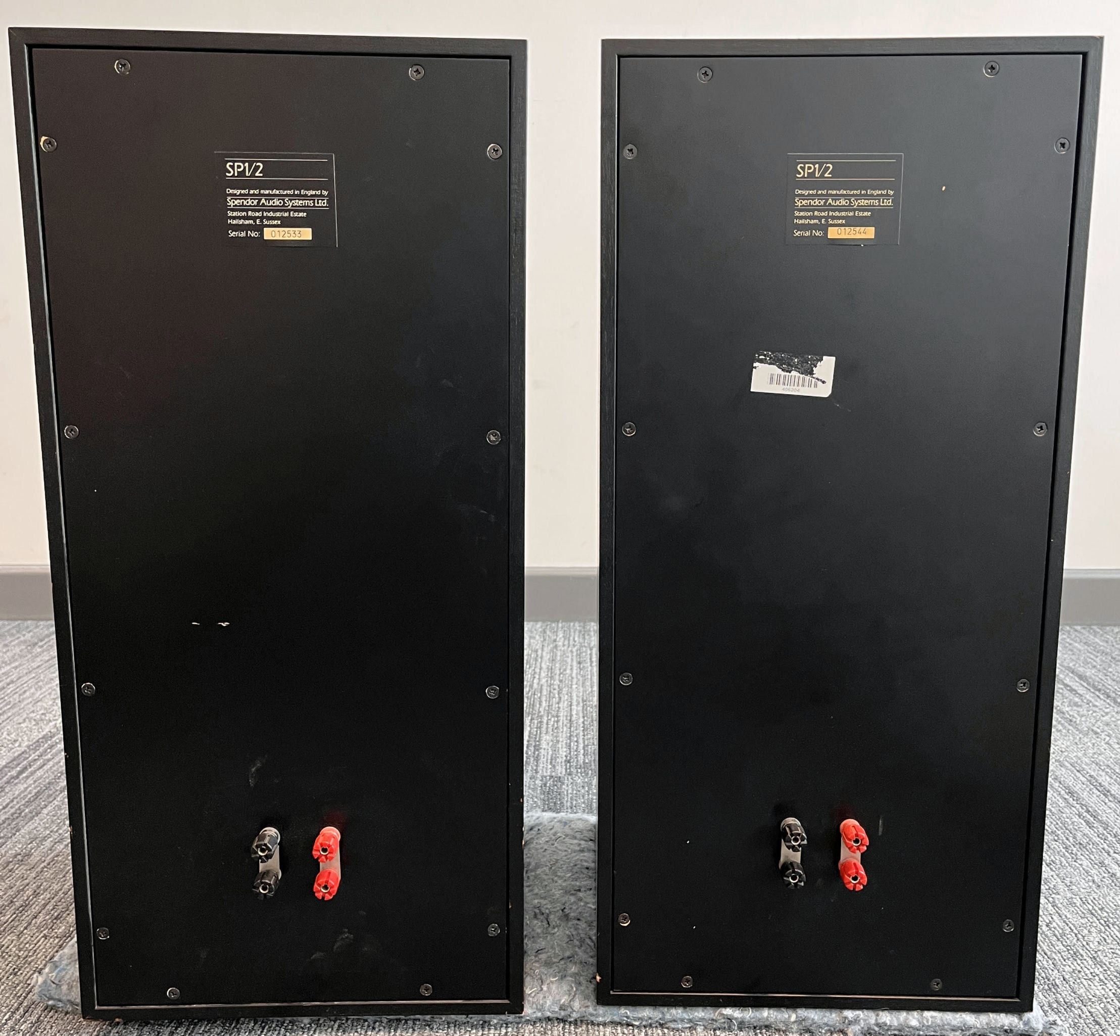 A pair of black, bi-wired 3-way Spendor SP1/2 speakers. 210mm bass, 38mm mid 22mm tweeter, 640mm x 300mm x 300mm, 18Kg (each).