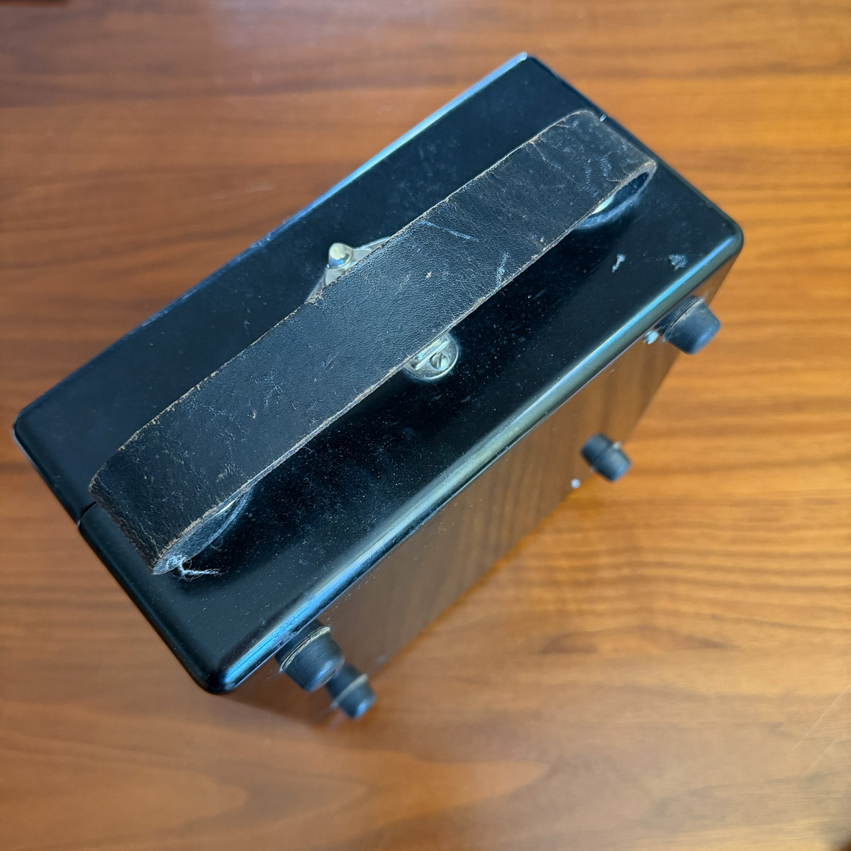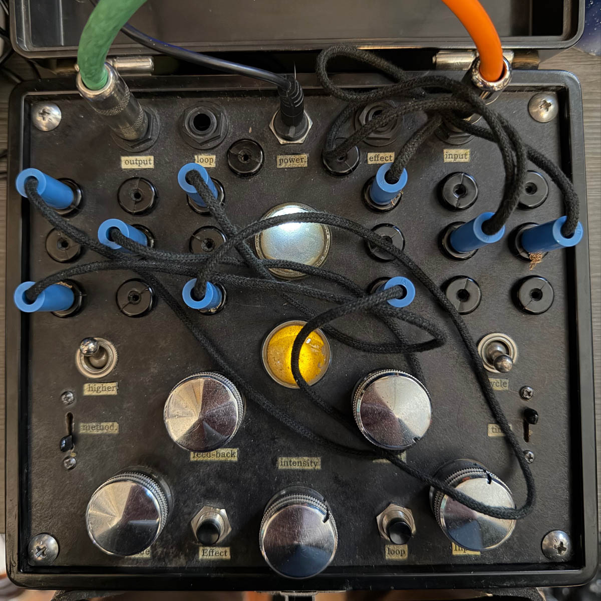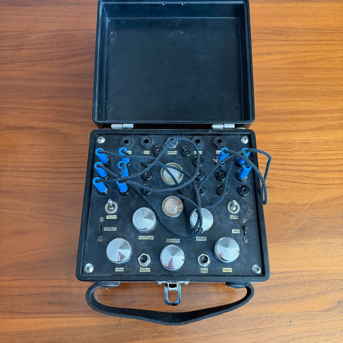 Rare handmade Folktek effects unit with patching capabilities, housed in a bakelite case with leather carrying handle. Like many of these earlier, handmade Folktek devices, it is esoteric and unpredictable. Essentially this is a delay/looper with some clearly labeled functions (method, feedback, input level, output level, effect on/off, loop on/off, etc.) and an intentionally unlabeled 20-point patchbay. The original monopin, cloth patch cables are included.
