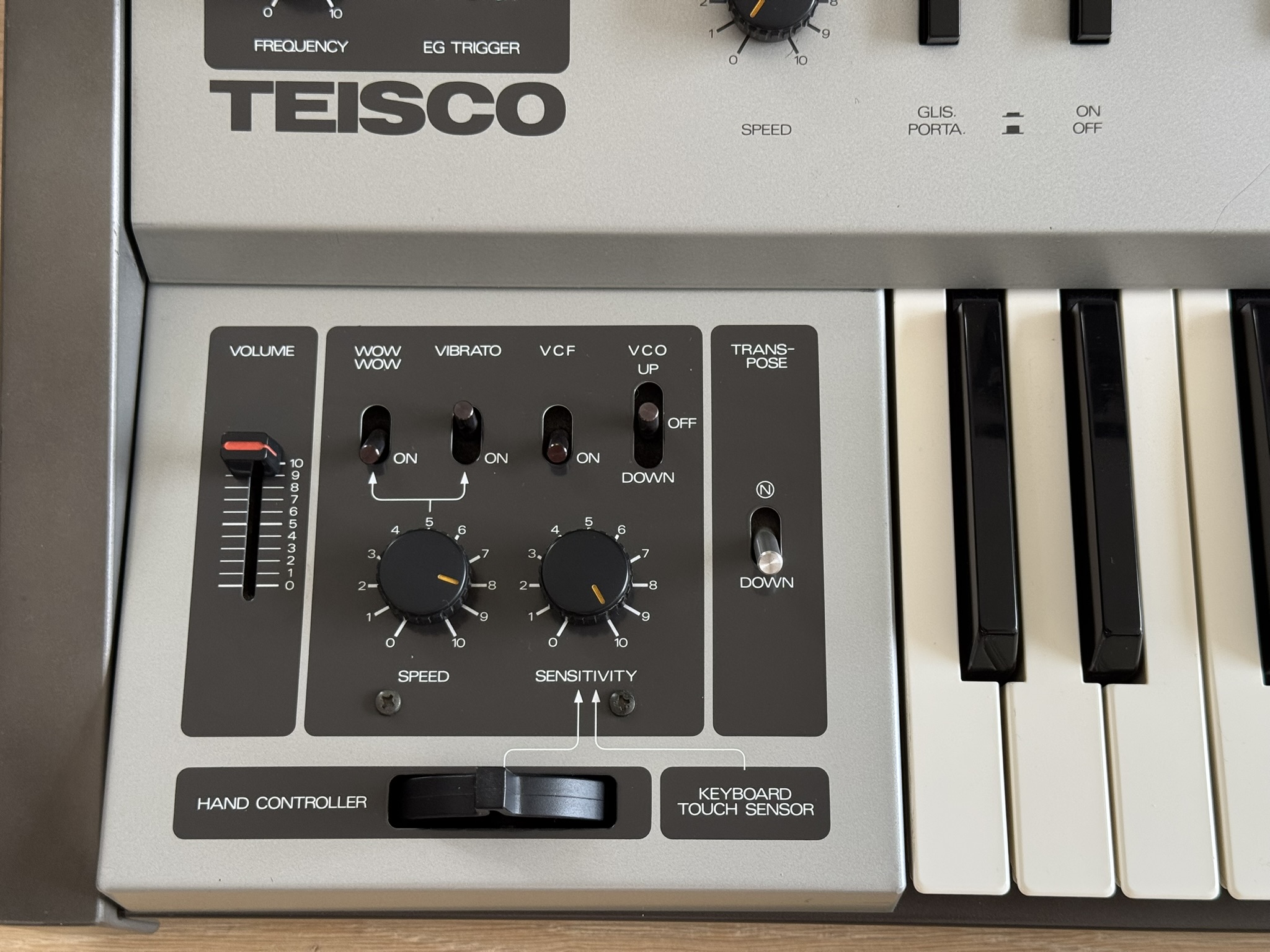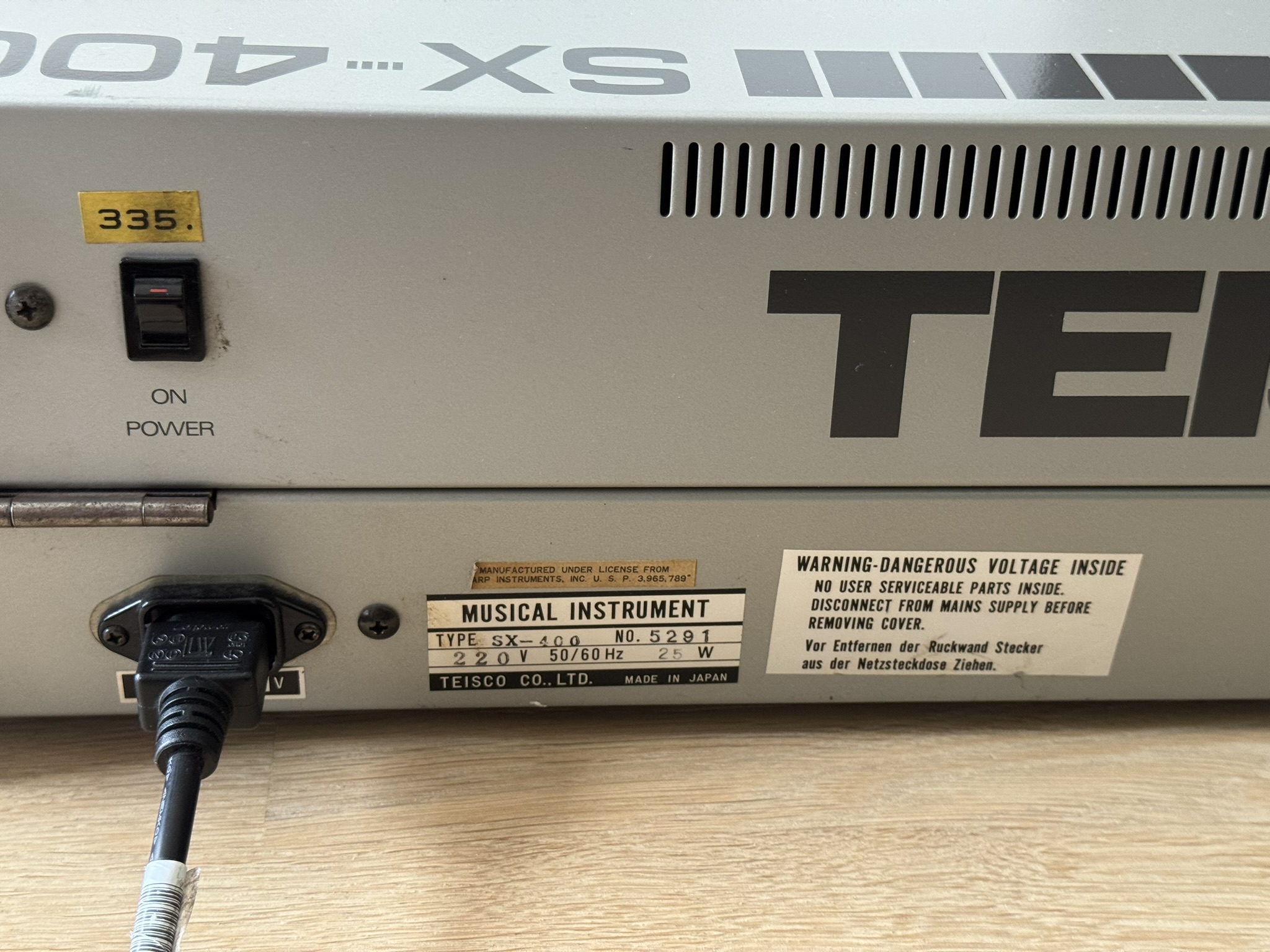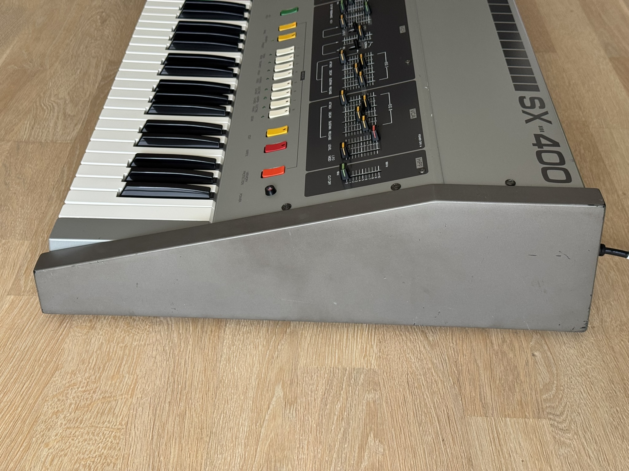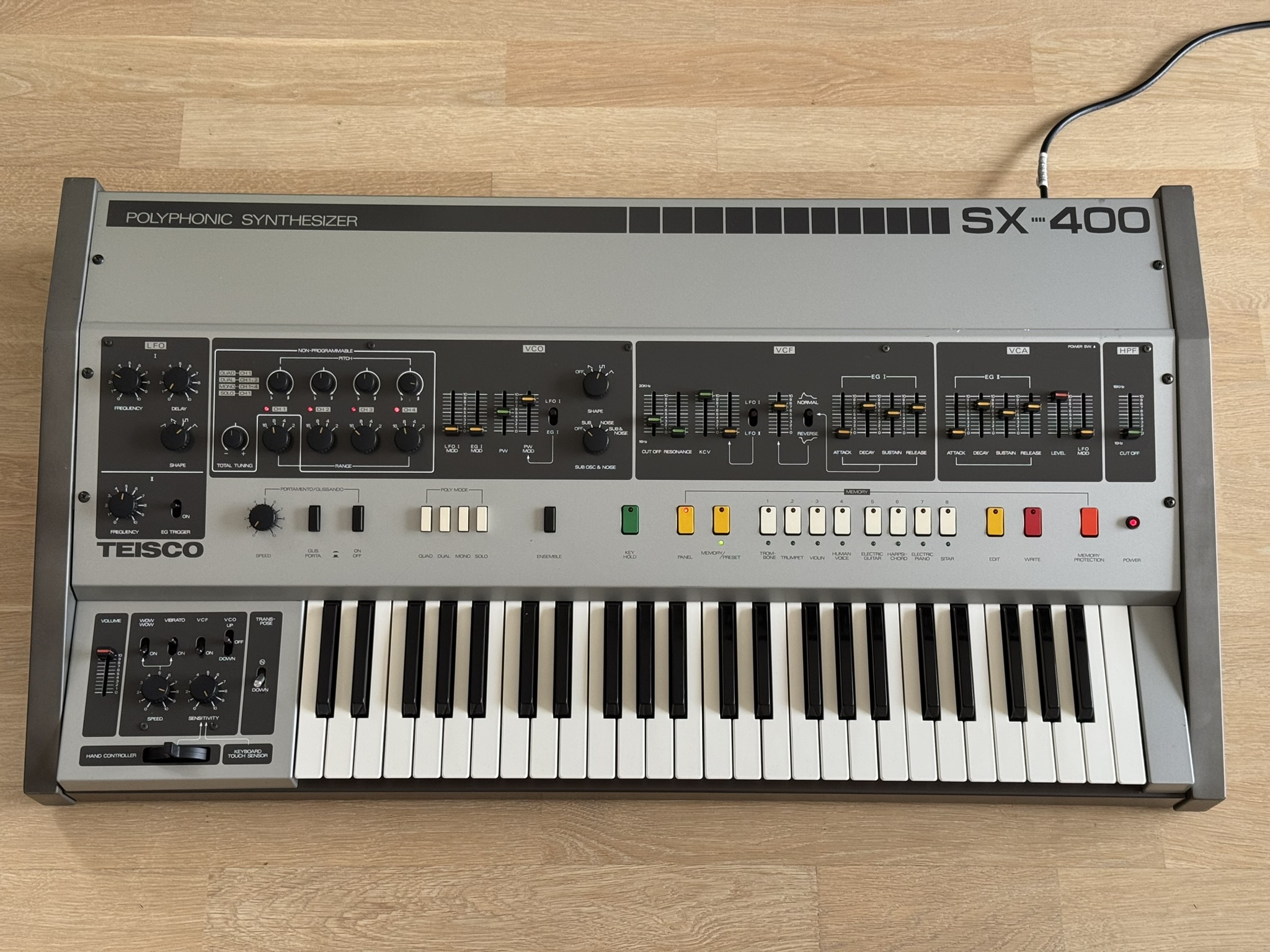 An extremely rare Teisco SX400. A 4-voice analog synthesizer built with discrete components (no CEM, SSM, etc.) featuring a fantastic chorus. Solid mechanics, aftertouch, 8 presets, 8 user memories. Can be controlled via CV (monophonic).