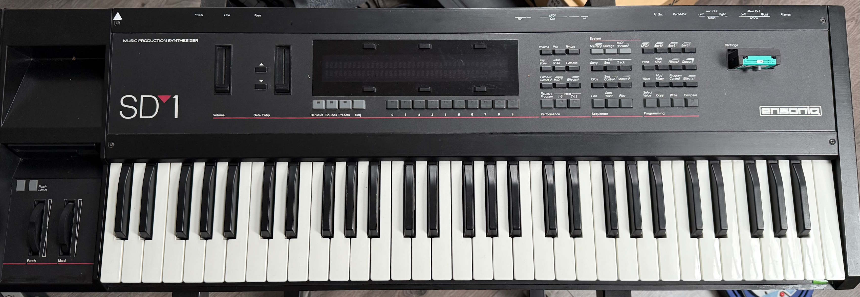 Ensoniq SD1 - one of the last Ensoniq transwave synths. Polyphonic aftertouch is still working. Also comes with the Synthsquare SC-2048 memory card that can store up to 16 banks of sounds worth €220 on its own. VEMIA can collect and pack: 24GBP.