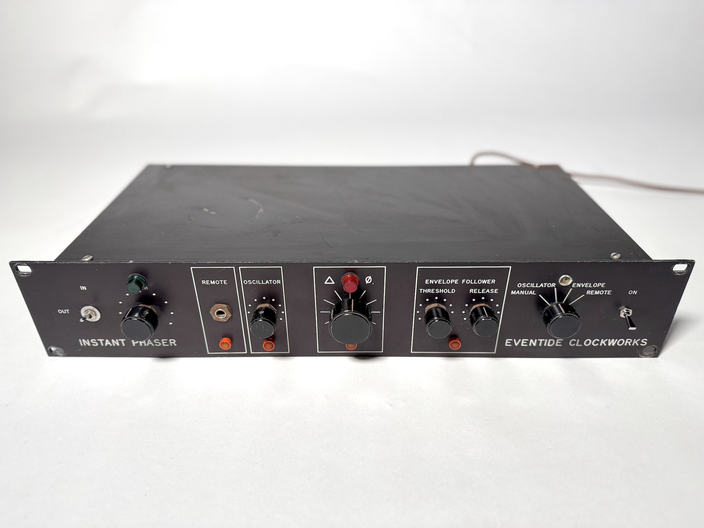 The Eventide Instant Phaser is a classic early phaser with a distinctively organic sound. It was very recently serviced with a new mains switch and all the lights are working with incandescent bulbs as it should be. I have enjoyed the pulsing glow in oscillator mode in my studios for nearly 30 years regardless of whether it was being used on a session or not and would highly recommend this mode of operation. Some cosmetic wear as you can see but all in all a thing of dusty beauty in a sterile age of digital emulations.. Included in the sale is a bound copy of the manual with circuit diagram which Eventide sent me long ago. PS external CV control possible with this. |