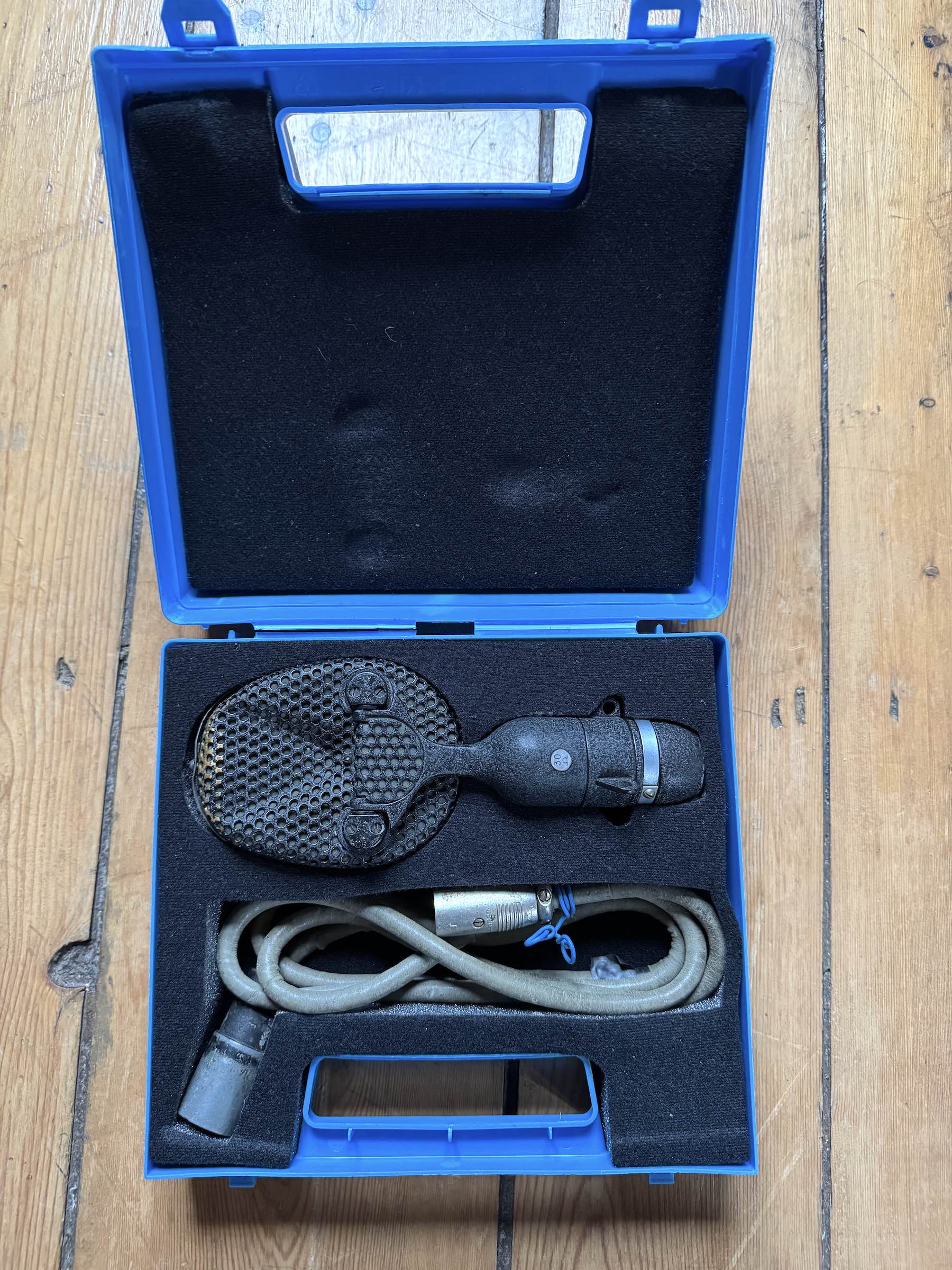 Vintage ST&C 4038 microphone built for the BBC (Coles still manufacture this design). Rarer 30 Ohm version specified for Outside Broadcast. Road worn but works perfectly. Included with microphone is a lead with original 4038 connector AND a very rare BBC-wound 30:300 Ohm transformer (sorry not photographed) which was specifically designed for this version of the 4038. The transformer will also lift other low ribbon and dynamic impedance microphones so it is a very useful studio tool. Note that a special BBC microphone stand 4038 adaptor is listed in a separate lot. |