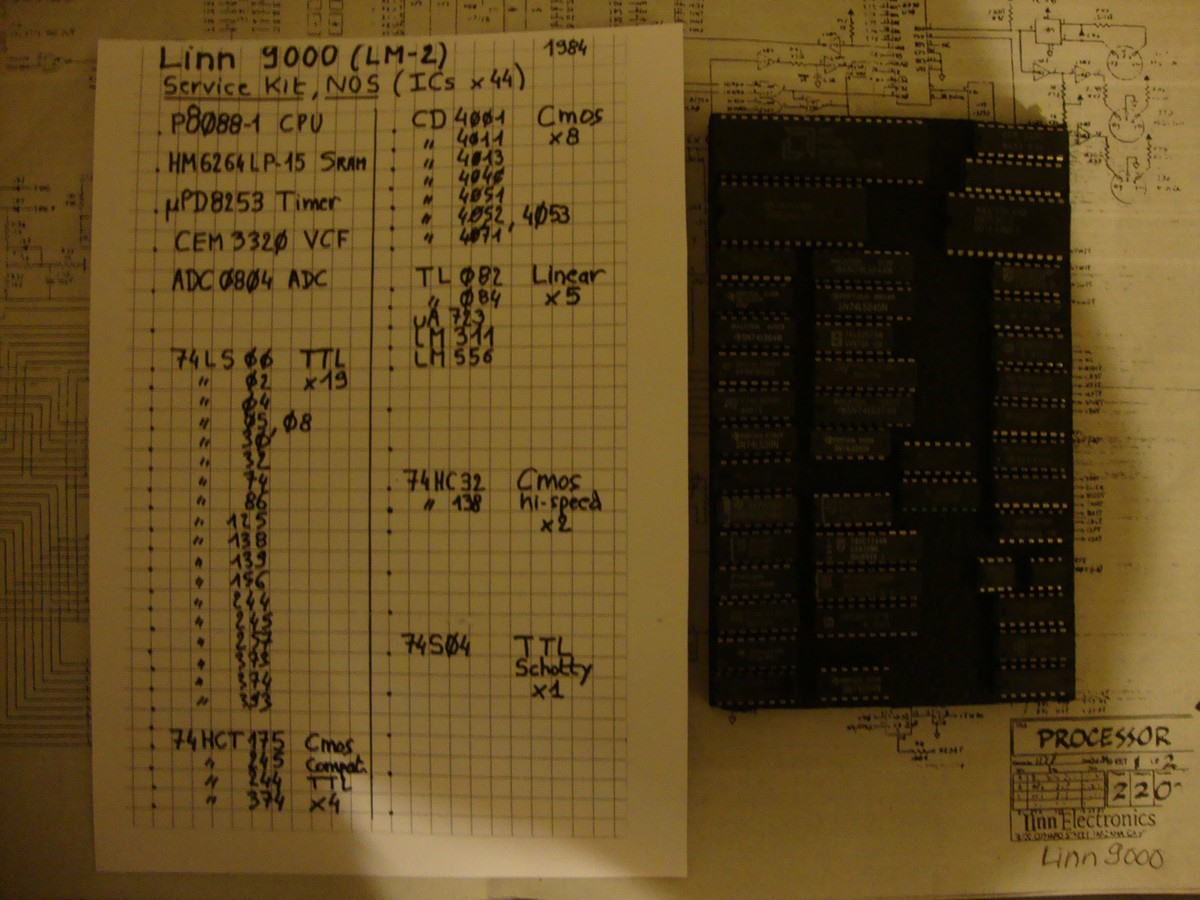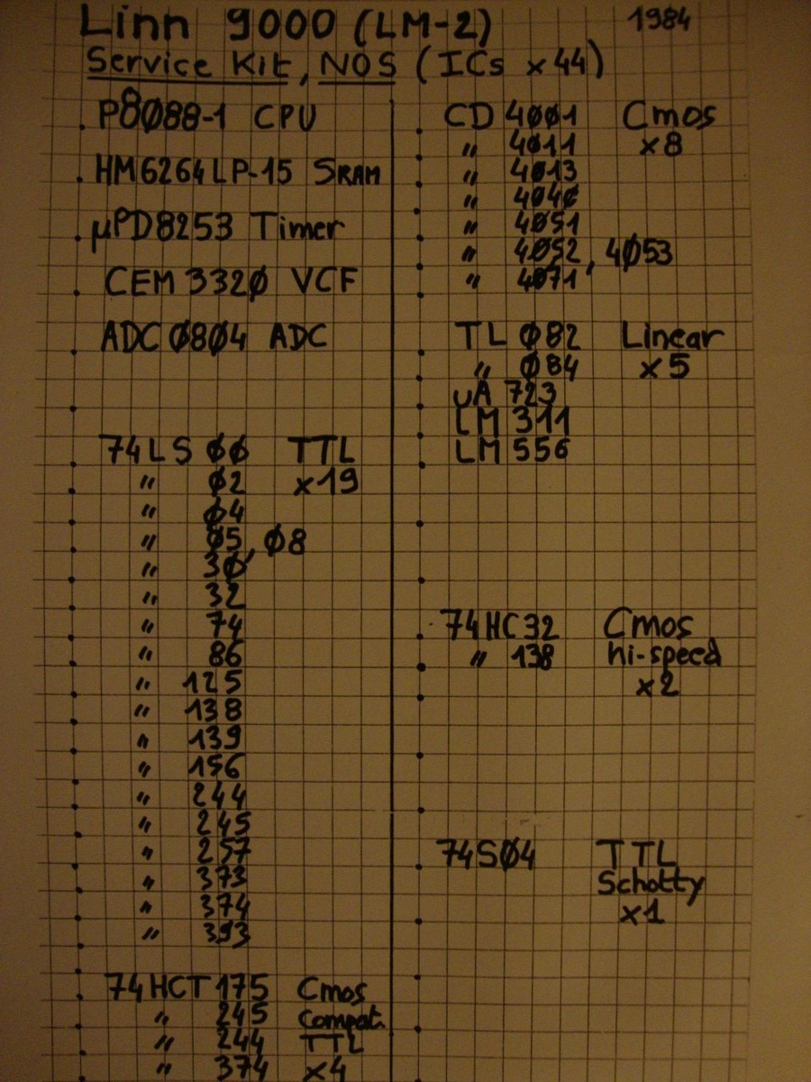 Linn-9000 survival kit from synthspares ___: 44 NOS or brand new Integrated Circuits useful to service your instrument like original Curtis very beautiful VCF : CEM3320. CPU 8088. Memory. Per : ADC, Timer.TTL & CMOS logic : 74LS, 74HCT, 74HC, 74S, 4000. Linear/analog ___ICs are brand new / NOS no re-issue nor clone