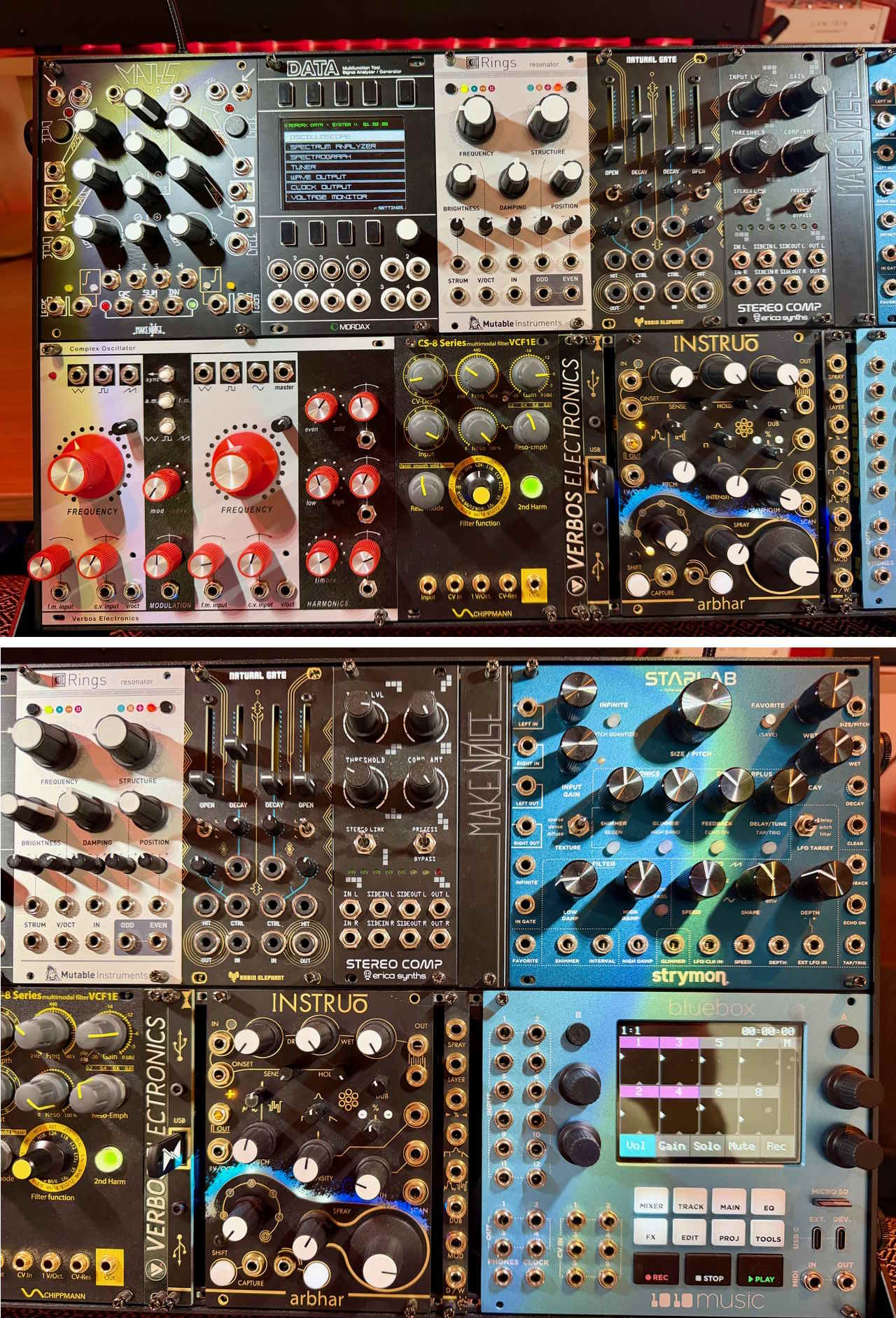 This is a serious modular setup comprising a curated selection of premium, rare, and in-demand modules from leading manufacturers including Make Noise, Verbos Electronics, Mutable Instruments, Rossum Electro-Music, and others