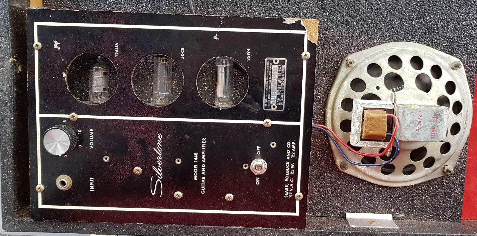 Classic vintage Silvertone 1448 guitar / amp combo from the 60s, very rare in the UK. More common in the USA, but still revered there. See this nicer, working example : https://reverb.com/uk/item/94342988-c-1960-s-silvertone-model-1448-electric-guitar-w-original-case-amp