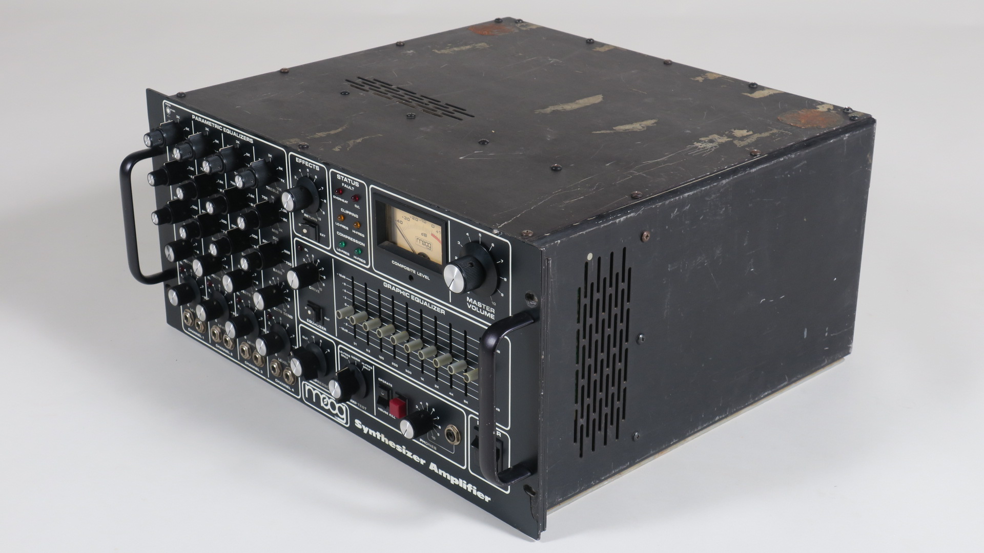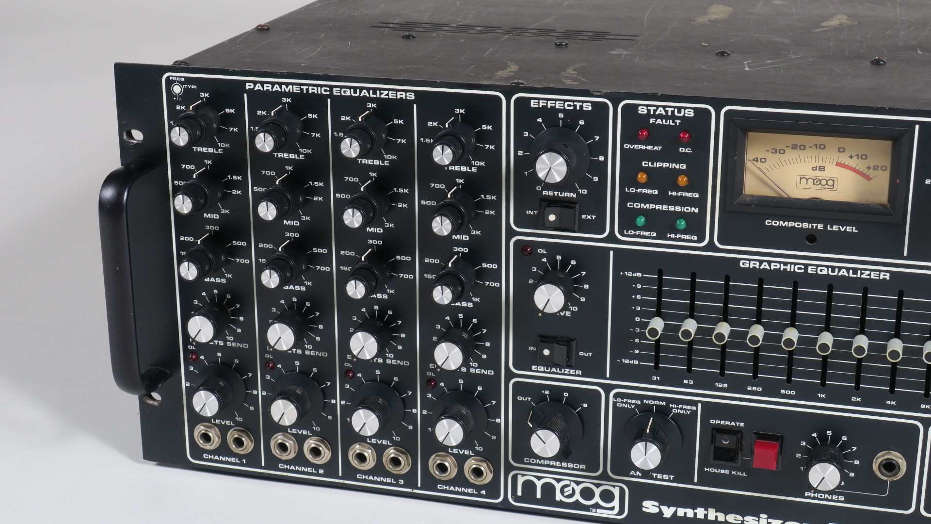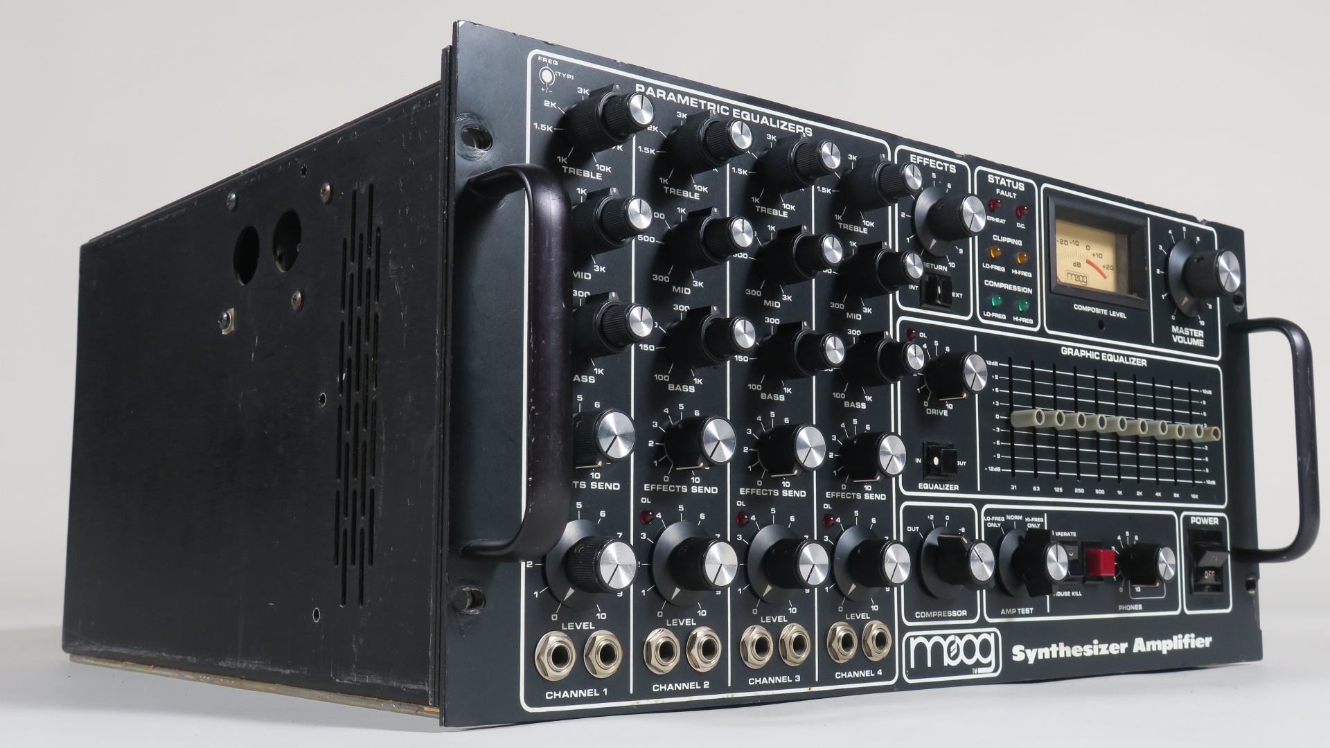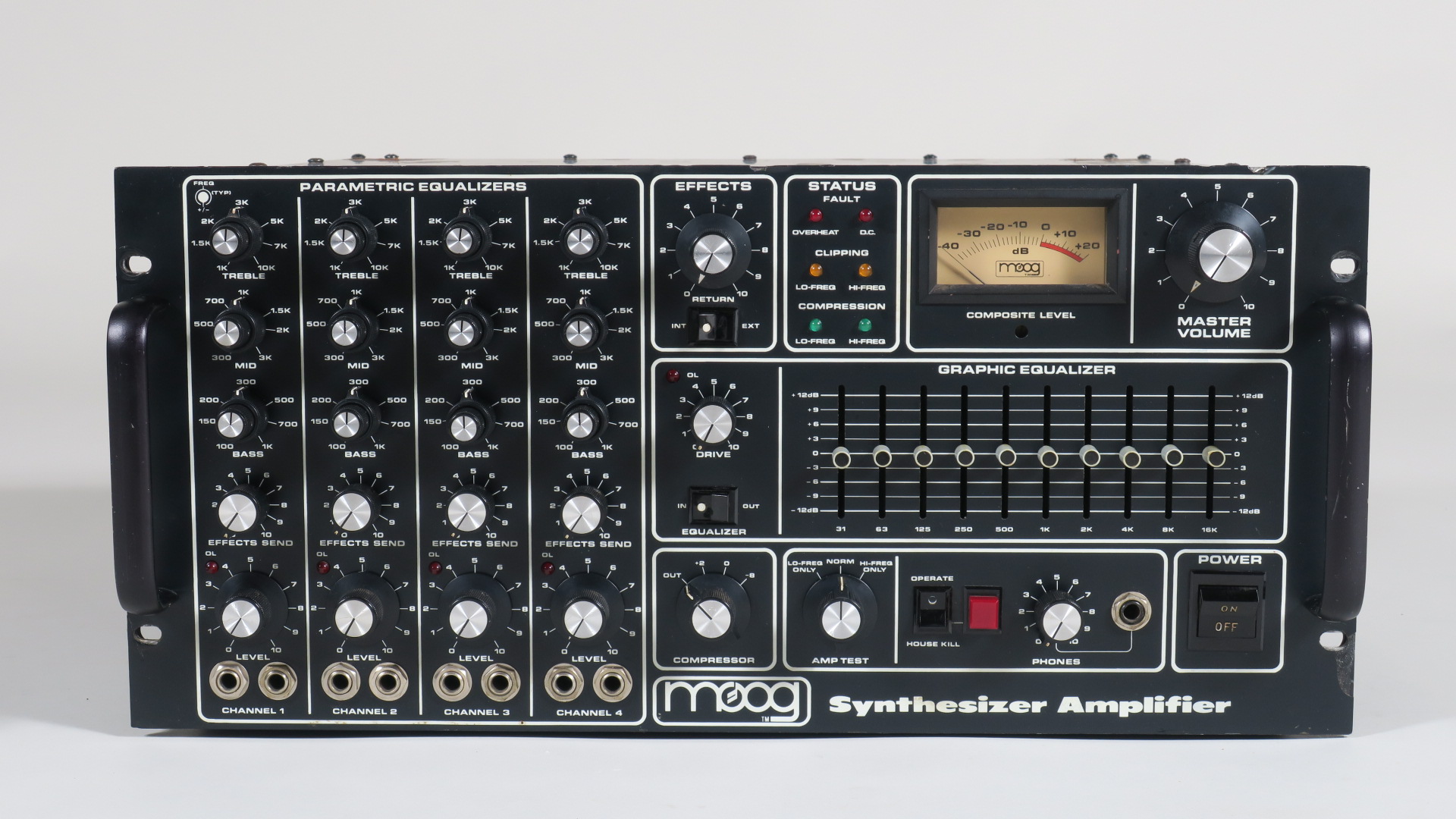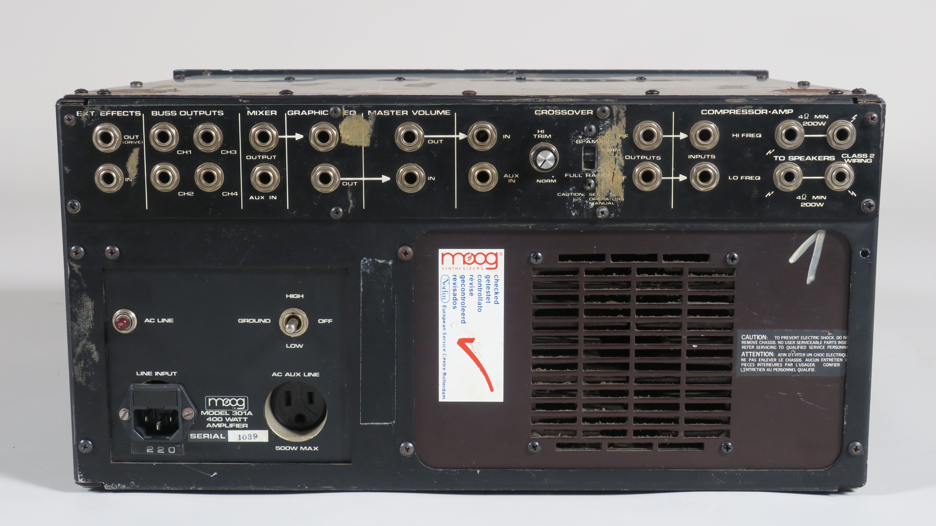 Moog Synthesizer Amplifier Synamp model 301A which has been pro serviced recently (service invoice included). It's a 400W power amplifier with four independent parametric equalizers, a graphic equalizer, four pole active crossover, two compressors - one for each amplifier with indicator lamps and it offers a comprehensive back panel for various patching operations.