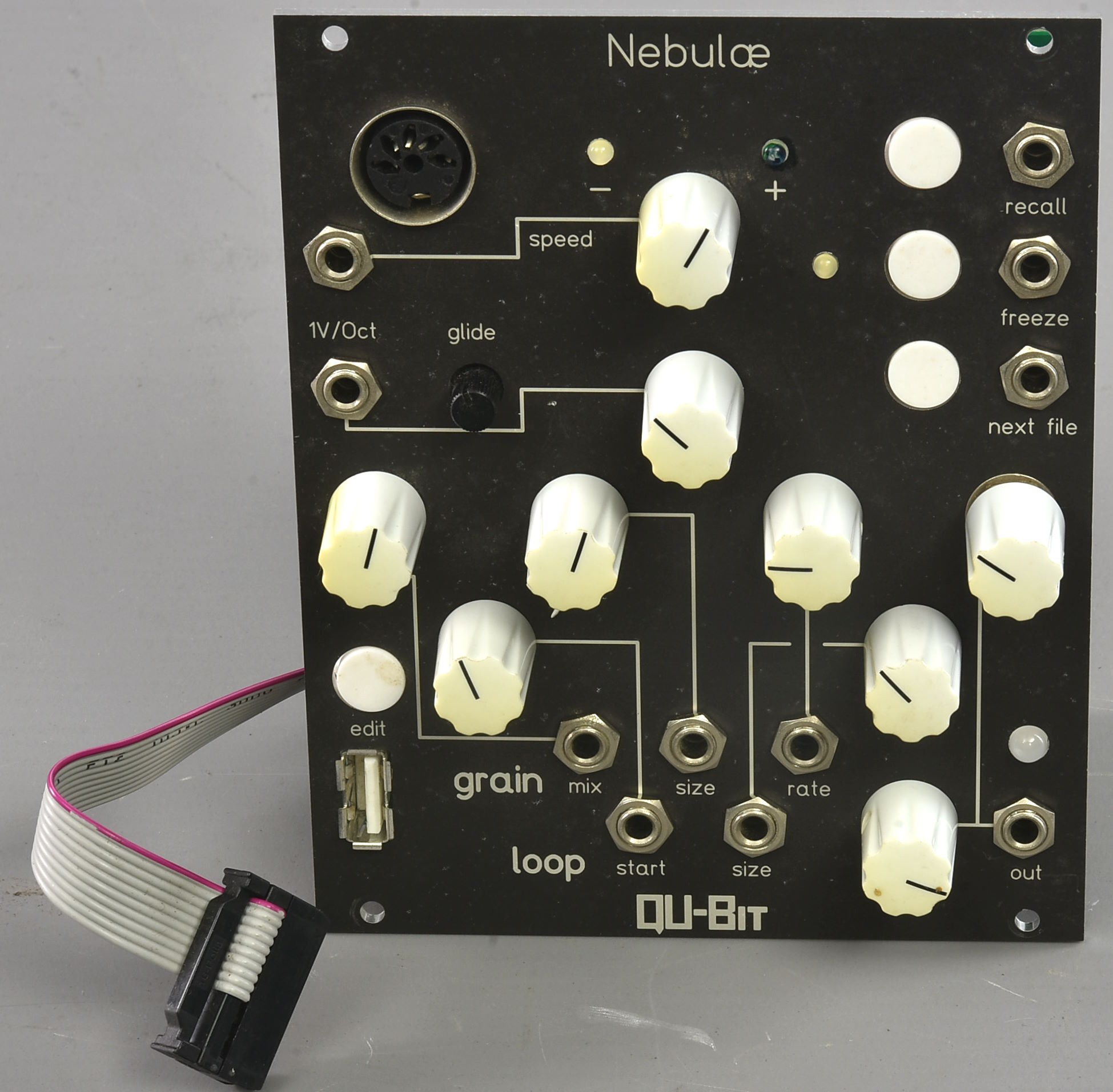 Discontinued granular sample player in excellent condition with ribbon cable but no screws. https://modulargrid.net/e/qu-bit-electronix-nebulae-black-panel