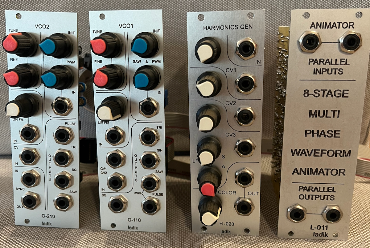 ladik.eu modules lot: O-110 VCO1, O-210 VCO2, H-020 Harmonics Generator, L-011 8-Stage Multi Phase Waveform Animator |