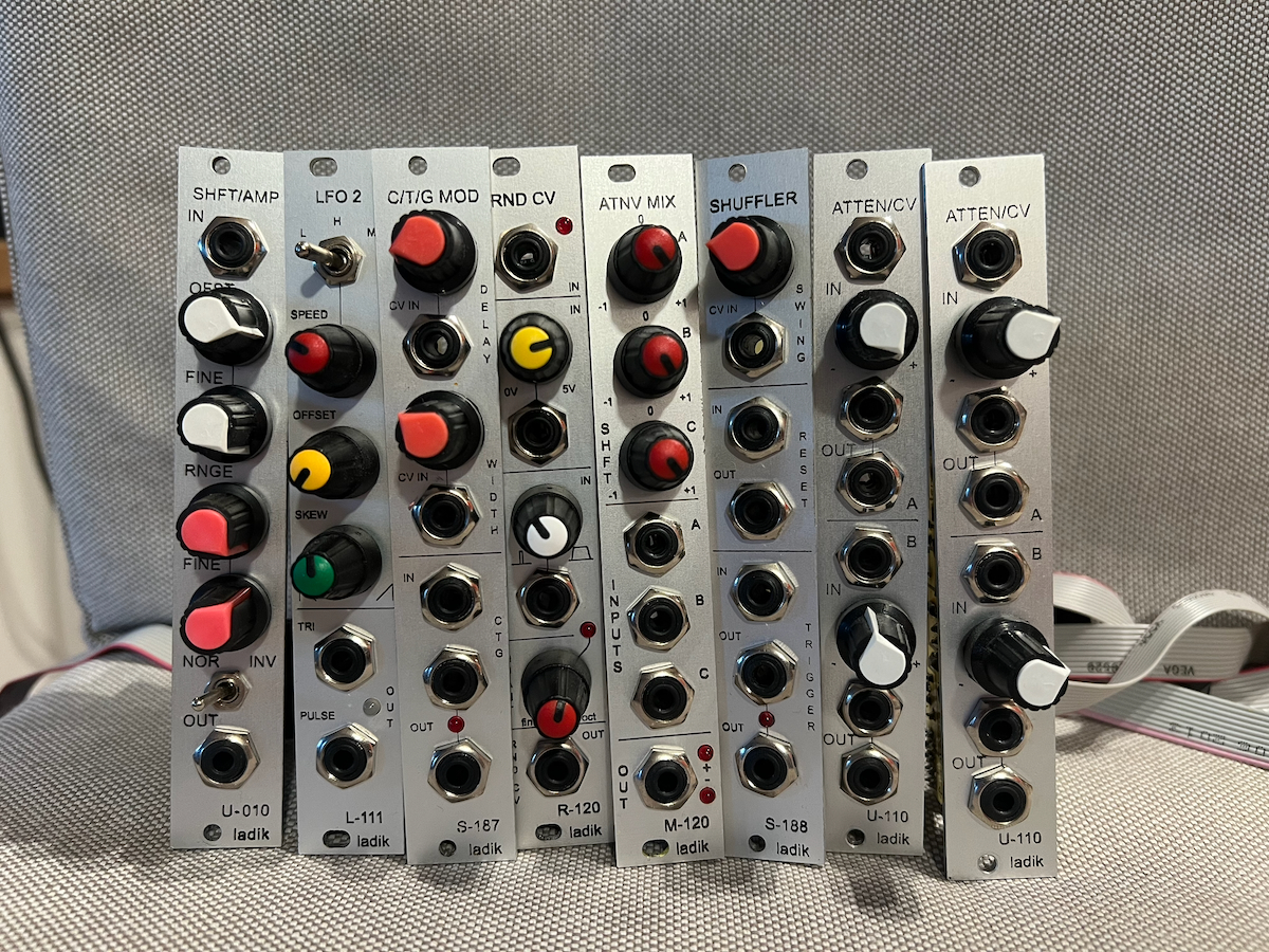 ladik.eu - U-010 CV Amplifier/shifter, L-111 LFO2, S-187 Voltage Controlled Clock/Trig/Gate Modifier, R-120 Random CV Generator, M-120 3-channel attenuverting mixer, S-188 VC Clock Shuffler, 2x U-110 Dual attenuator/CV source |