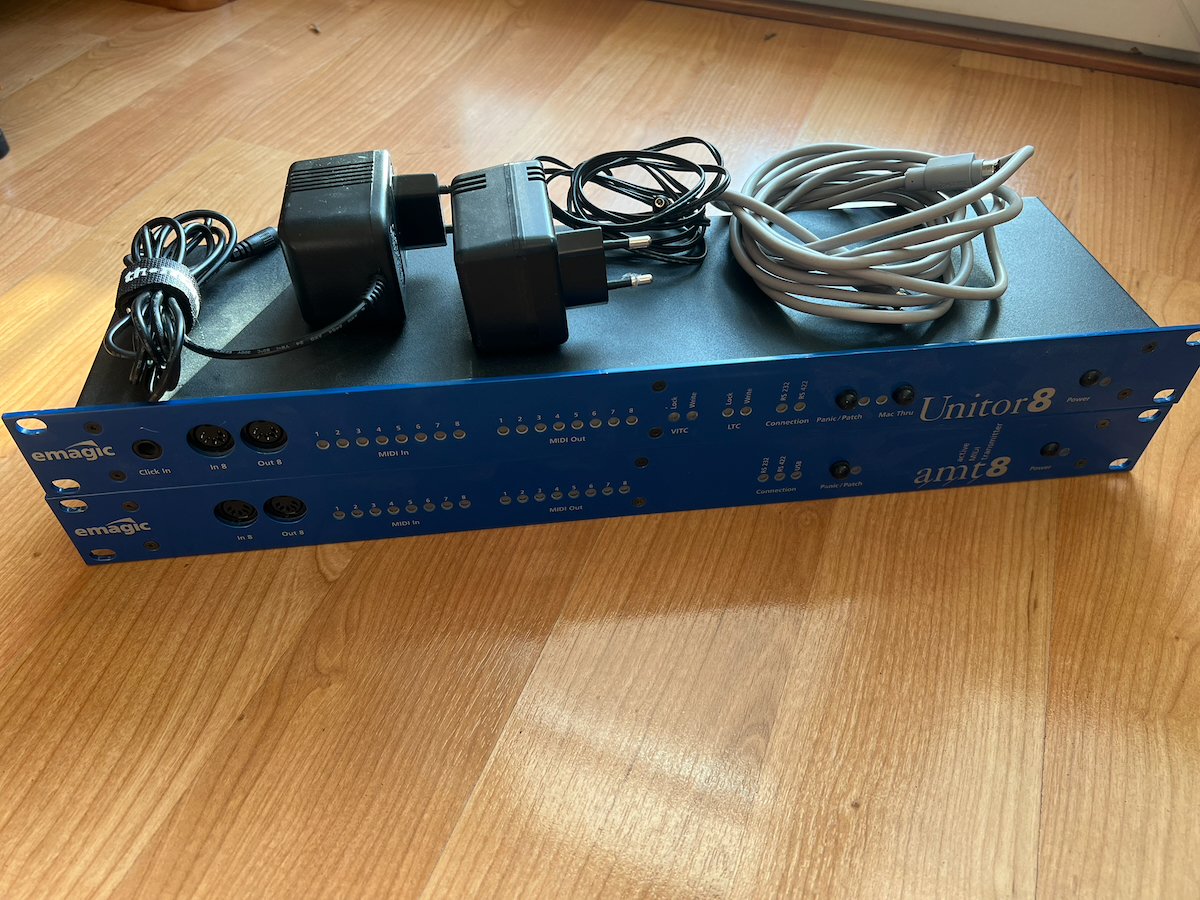 AMT-8 (USB) + Unitor 8 (Serial) 16 MIDI IN/OUT interface network. The first unit is connected to Mac via USB, the next unit is networked with RS232/424 (up to 8 units). Drivers still supported by Apple on actual machines. Cables and PSUs included. |