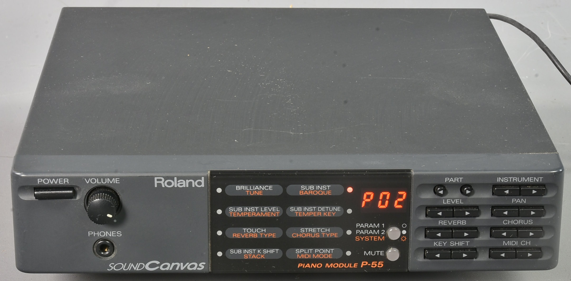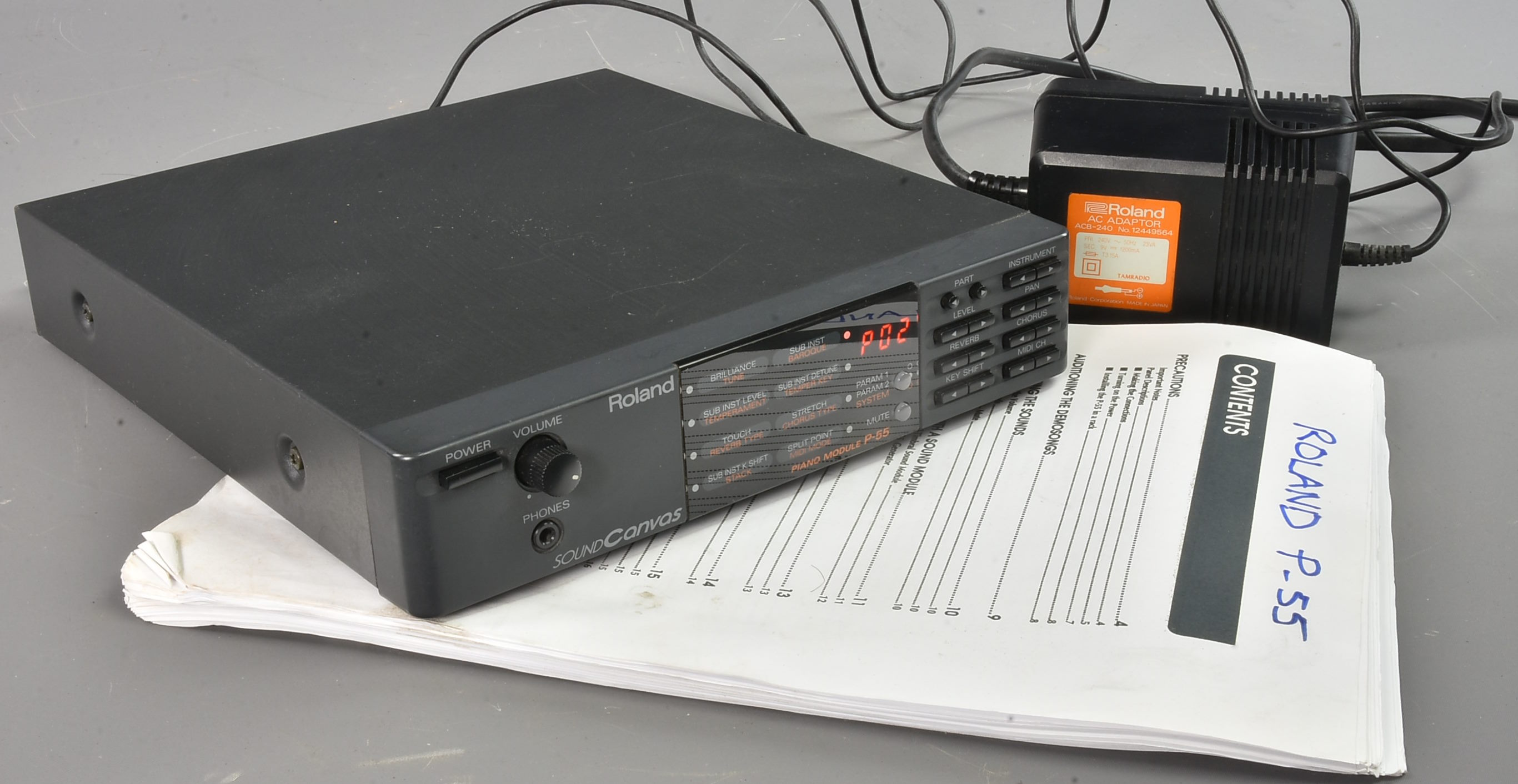 Surprisingly rare Roland piano module from 1993/4 - see the review in Music Technology mag: https://www.muzines.co.uk/articles/roland-p-55/7699 . A serious digital re-creation of real acoustic piano-playing, with things like Damper, Sostenuto and Soft controls - even half pedalling. Plus stretch tuning, and six alternative tunings. Some great sounds - the harpsichord from the C-50, for instance. With an original Roland UK power supply, and a copy manual. Packing 6GBP.