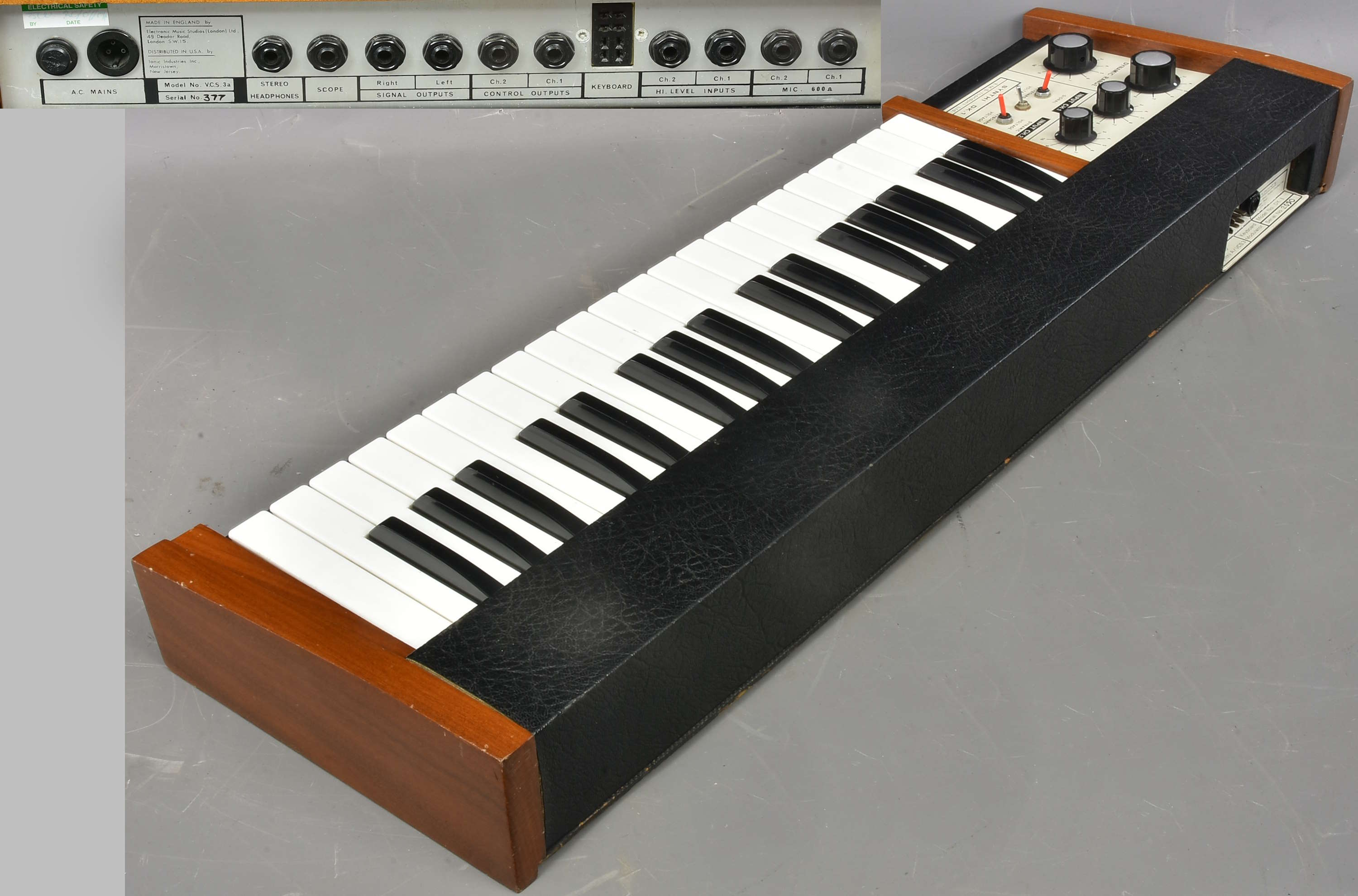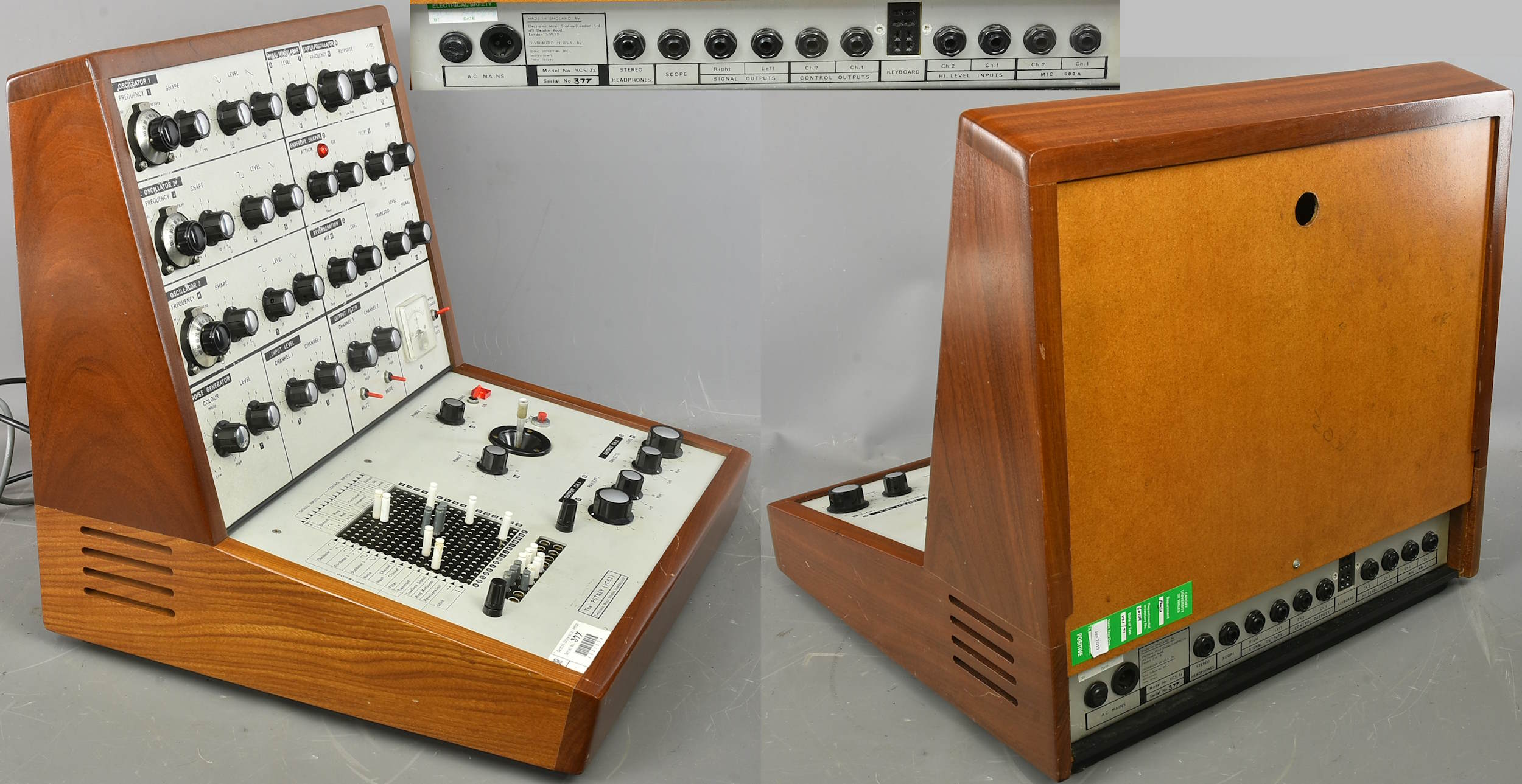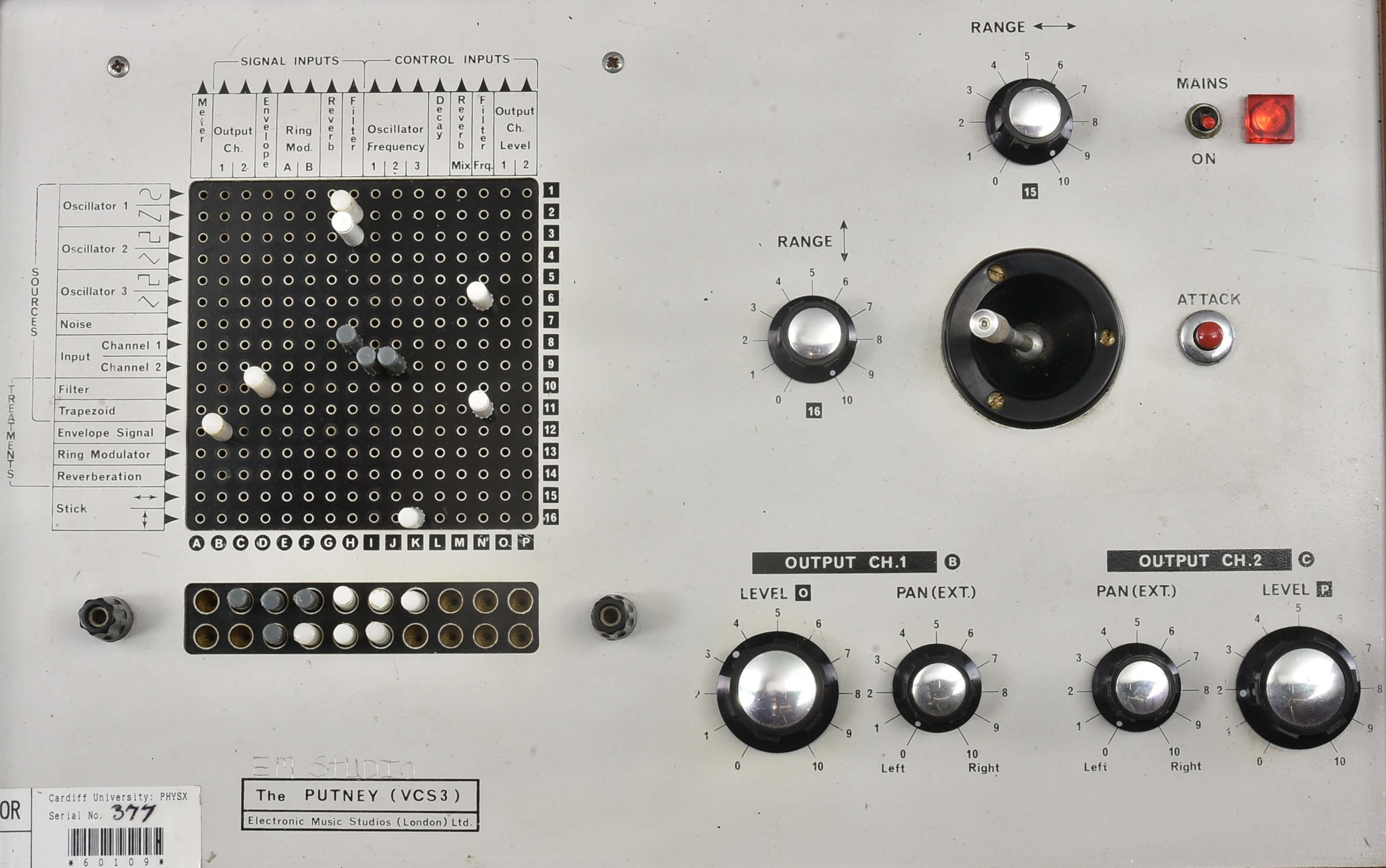 This is the second and sadly last Putney / DK.1 combo to come to VEMIA from Cardiff University Electronic Music Studio - one of the first and biggest electronic music studios in the world, with six VCS3s and then a Synthi 100. Another of the VCS3s from the studio is the featured instrument in the Wikipedia article https://upload.wikimedia.org/wikipedia/commons/0/02/EMS_VCS_3.jpg - note the exact same type of security tag and engraving (E M Studio). The Wikipedia one is s/n 143. This Putney / VCS3 is s/n 377. The DK.1 is s/n 2090. Cosmetic condition is very good for things that are over 50 years old. There is considerable wear to the top panel silk-screening, and a few minor marks in the woodwork, but otherwise everything is lovely. The silk-screening around the matrix is in excellent condition - much better than average - and the matrix itself is very good.