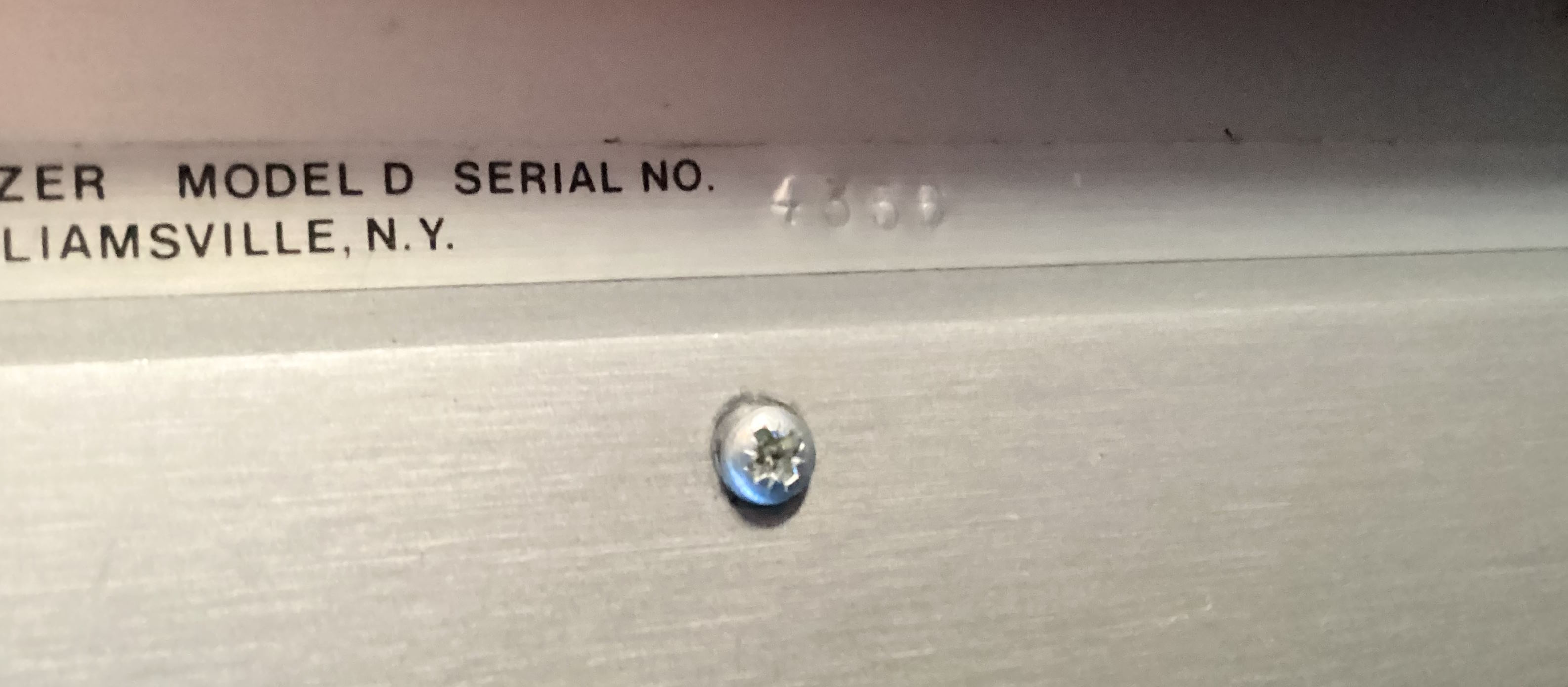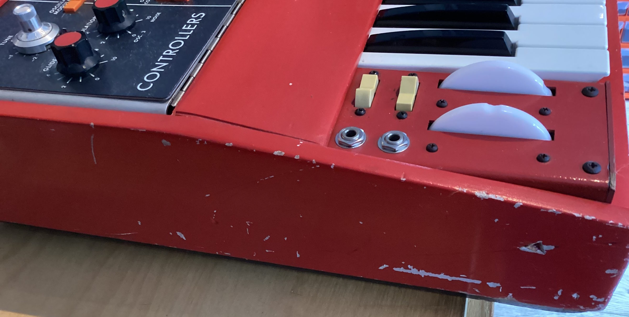 This minimoog has been recently serviced and plays very well. It has a Kenton MIDI conversion which allows it to be played over MIDI. The top panel is in good condition but the case has quite a few knocks, especially on the left side - see the photos. The origin of the red paint and red knobs is unknown but is a professional job. The case was obviously dismantled and painted inside and out. There are two non-standard silver knobs for the master tuning and Osc 2 tuning. These are 'vernier' knobs which allow for very fine tuning. They have 10 turns instead of the original knob's 1 turn. The voltage plaque says 110V but it was converted a long time ago to UK /euro voltage with a UK plug. In response to questions about this, all I can say about the modifications is that they were there when I bought it in around 1990 - I find the fine tuning knobs really useful. I don't have any internal photos but the guy that serviced it said that some circuit boards have been changed, I believe it has the later oscillator boards. VEMIA can collect and pack: 18GBP.