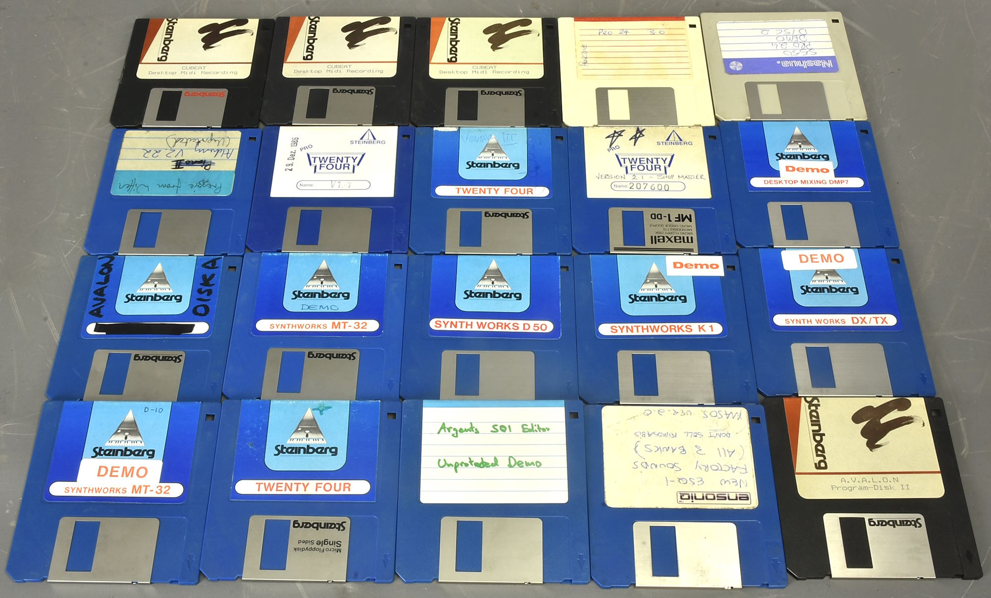 A massive collection of c. 1986-90 software disks believed to have come from the famous Argents music store in London. Virtually all are Steinberg, from the Pro-24 / Cubeat* / Cubase start era - arguably one of the main sources of the revolution in music which spawned all the subsequent in-the-box stuff - especially in Europe. *Cubase was originally going to be called Cubeat - see the three ultra-rare disks included (one close-up in pic 4) but had to be changed for copyright / trademark reasons. All untested, sold as seen, but a potentially great fount of historical / retro material. Packing 3GBP. |