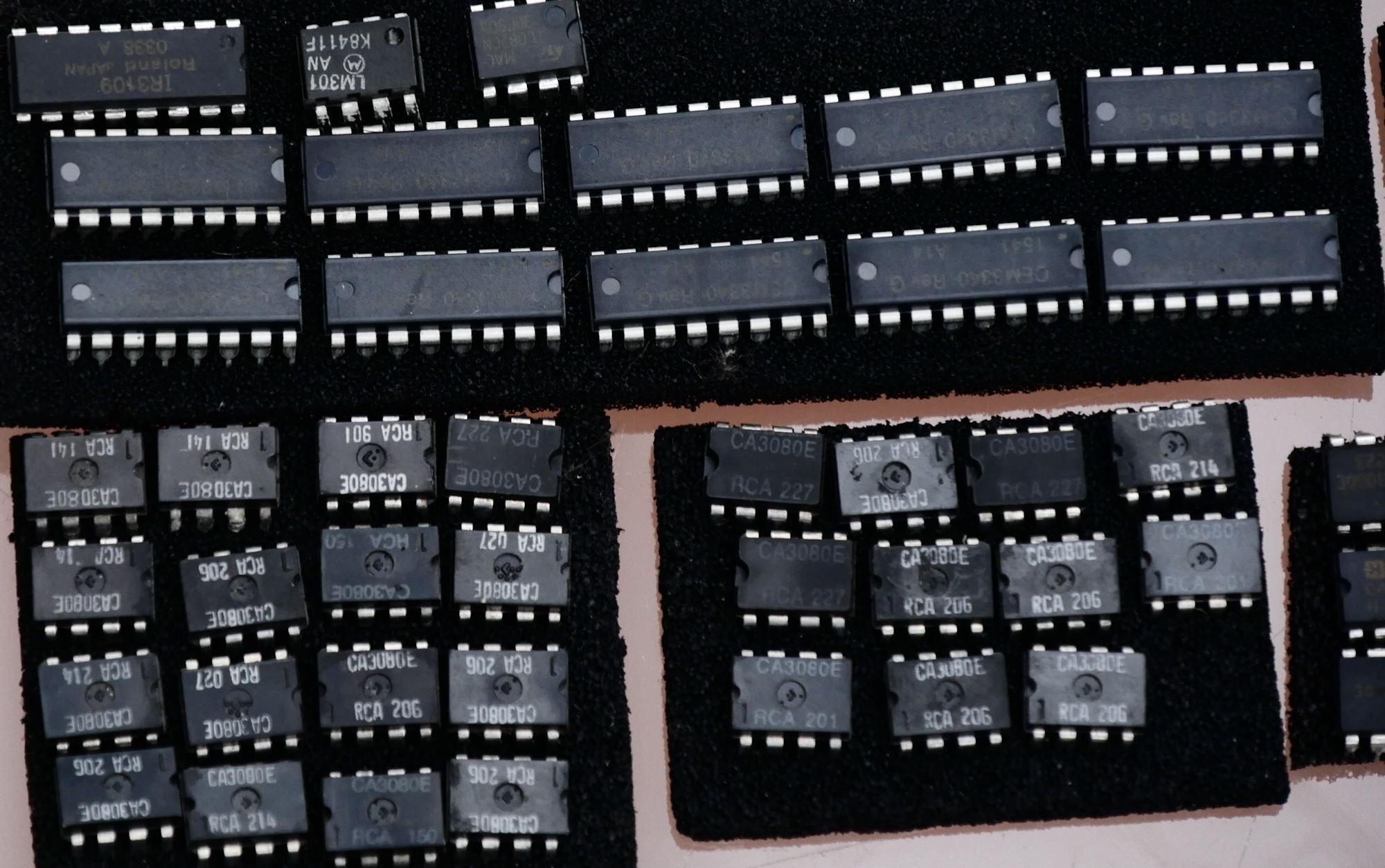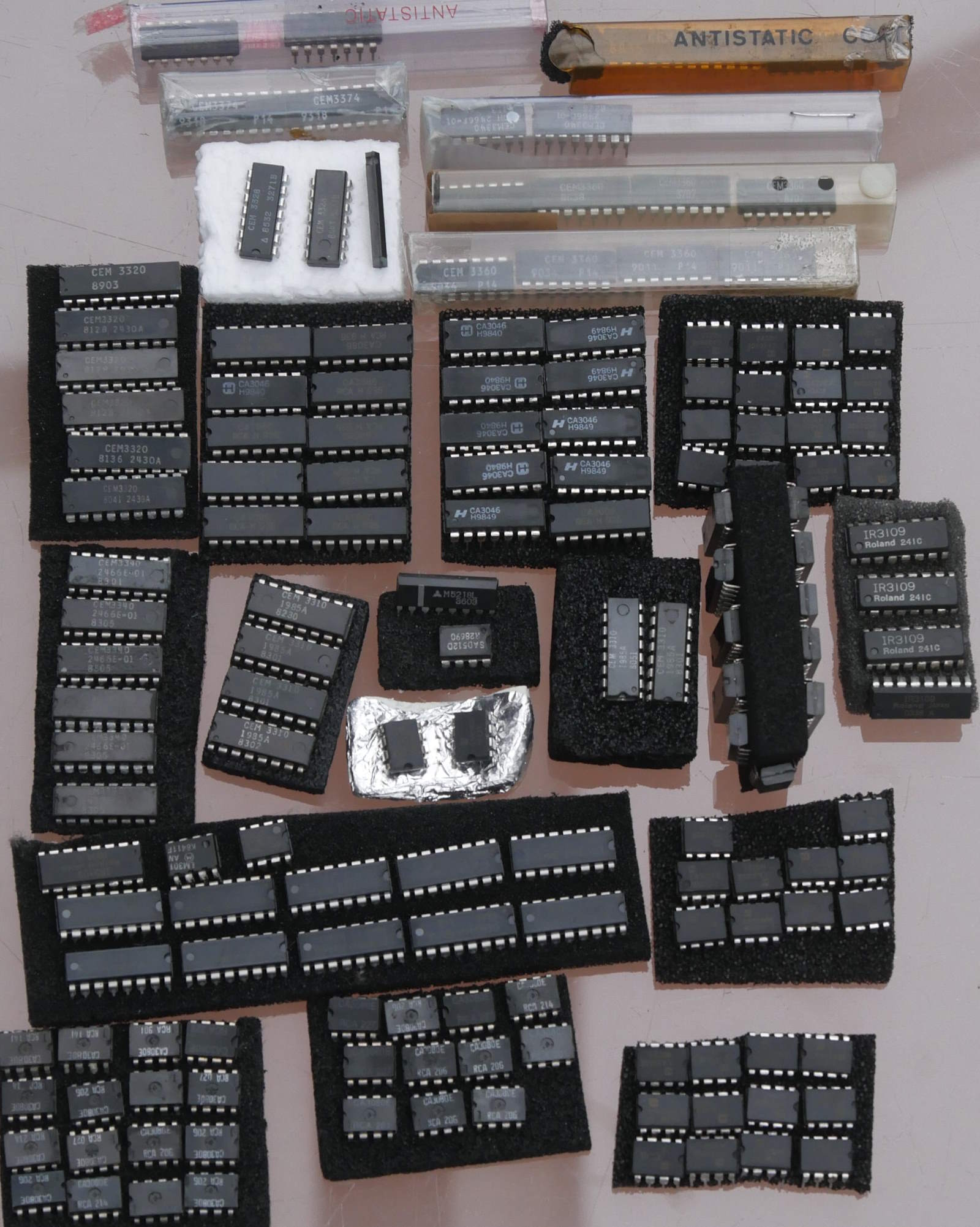 They are in sleeves or (more often) in anti-static foam. We noticed when we were doing photos that some of the anti-static foam is starting to get near the end of its useful life - and at least one chip seemed to have some sticky stuff around its legs. Some chips felt sticky on their tops, too. So the first task will be to re-position them in new foam.