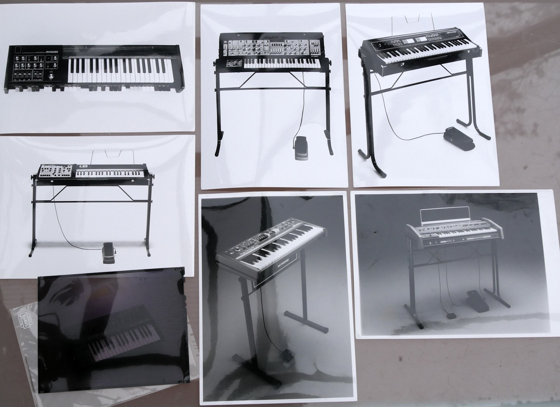 Rare original Roland promo photos believed from around 1979 - 1980. Six black-and-white glossy prints including the SH-5, SH-3 (A?), SH-1000, JP-4, RS-09, RS-202, and a nice transparency of the SH-101. |