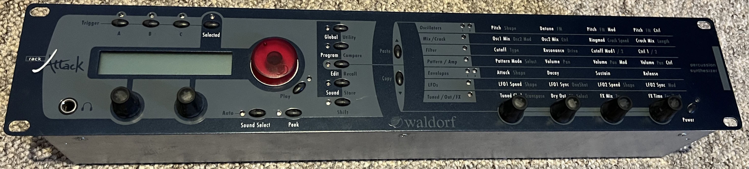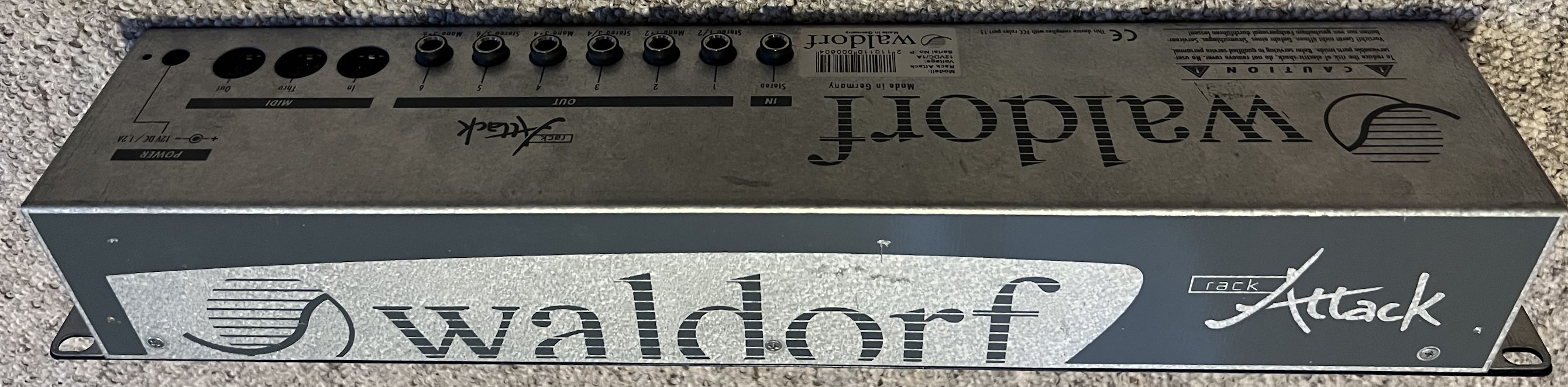 This is one of the rarest of Waldorf products. The Rack Attack is a dedicated percussion synth based on the Micro Q's structure but offering a very different slant https://waldorfmusic.com/legacy-rack-attack/ This example is in very good condition, with just a few superficial marks. check the photos. The backlight is very good - see one of the pics. The external UK PSU has the earth pin removed which might seem a bit alarming, but I asked Waldorf at the time I bought it and it was done in factory apparently! |