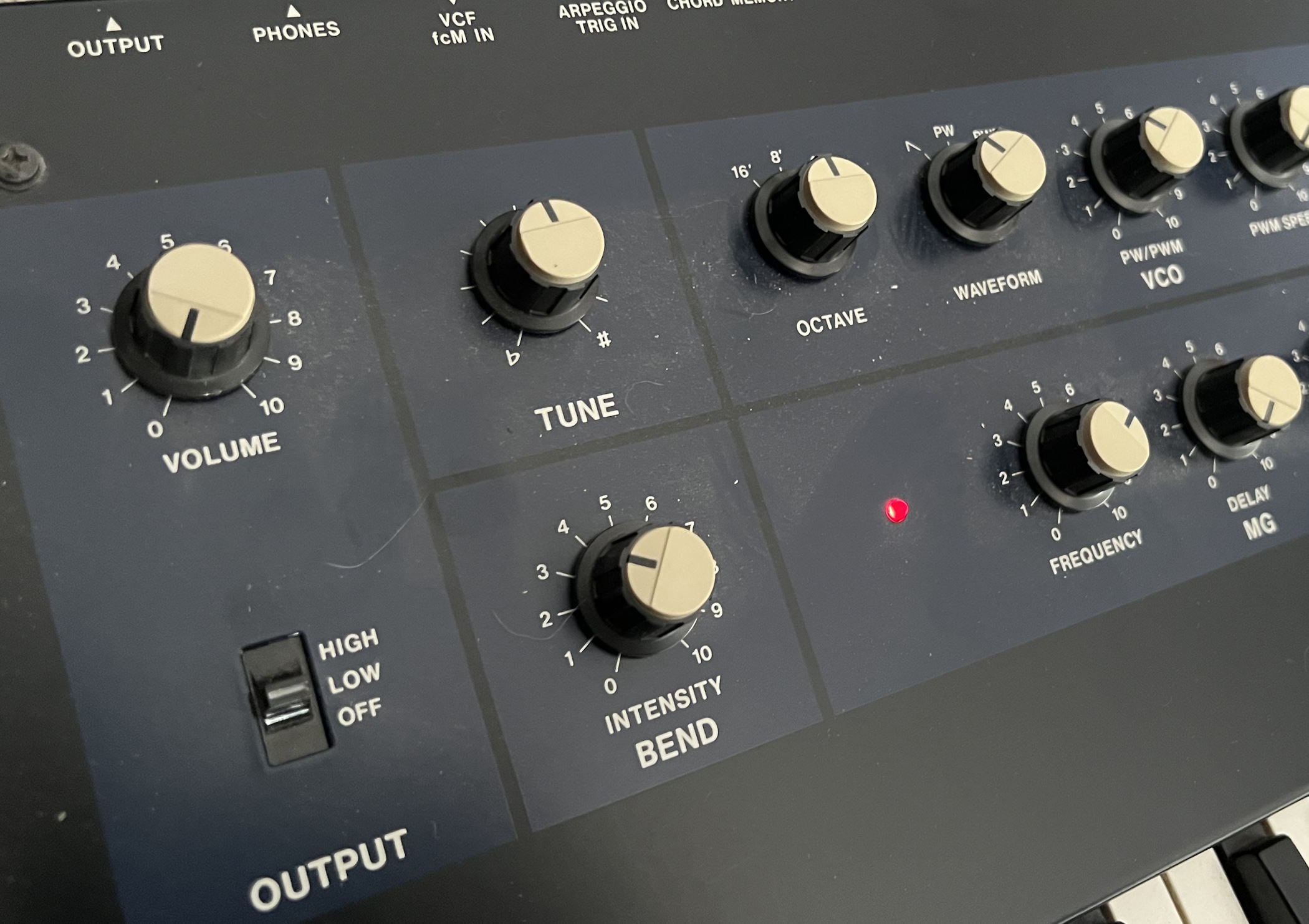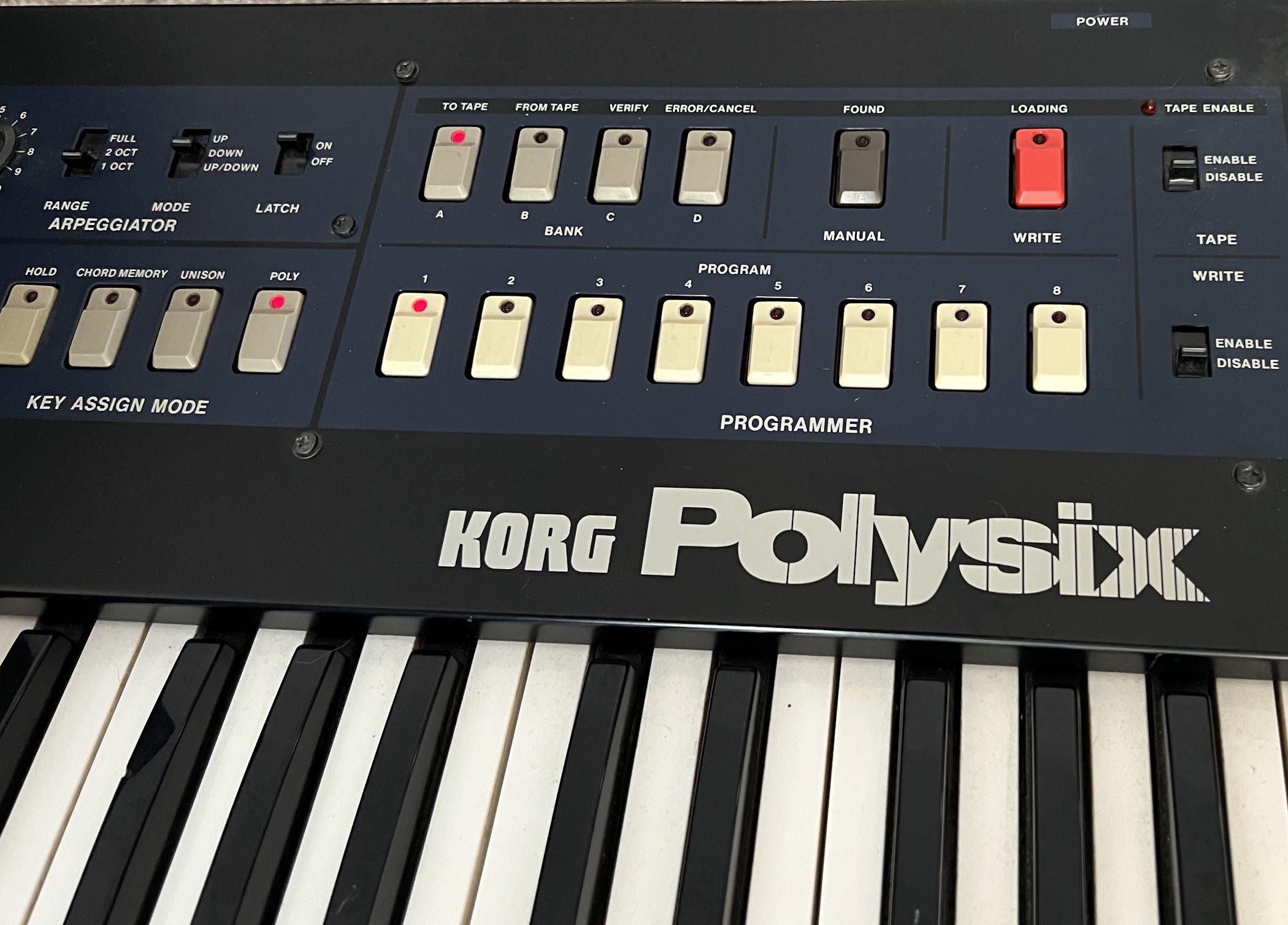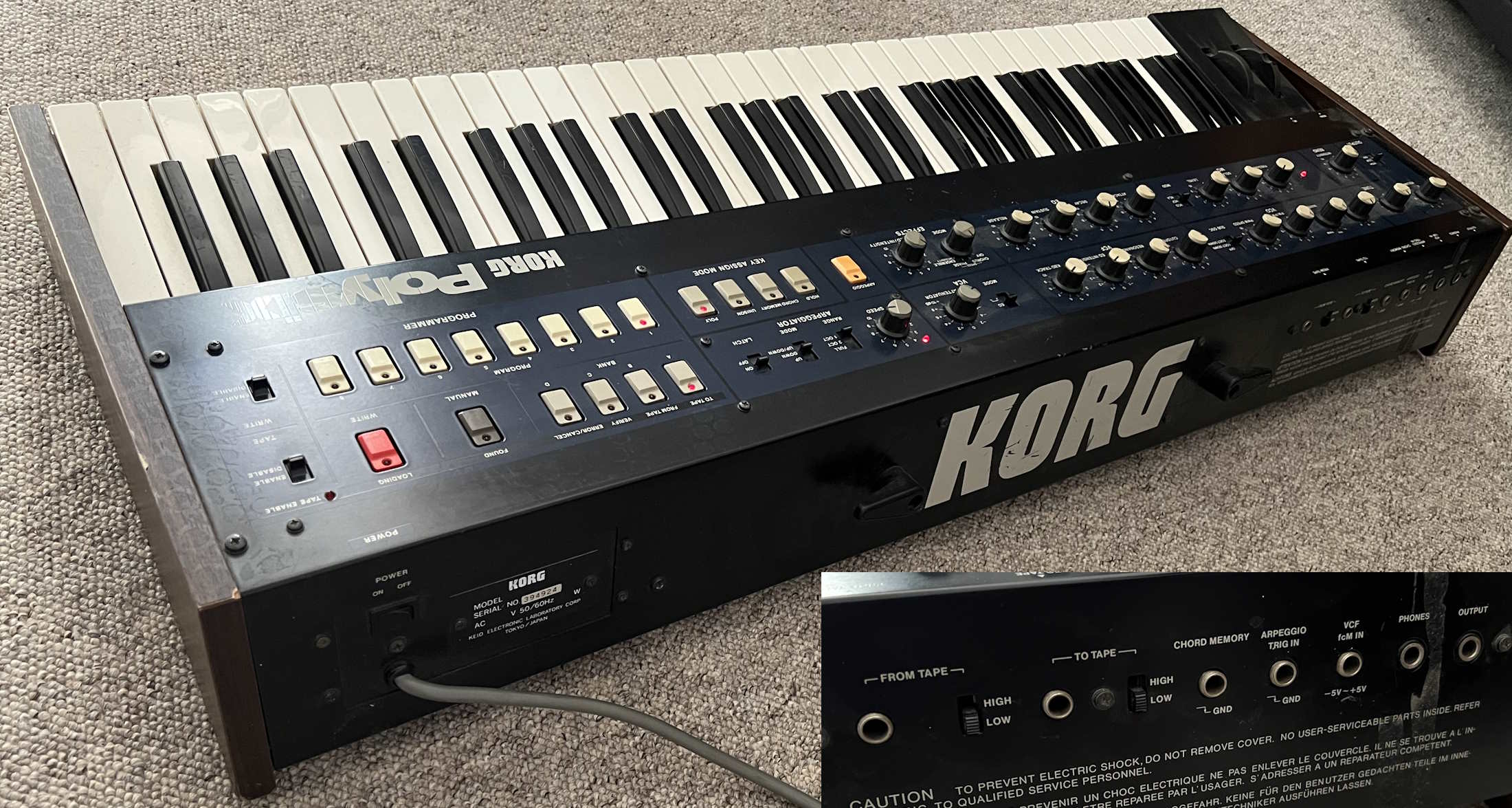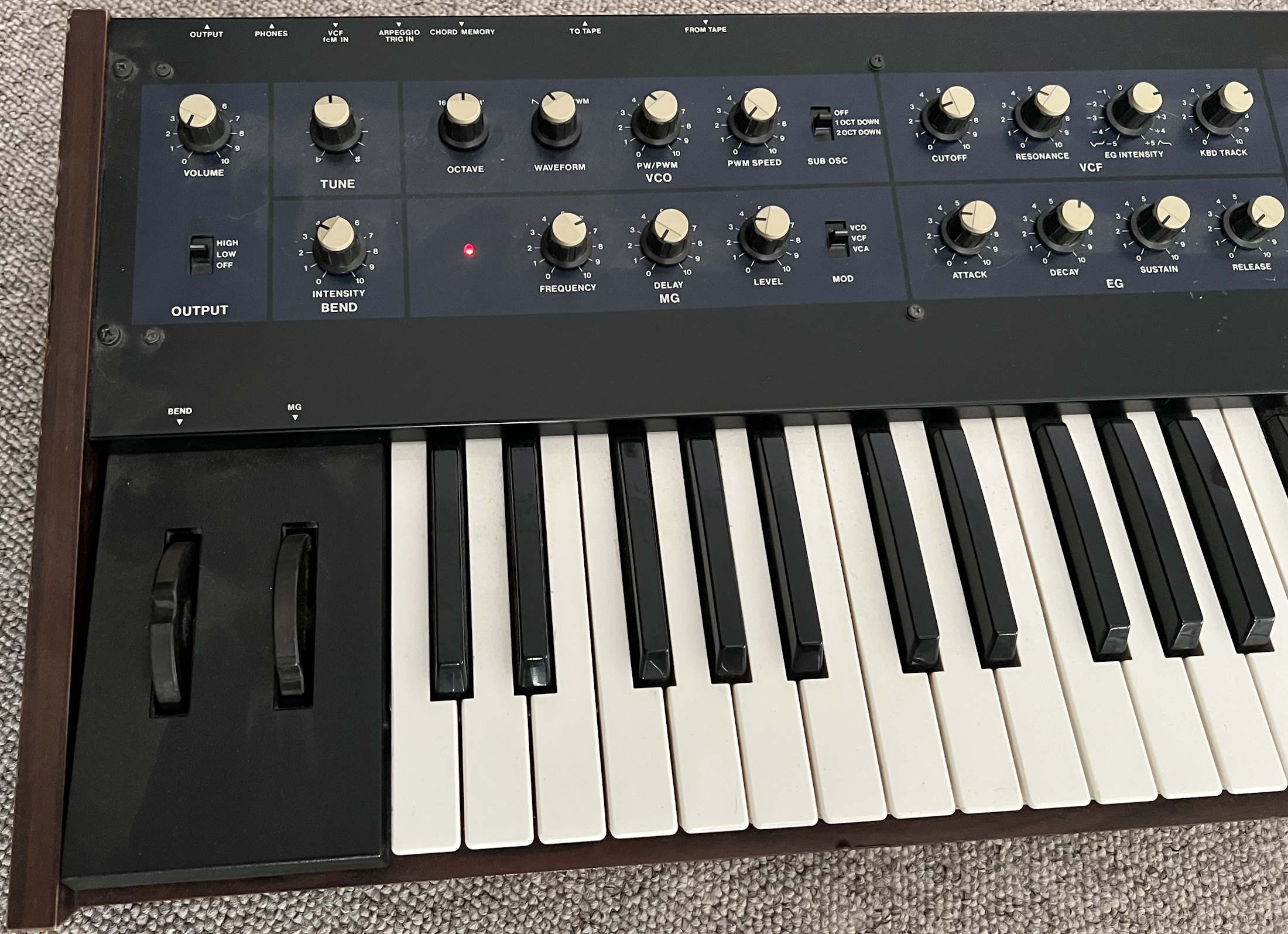 Condition wise it looks vintage, has the usual little chips on the end cheeks of most polysix’s, pots could probably do with cleaning, but keyboard still seems to work fine (Its been fully recoated with a special conductive rubber compound)