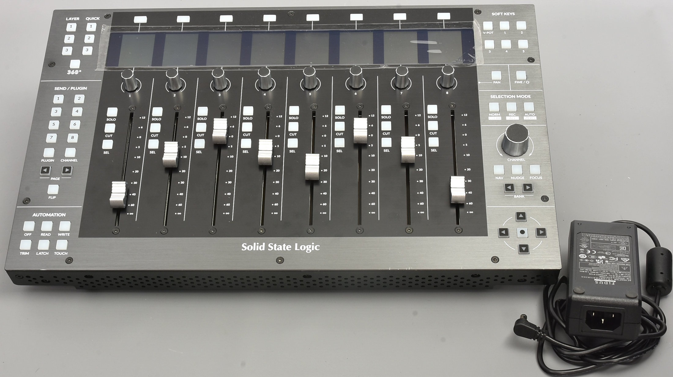 Powerful DAW controller from a famous maker. You should have no trouble registering this with SSL to get the necessary 360 software - they just need the serial number, we think. (For that reason we've greyed out some digits on the photo). In very good condition, not very much used - still with the plastic over the LCD screens). External power supply included with standard IEC mains socket - just supply your own lead. Packing 6GBP. |