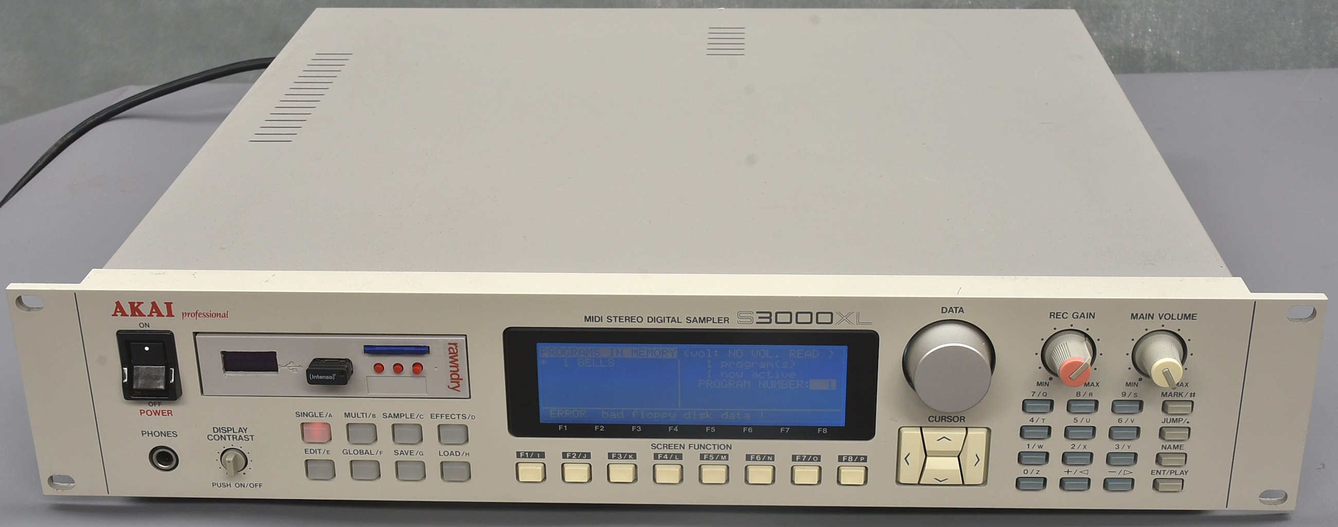 Potentially great 90s sampler, with Rawndry card reader replacing the disk drive. The display is well readable but would look better with a bright new replacement. Unfortunately the display was reading 'Bad floppy disk data' when we took the photos. So sold as seen unless we can solve that. Very good cosmetic condition. Packing 12GBP. |