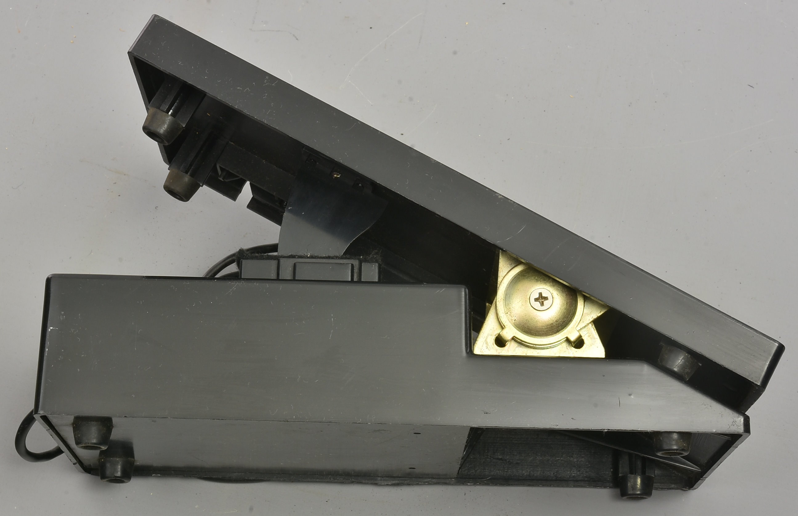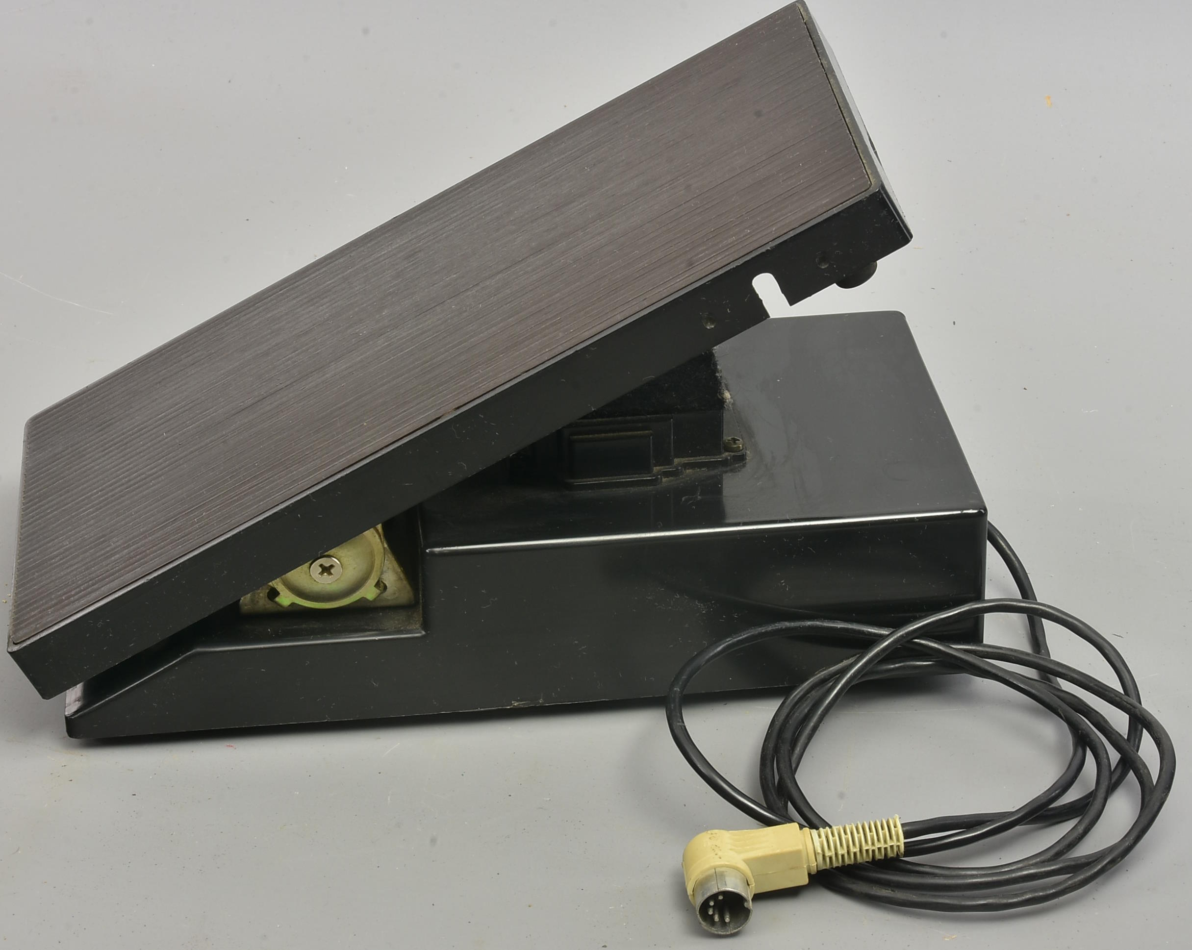 Unknown make of volume pedal, with a vintage 5-pin DIN lead, and what looks like a housing for a side-mounted switch which is not fitted. The construction looks very solid and well-designed. Because of what looks like a light-proof section to the front of the pedal, we guess this is an opto-design, for smooth noise-free response and long life. But sold as seen unless we have time & means to test it. Packing 3GBP. |