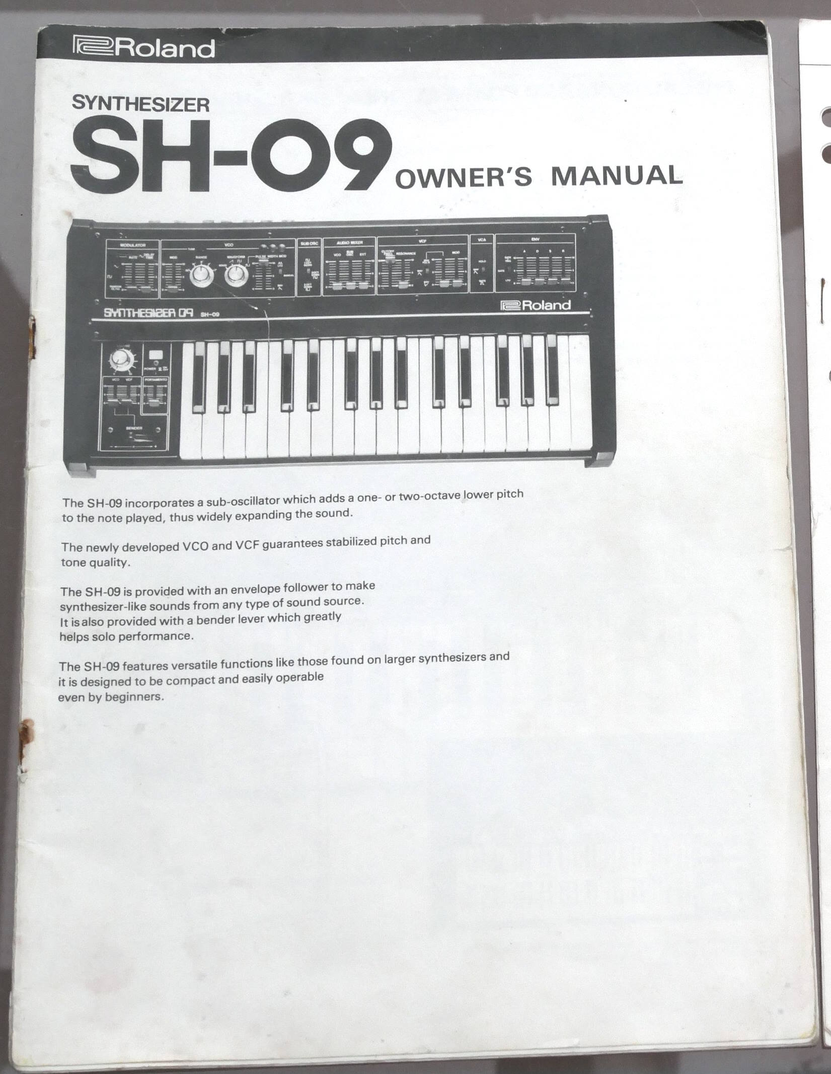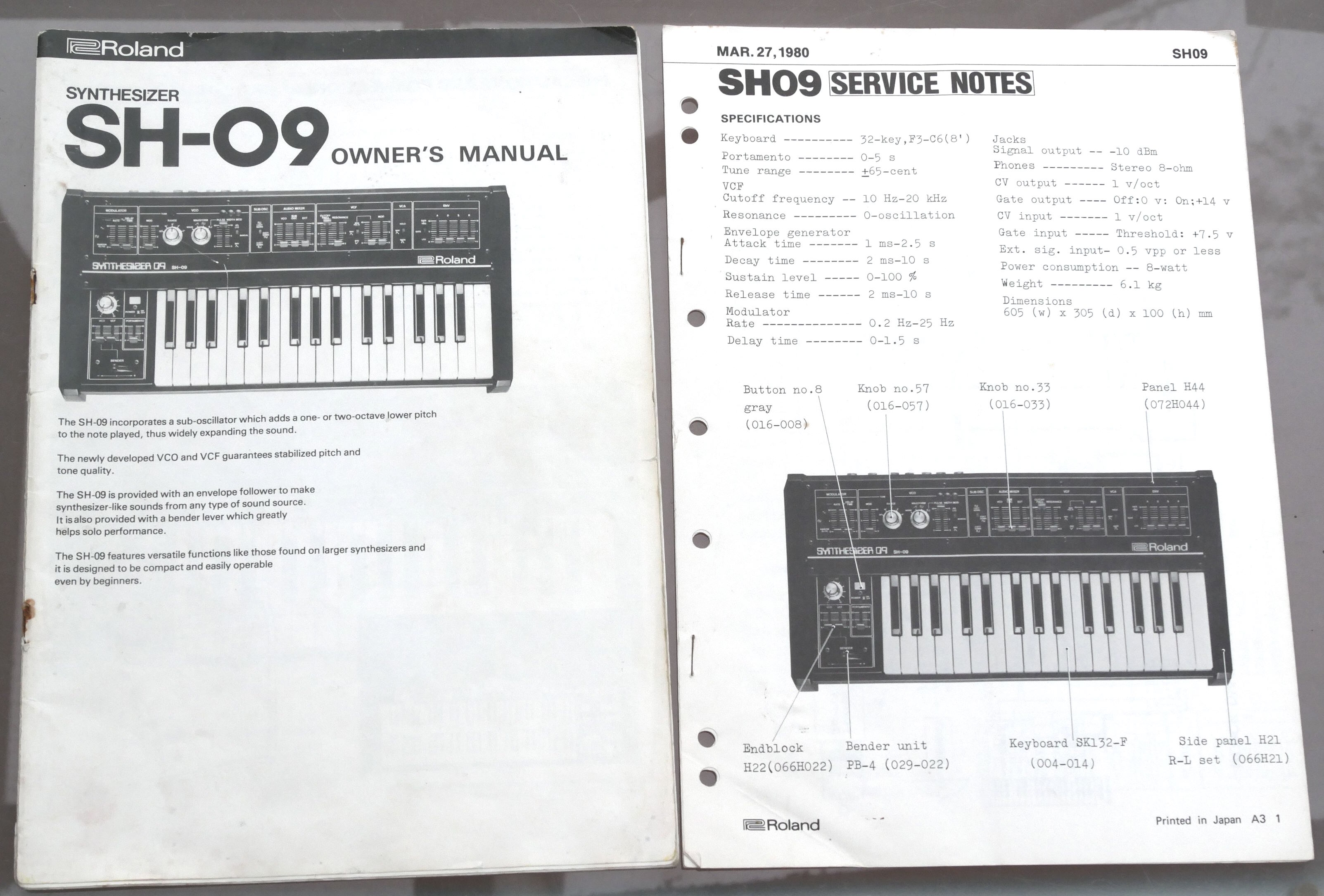 Original user manual and service notes for the SH-09. The user manual is in 6/10 cosmetic condition - solid and complete, but with some rust on the staples, a small tear at the bottom of the cover's spine and notes in pen around all the sample sound settings - and user settings filled in. The service notes are still stapled, with all the foldouts excellent - at least very good cosmetically if not near mint. |